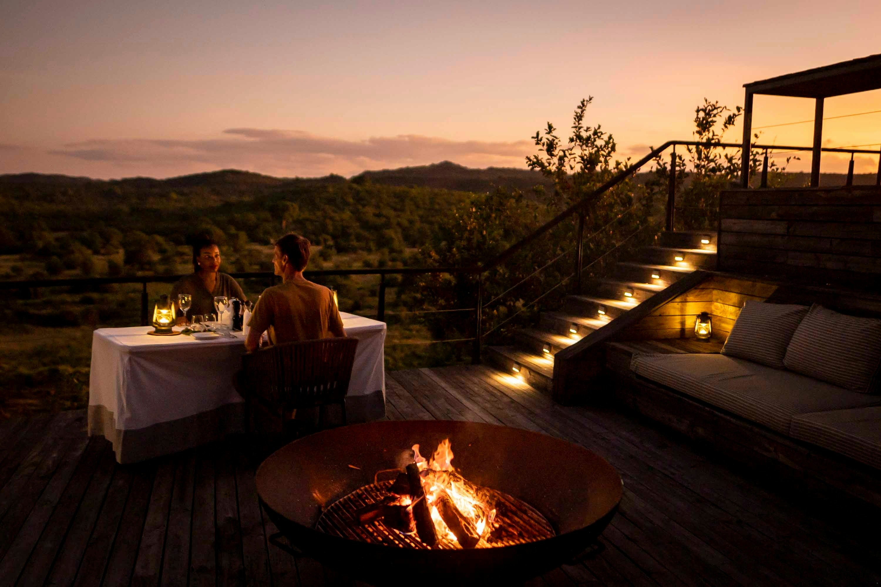 Die lodge bied verskeie eetopsies. Ontbyt en middagete word in die hoofgebou se eetarea met uitsigte oor die Luvuvhu-riviervallei bedien. Middagete kan ook as 'n piekniek op safari bedien word, maar is op versoek by inklok beskikbaar. Gaste kan ook middagete onder die kremetartbome langs die rivieroewer geniet. Aandete word in die binnehof onder die sterre of op die dek by die swembad bedien.