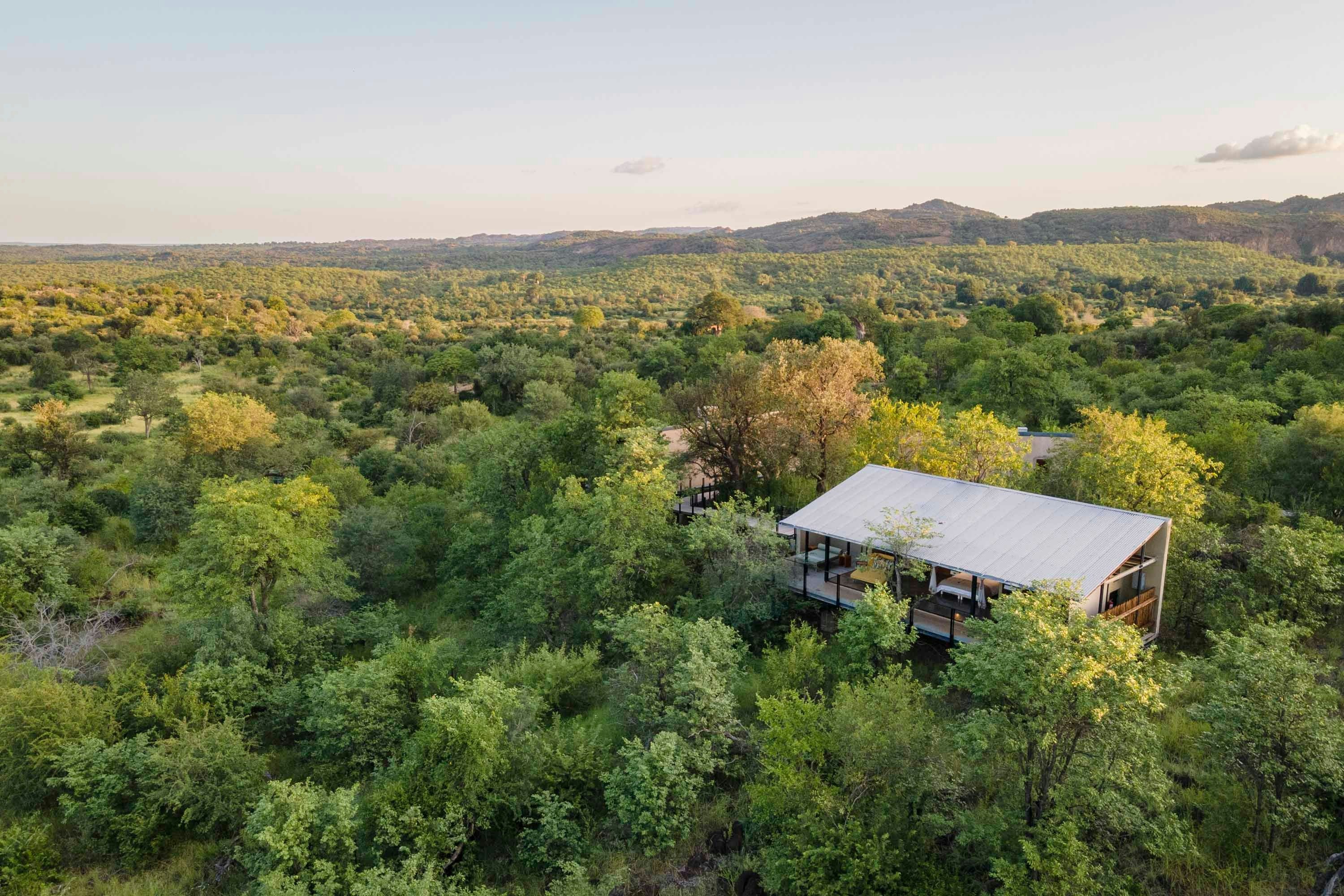 Die privaat areas word deur die sentrale lodge via 'n 500 m-houtpaadjie verbind wat tussen die eenhede kronkel. Die lodge het 'n kontemporêre argitektoniese styl, met staal-, beton- en afstandbeheerde skerms, wat almal onbelemmerde uitsigte bied.
