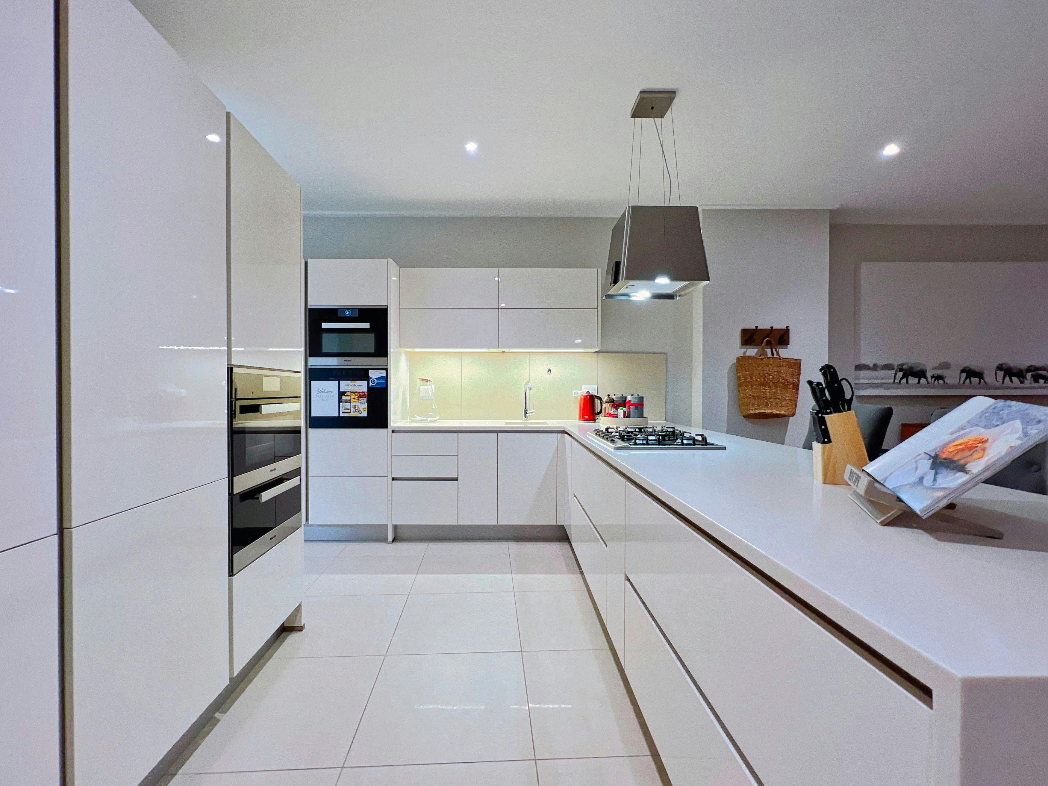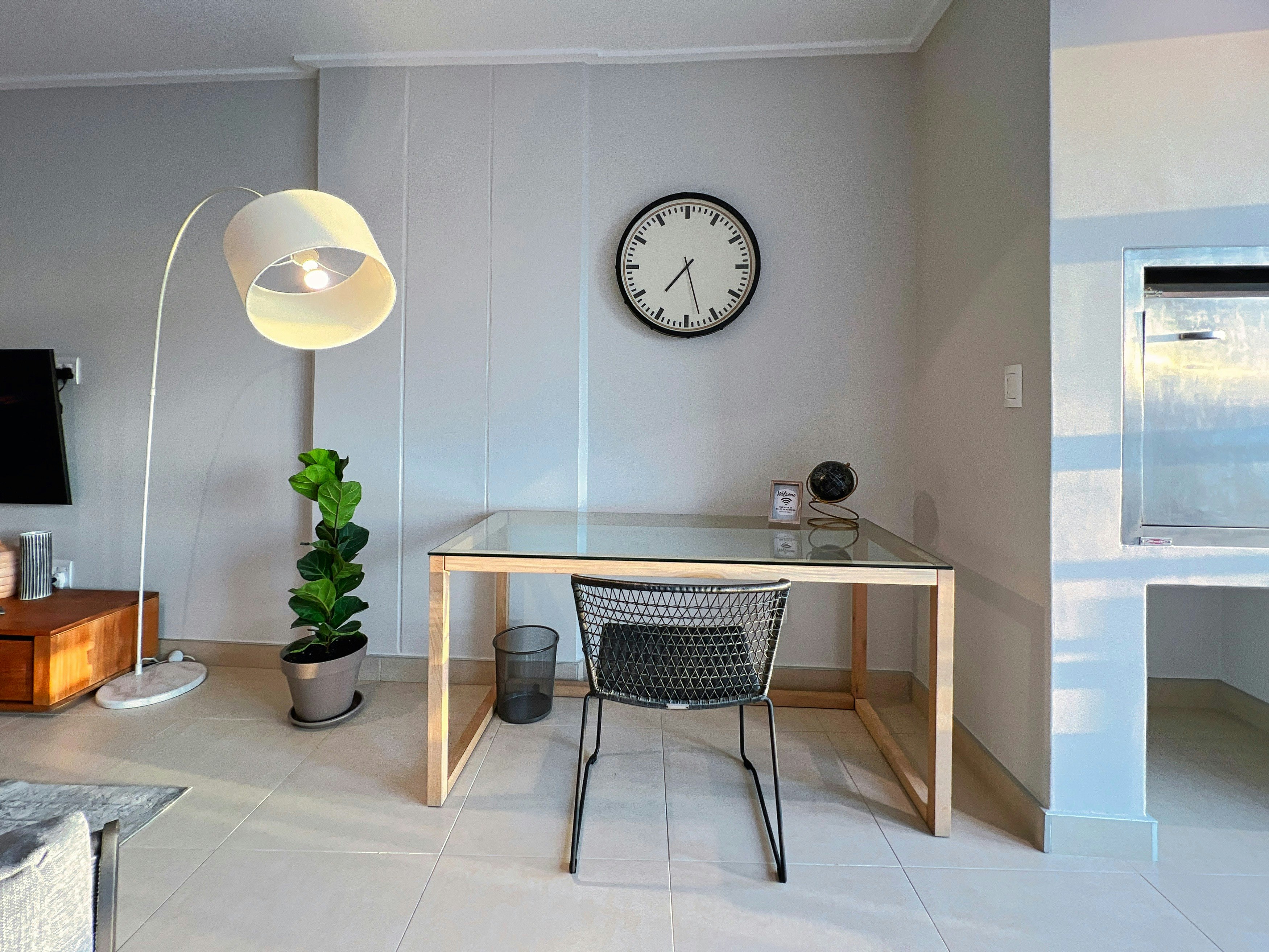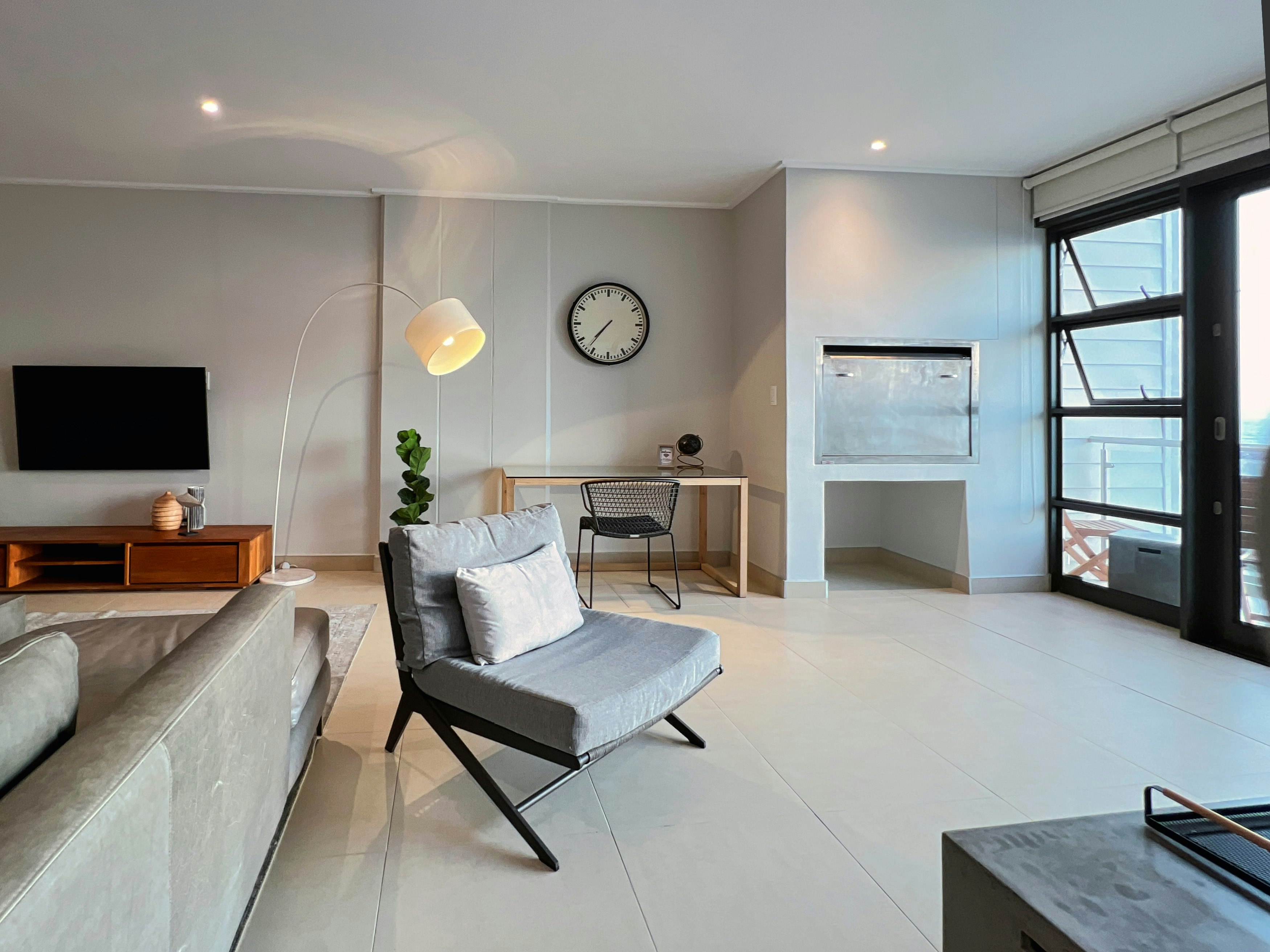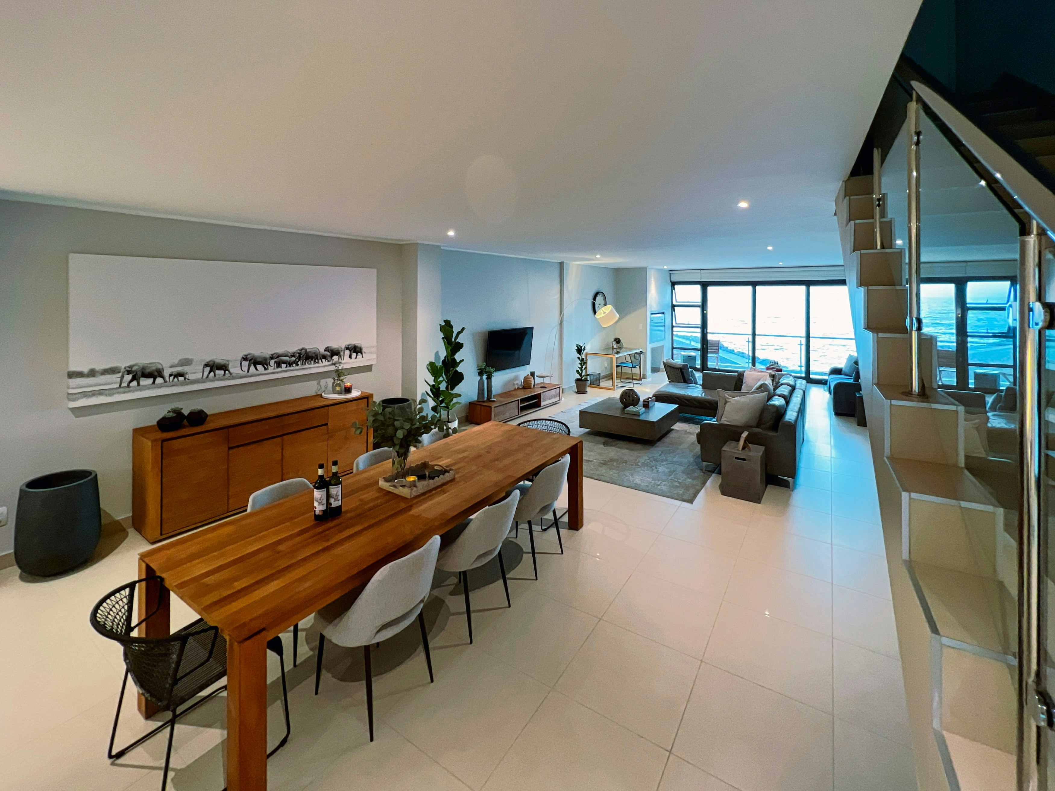 The open-plan living area features a kitchen fully equipped with modern appliances, including a stove, microwave, oven, Nespresso machine, tea and coffee making facilities, cutlery, crockery, and a breakfast bar with stools. A dishwasher, washing machine, and tumble dryer are thoughtfully provided for added convenience. Next to the kitchen is an elegant 8-seater dining table, perfect for family meals or entertaining friends. The lounge area boasts ample comfy couches, a wall-mounted TV, and an indoor braai. Guests can enjoy sundowners on the furnished balcony, taking in the stunning ocean views.
