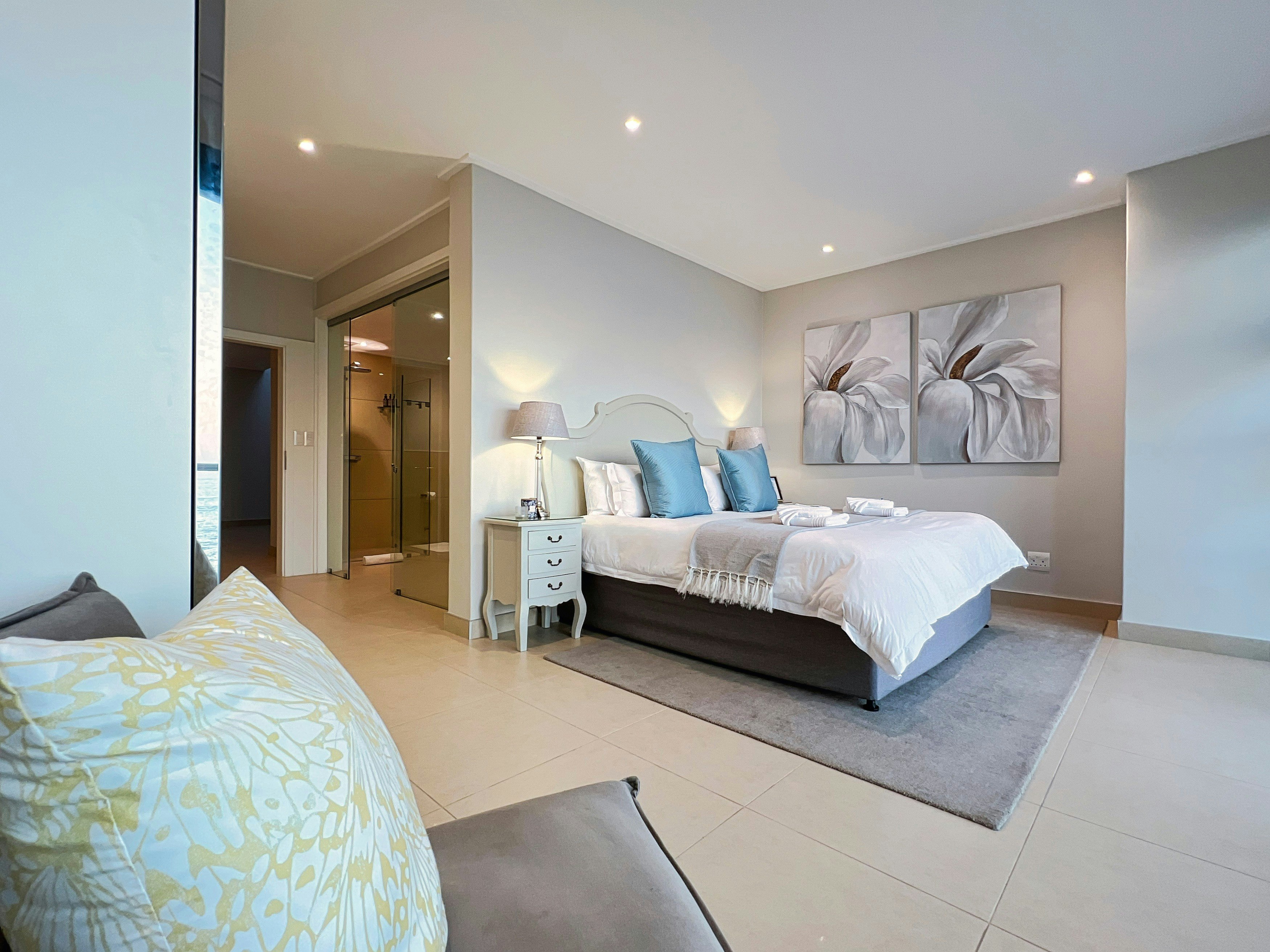 The chic apartment can accommodate 6 guests and comprises 3 bedrooms. The main bedroom is furnished with a double bed and an en-suite bathroom with a shower over bath, washbasin, and toilet. The second and third bedrooms are each fitted with a double bed and have an en-suite bathroom with a shower, washbasin, and toilet. The rooms all boast private balconies offering breathtaking ocean views. Quality linen and bath towels are provided.