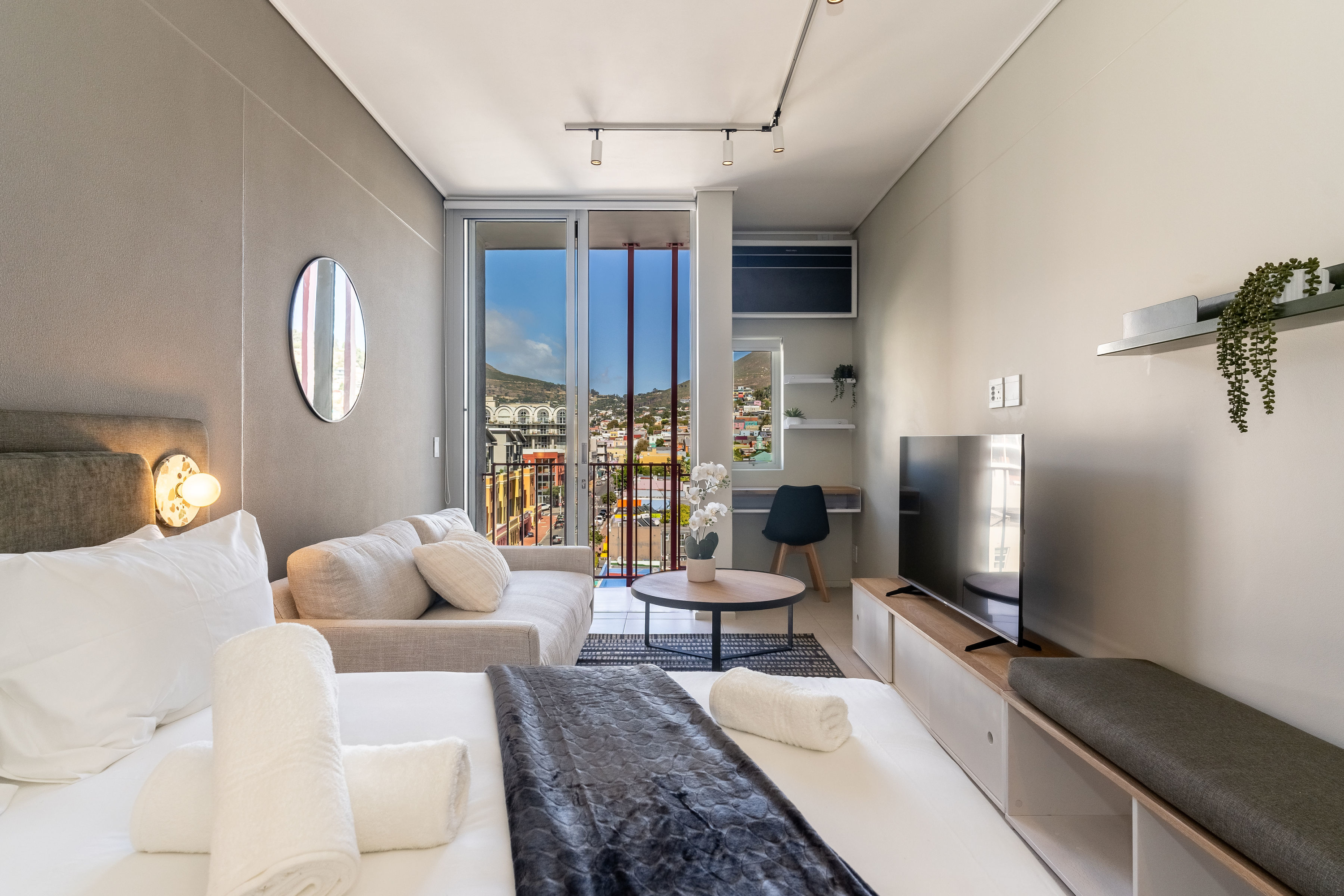 Die woonstel maak oop na 'n Juliet-balkon. Gaste kan die dakswembad met pragtige uitsigte oor die stad en berge geniet, fiks bly in die gimnasium op die perseel, of ontspan by een van die koffiewinkels in die gebou of naby. Met maklike toegang tot die V&A Waterfront, CTICC en openbare vervoer, is dit 'n goeie basis om Kaapstad te verken.