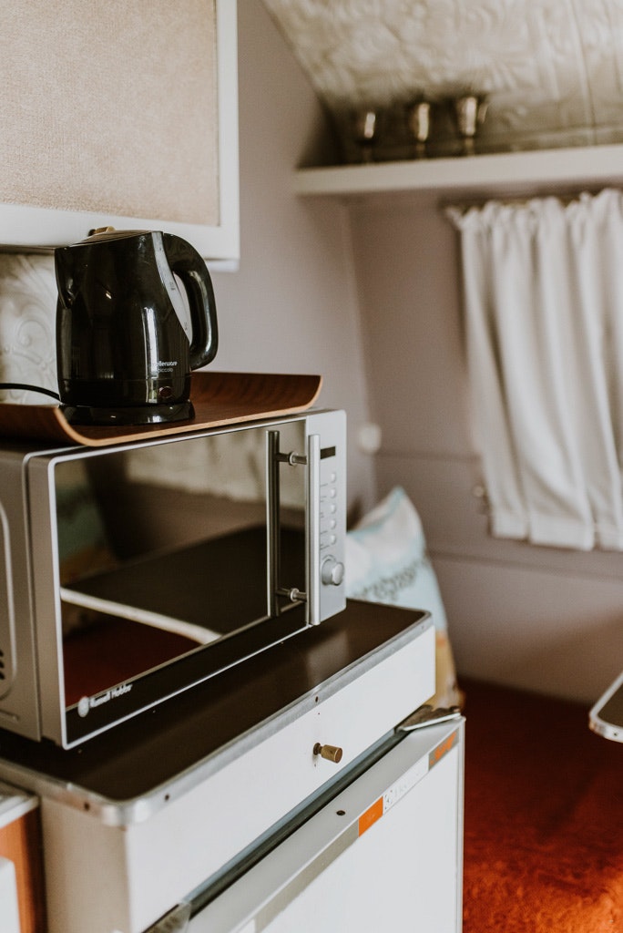 Basiese selfsorg. Yskas, mikrogolfoond en tee- en koffiemaakgeriewe.