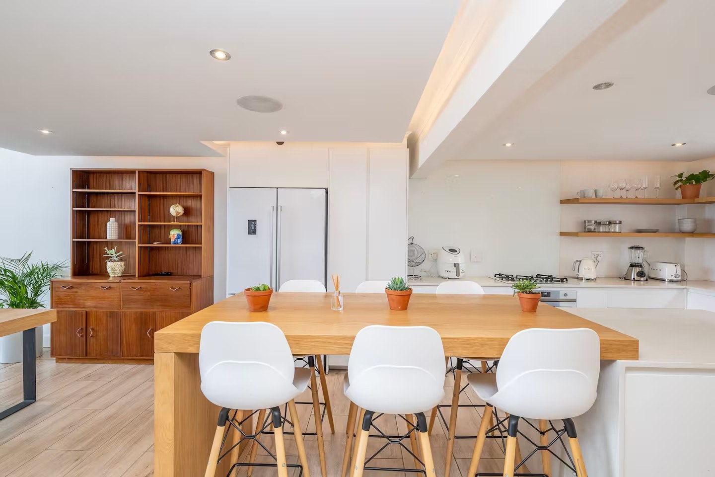 Die oopplan-leefarea beskik oor 'n stylvolle kombuis wat volledig toegerus is met 'n gasstoof, elektriese oond, lugbraaier, mikrogolfoond, yskas-vrieskas, eetgerei en breekware, asook 'n sentrale eiland met stoele. Vanuit hierdie kombuis is 'n eetkamertafel waar gaste hul maaltye saam kan geniet. Die sitkamer het gemaklike sitplek en 'n TV. Toegang tot gratis WiFi is beskikbaar.