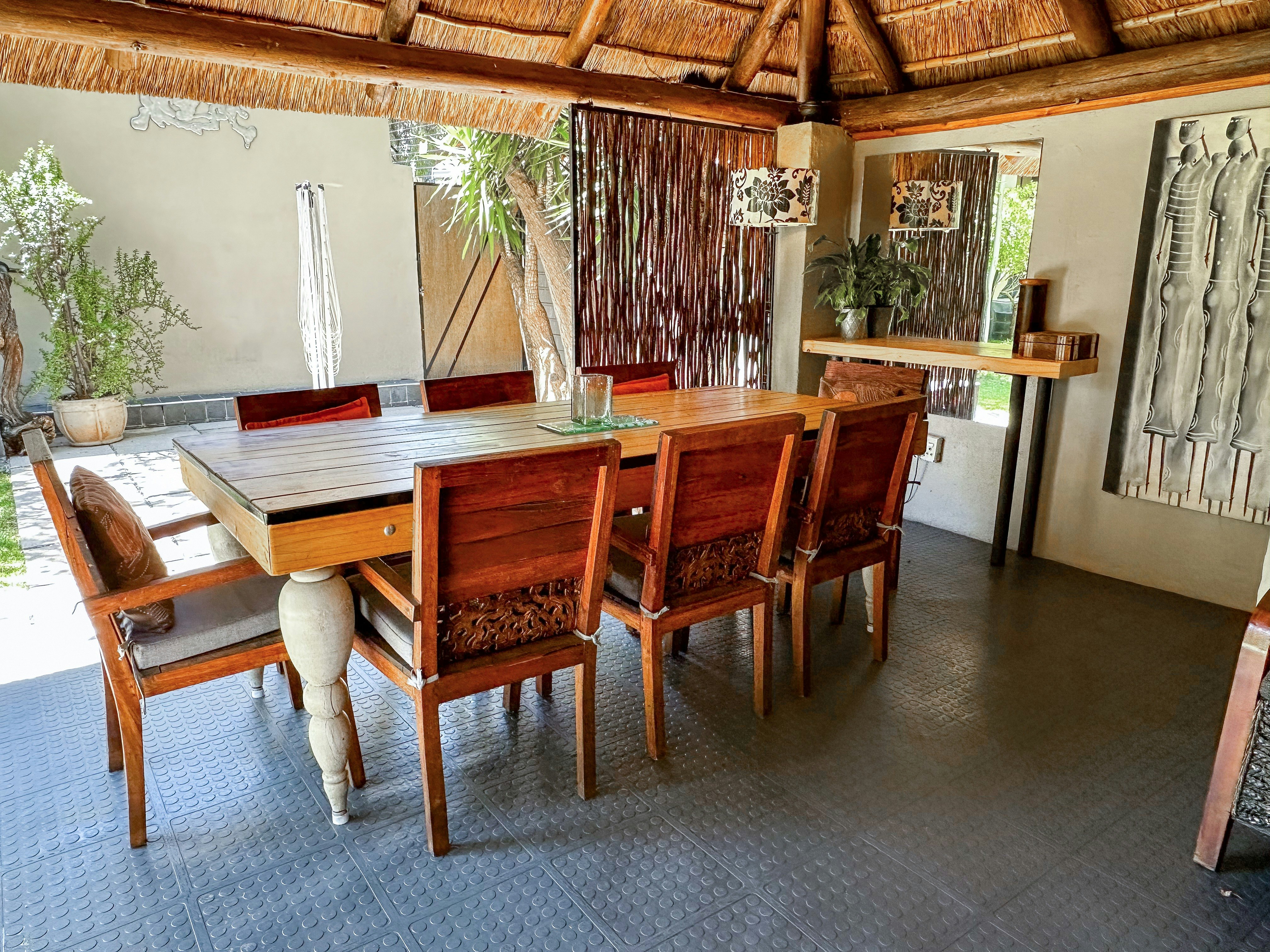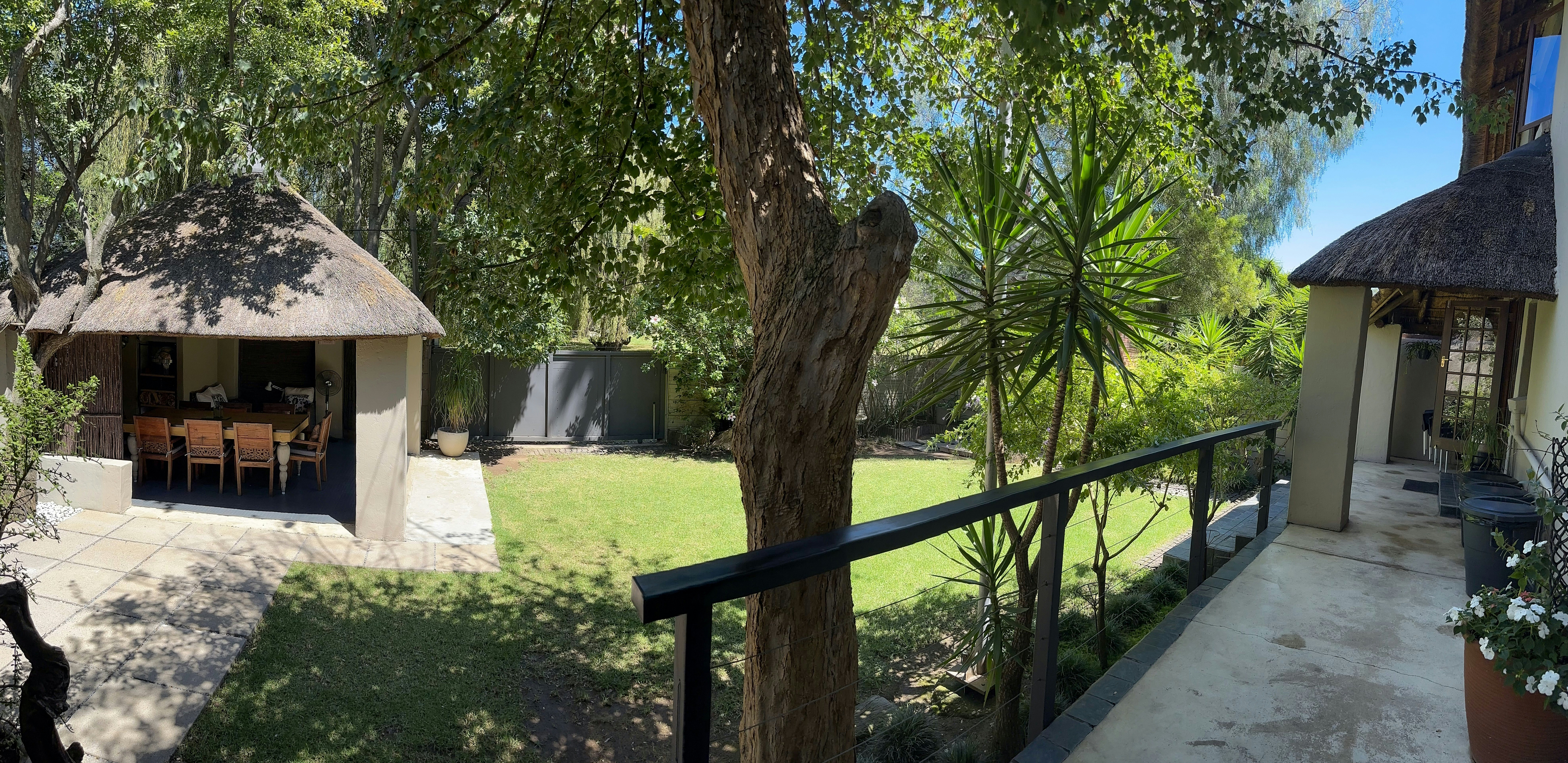 Die leefarea lei na 'n privaat tuin, eksklusief vir gaste, met 'n gemeubileerde grasdak-lapa met 'n eetkamertafel vir 8. 'n Groot houtskool-baksteenbraai is in die tuin beskikbaar, asook 'n buitekamer met 'n wasmasjien en vrieskas. 'n Hek bied direkte toegang tot die skilderagtige Hymany Park, waar gaste kan stap of fietsry terwyl hulle die oorvloedige voëllewe geniet.