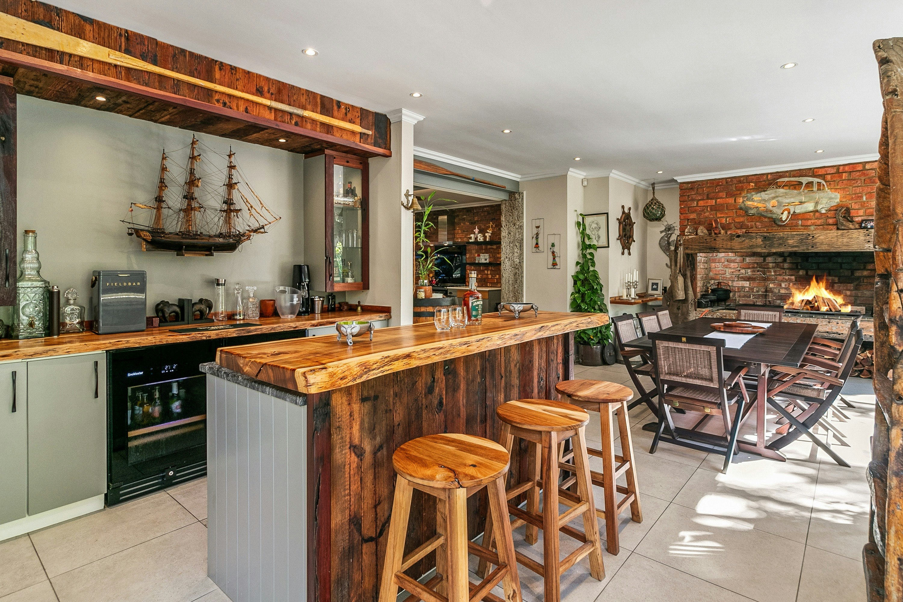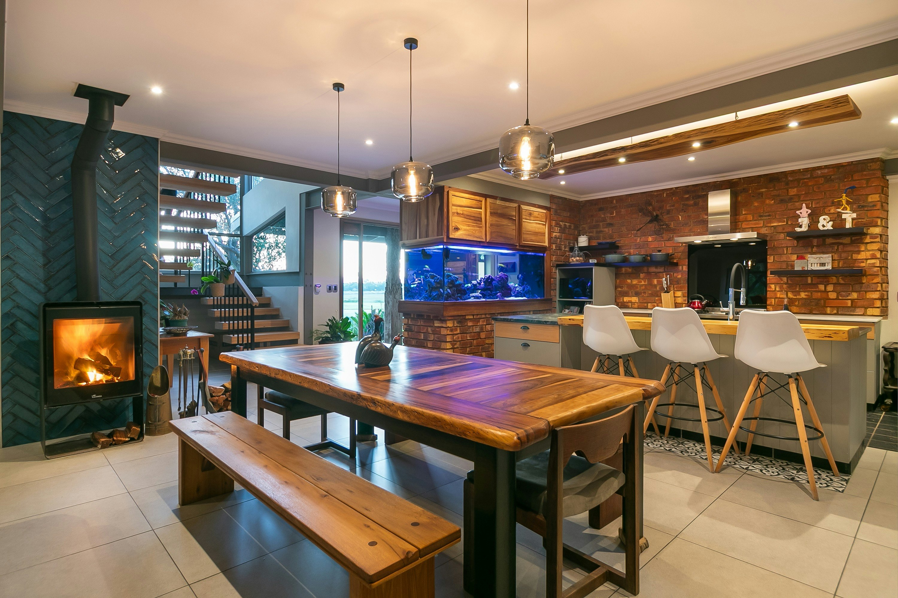 Die huis beskik oor 'n oopplan-leefarea wat naatloos aansluit by die kombuis, wat toegerus is met 'n stoof, oond, mikrogolfoond, ketel, yskas, ontbyttoonbank en eetkamertafel. Daar is 'n aparte opwasarea en wasgoedarea apart van die huis. Die huis bied bykomende geriewe soos 'n kaggel, en rusbanke is beskikbaar in die leefarea vir ekstra gemak.