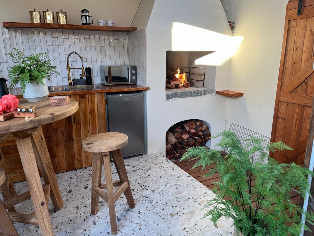 The living area and outdoor kitchen feature an open-plan design with a fully equipped kitchen, including a gas stove, microwave, bar fridge, toaster, cutlery, and plates. The lounge area is furnished with comfortable seating and an indoor braai area.