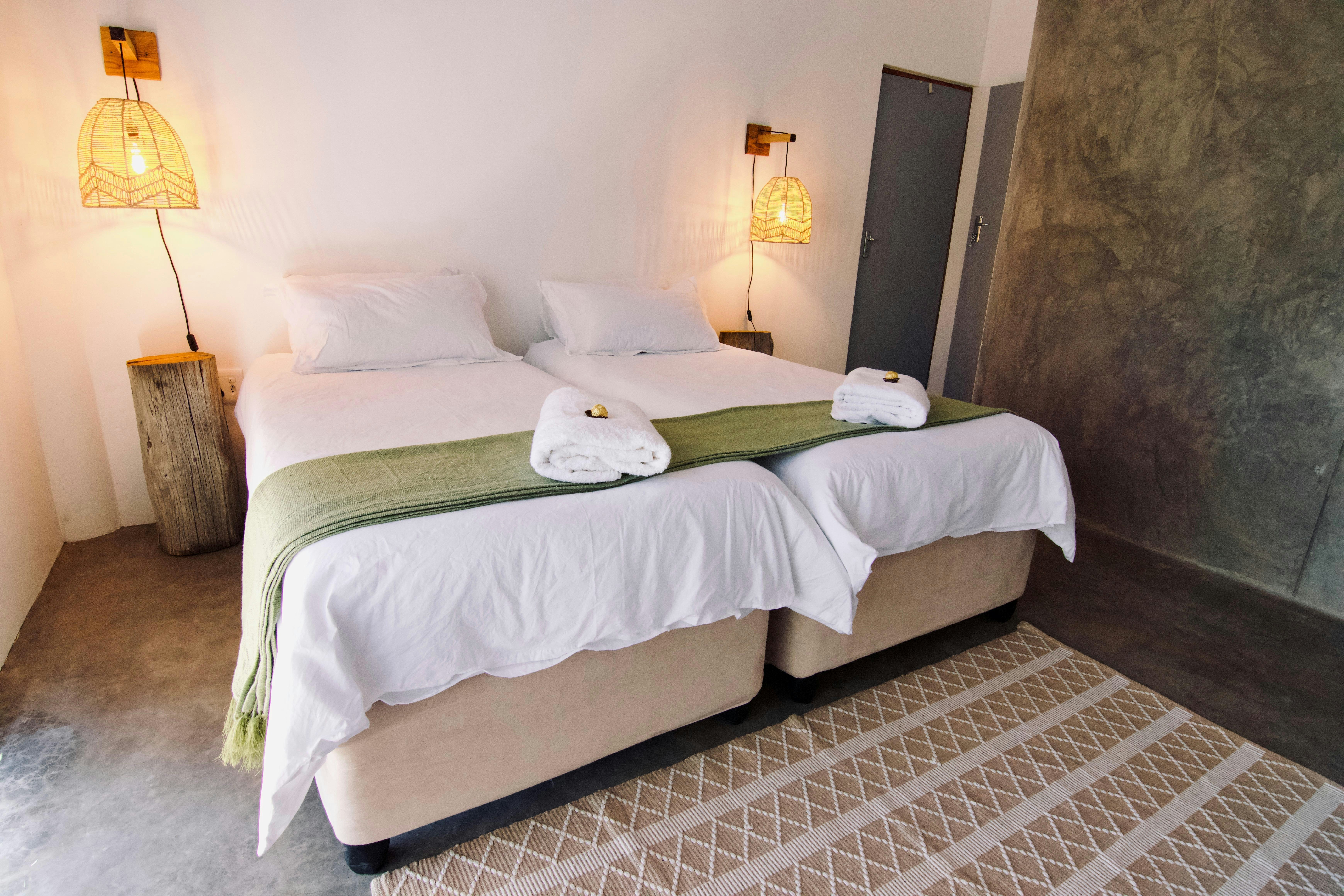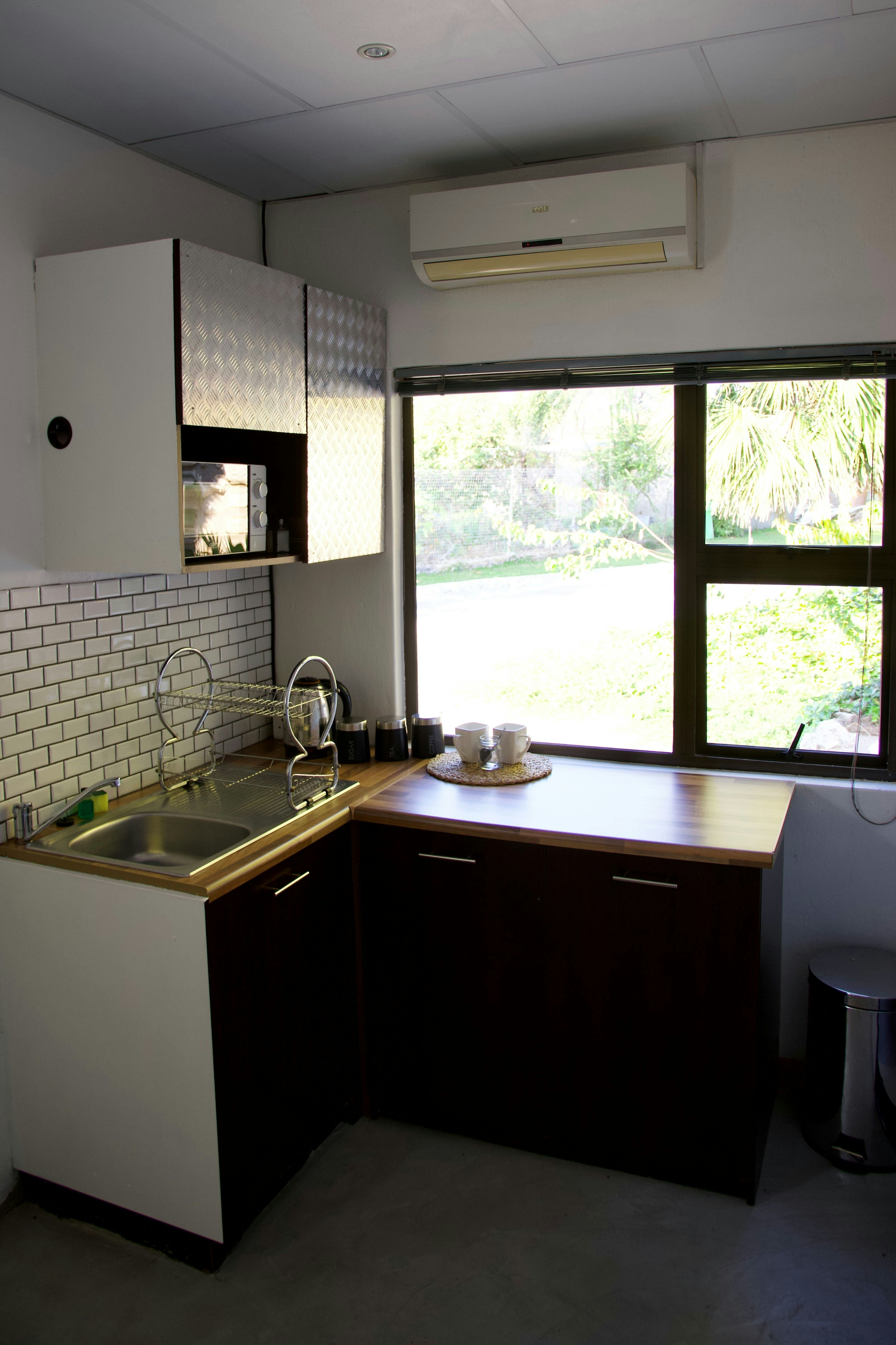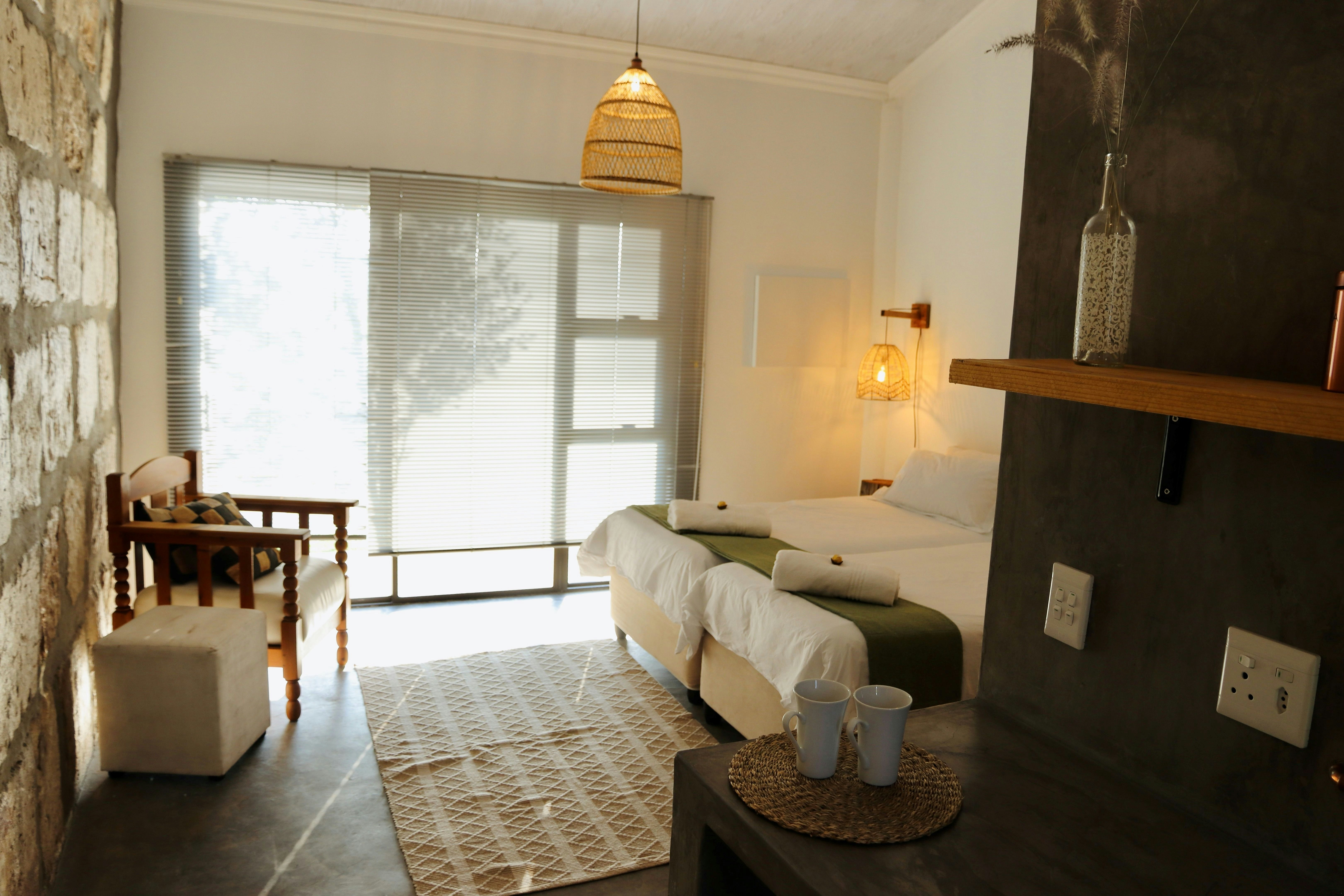 Accommodation is offered in 3 self-catering rooms. Each room can accommodate 2 adults and 1 child and is comfortably furnished with 2 single beds that can be converted into a king-size bed upon request, as well as a child-only mattress. Each room features an en-suite bathroom fitted with a shower. Linen and bath towels are provided. The rooms also include a kitchenette equipped with a microwave, single-plate induction hob, cutlery, crockery, tea- and coffee-making facilities, and a bar fridge. Guests have access to a communal garden and braai area.