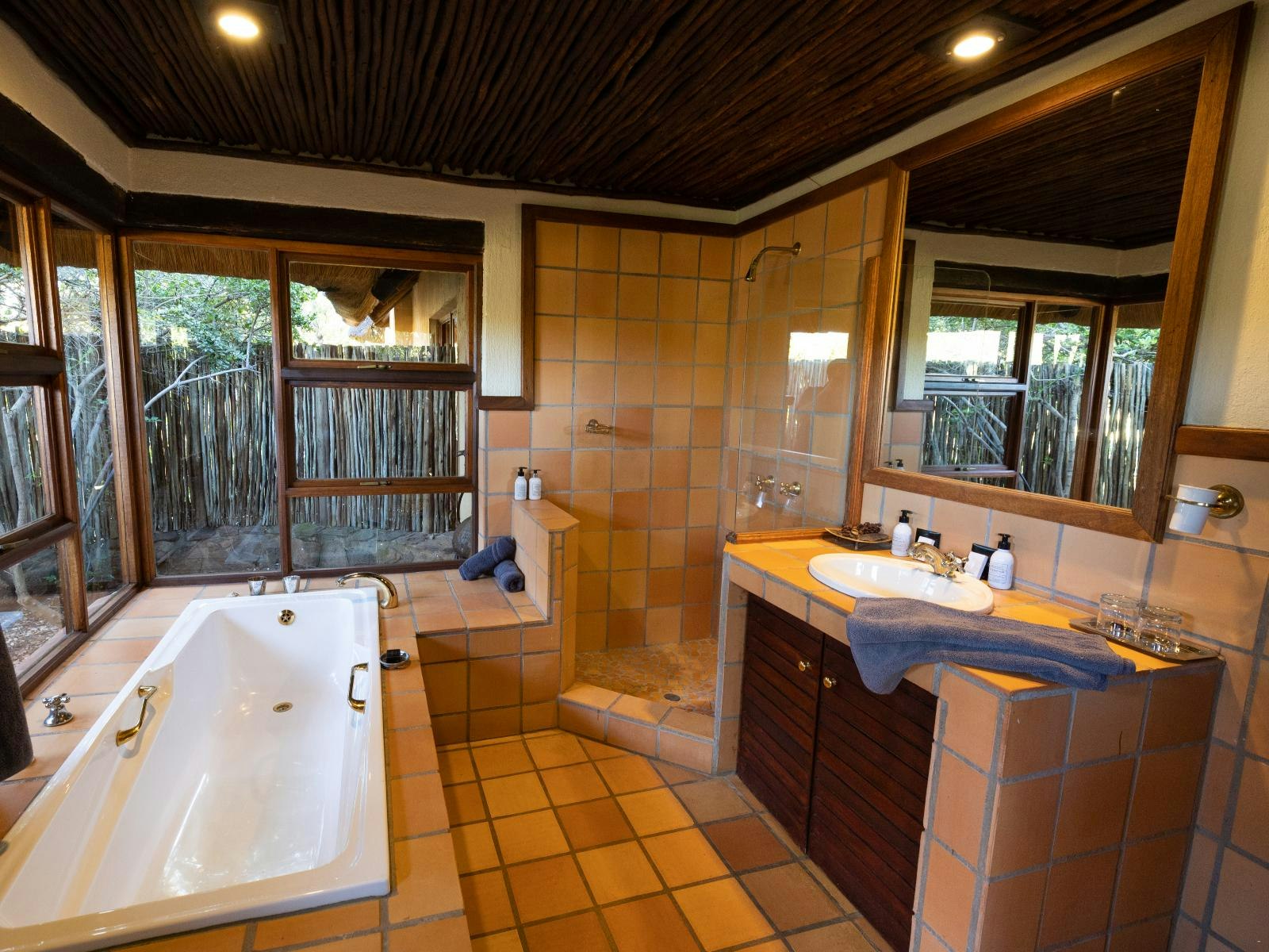 Tradisionele Suid-Afrikaanse kookkuns word op verskeie plekke rondom die lodge bedien, insluitend onvergeetlike boma-etes onder die vonkelende sterre, of op die uitgestrekte oop lodge-dek; spesiale dieetvereistes kan ook voorsien word. Gaste het toegang tot die gratis WiFi en swembad, geleë in die hooflodge-area. Daarbenewens spog die lodge met 'n uitkykdek met uitsig oor die nabygeleë watergat, 'n kroegarea en 'n klein geskenkwinkel.