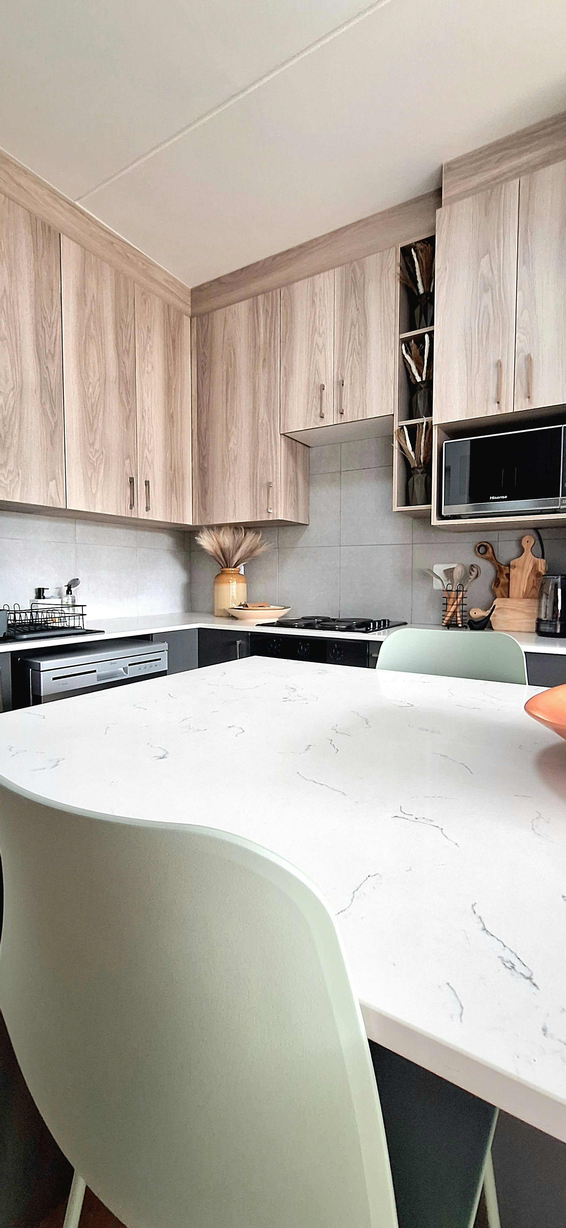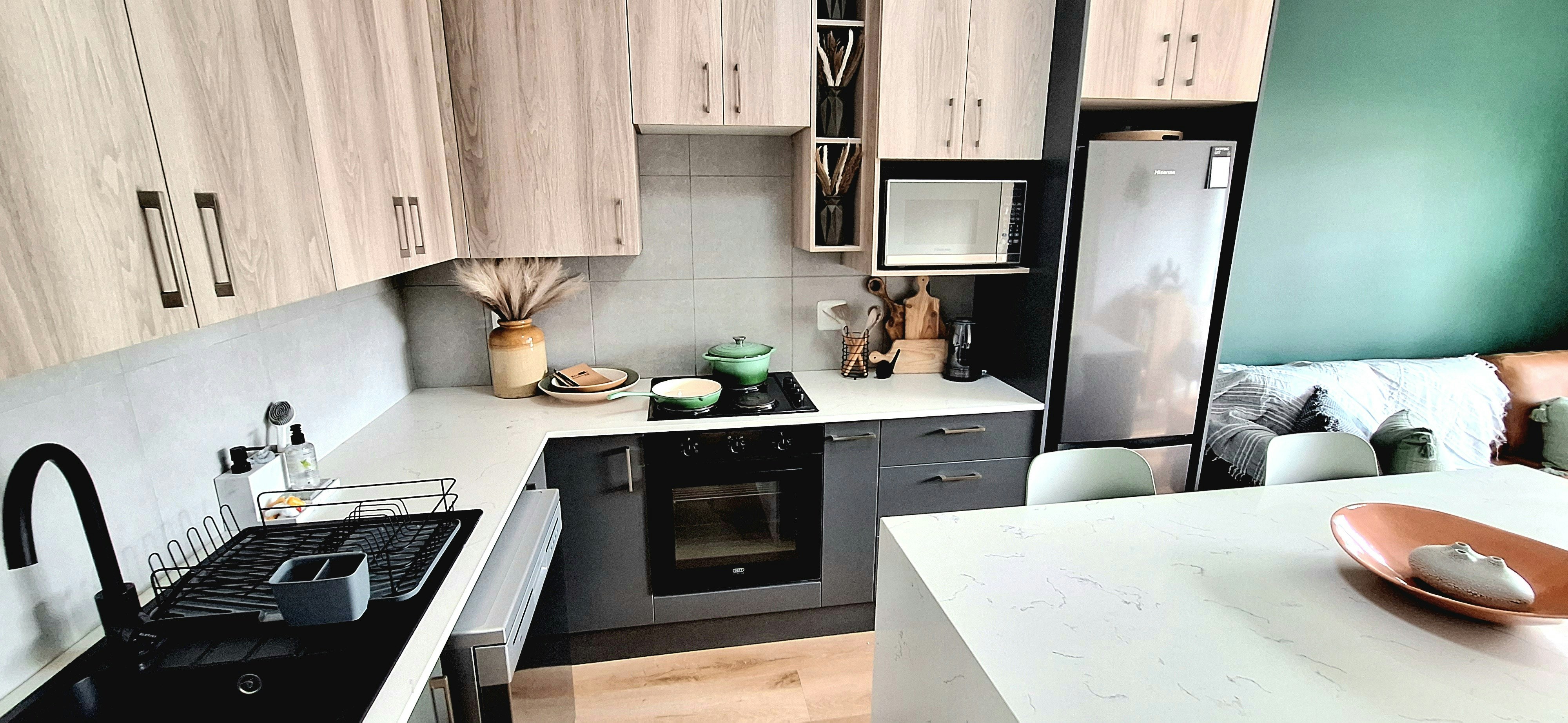 Die oopplan-leefarea sluit 'n kombuis in wat toegerus is met 'n stoof, oond, mikrogolf, yskas-vrieskas, eetgerei, breekware, skottelgoedwasser, wasmasjien en 'n eiland met sitplek vir 4. Die sitarea bied gemaklike sitplek, 'n TV en WiFi.