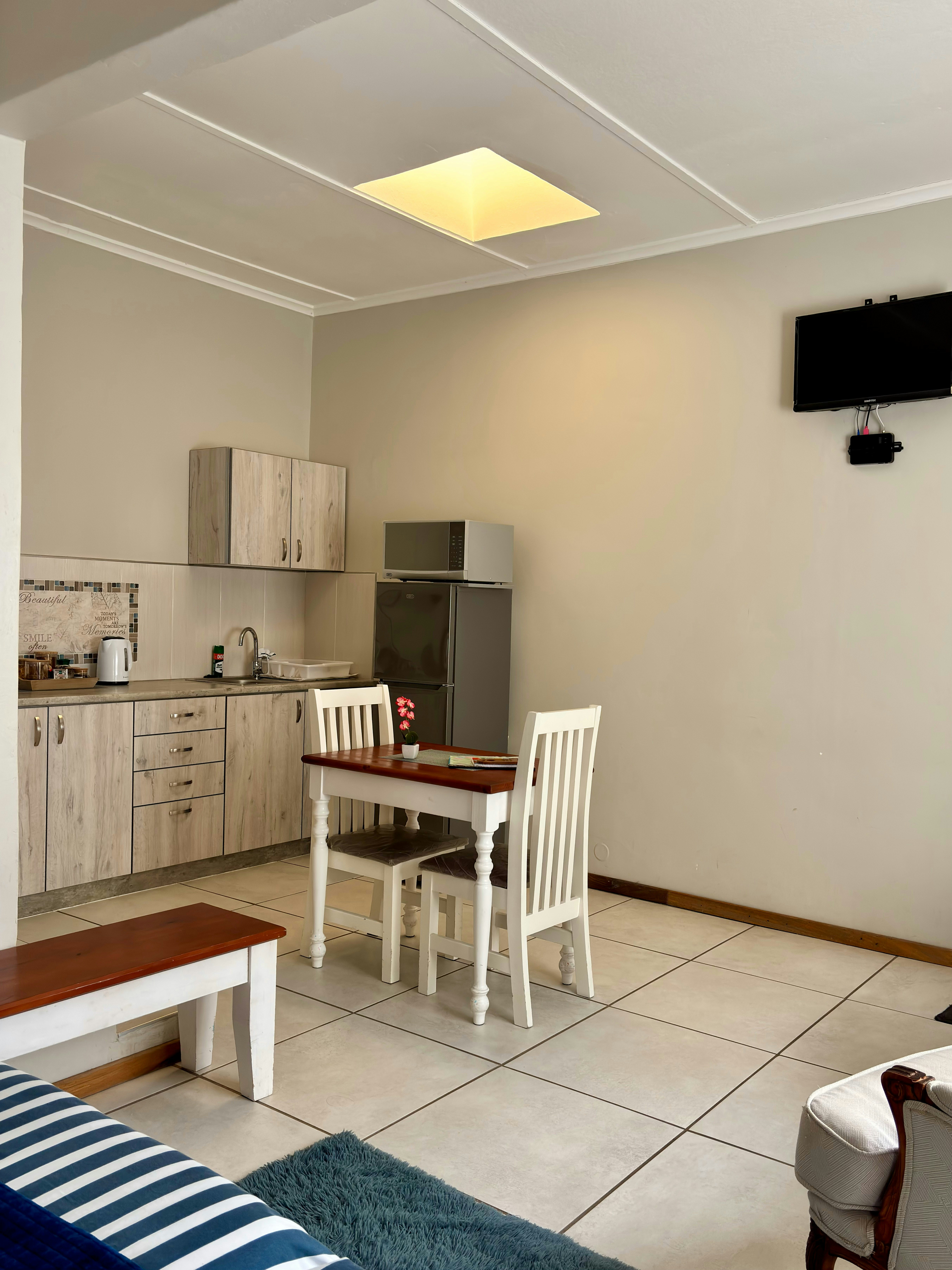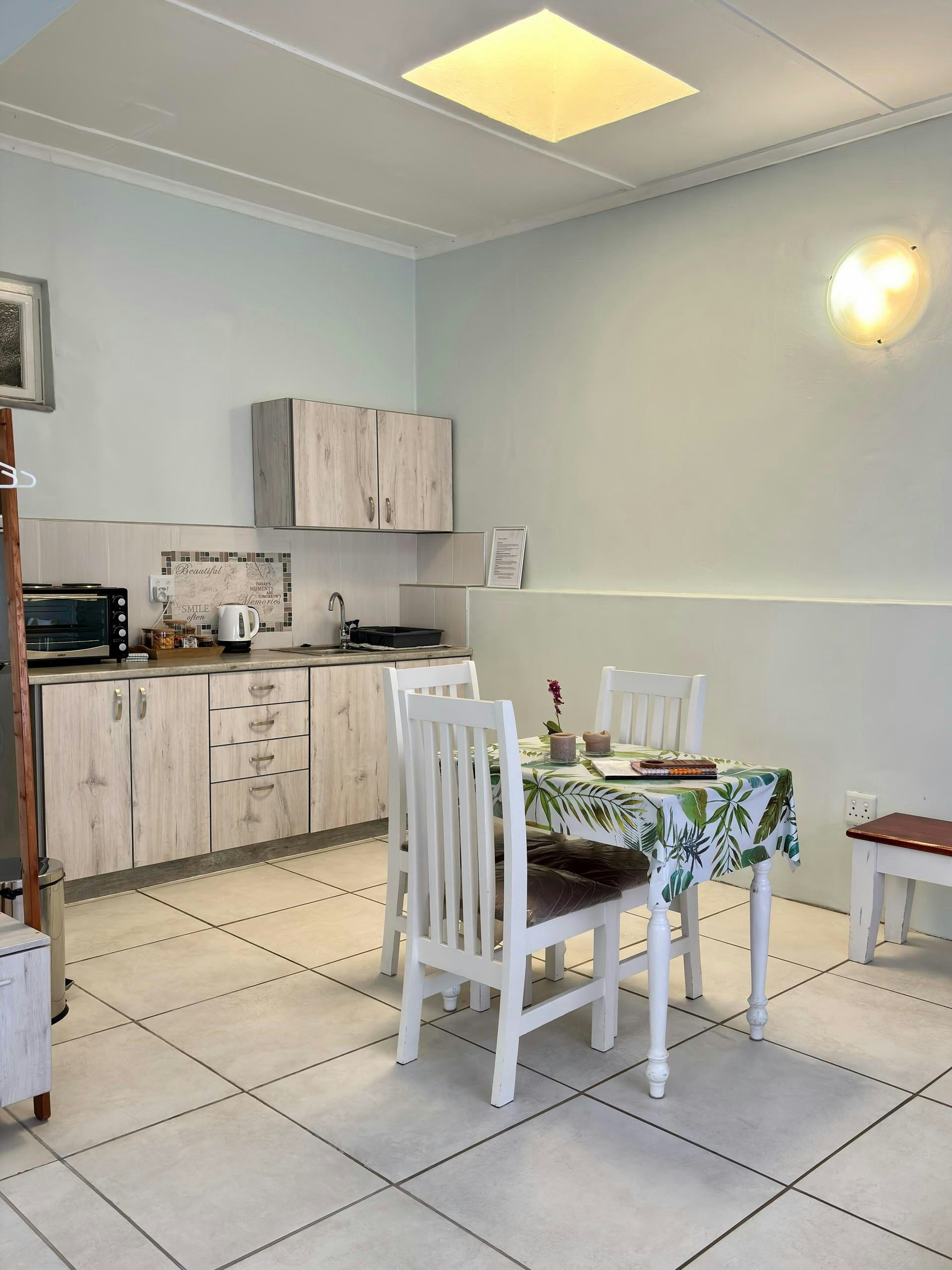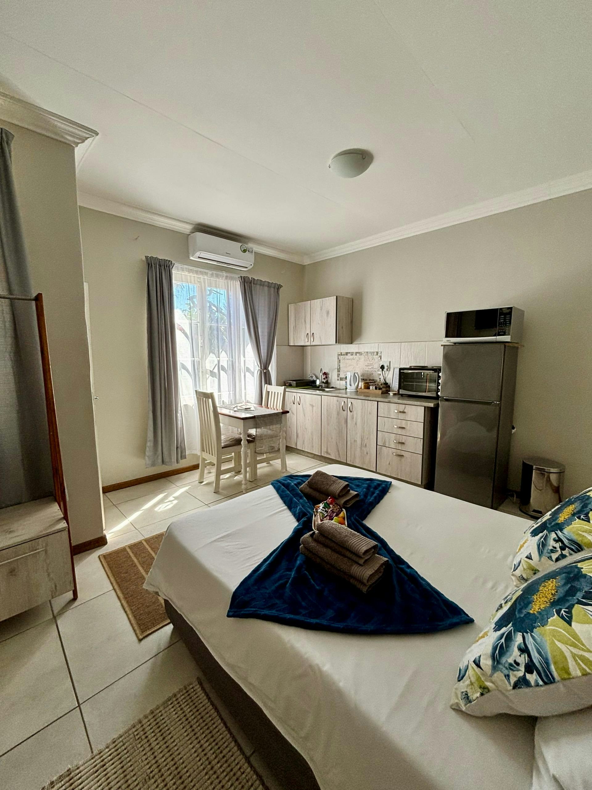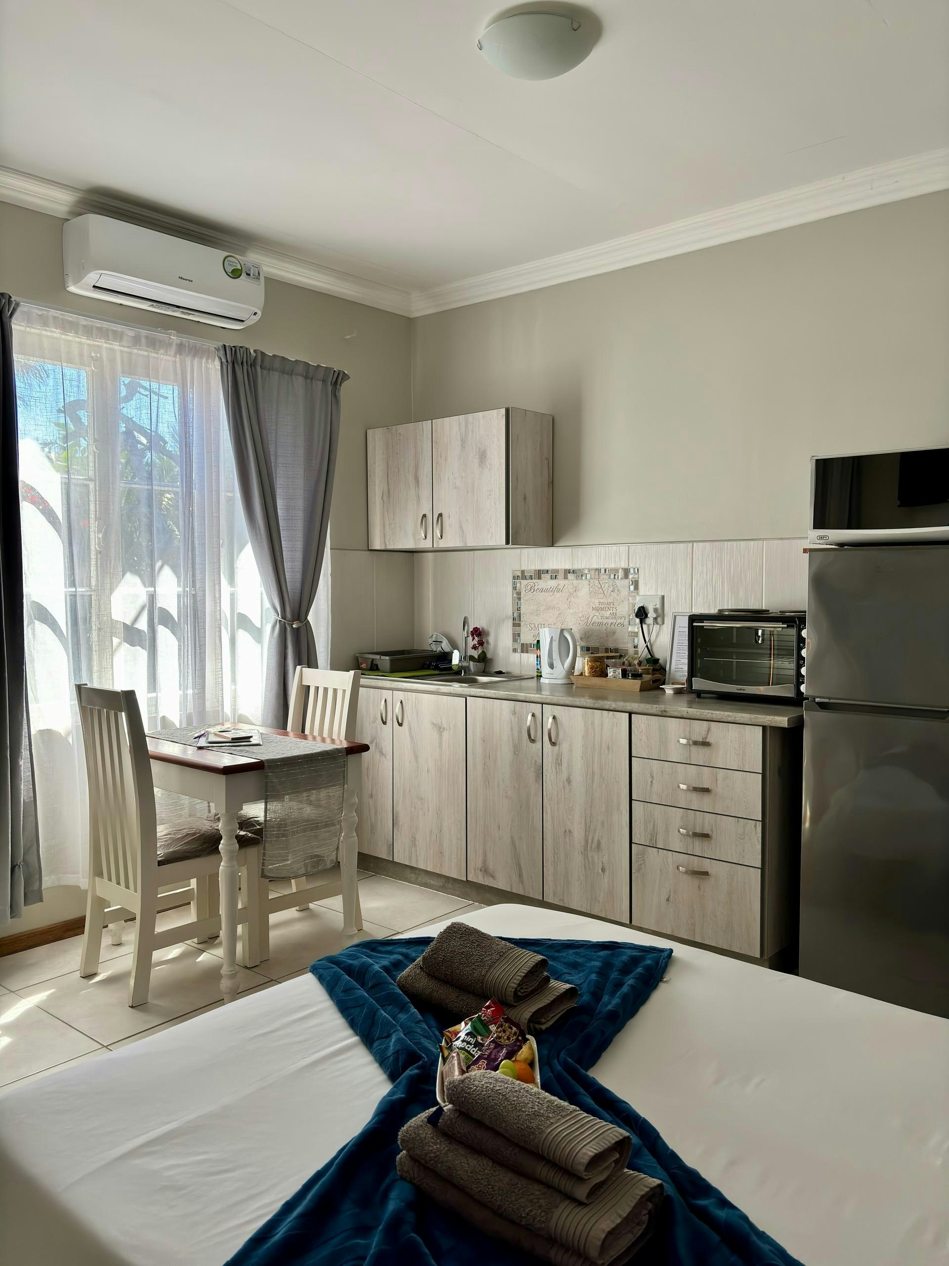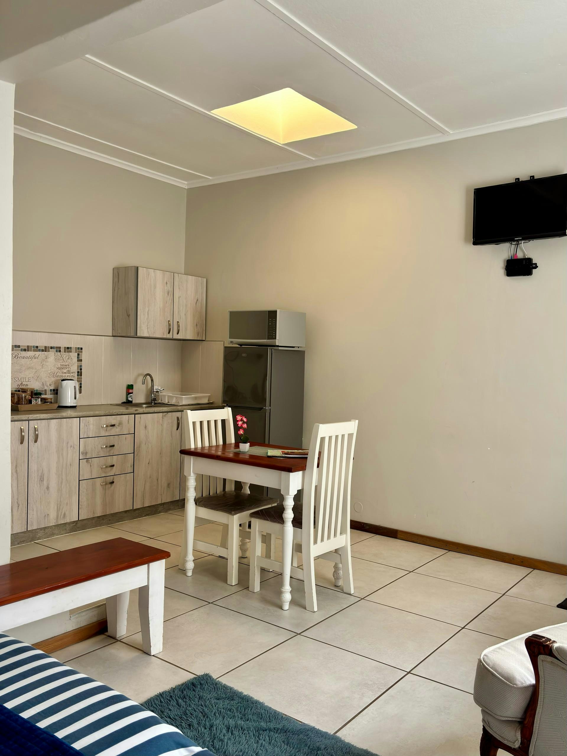 Elke eenheid beskik ook oor 'n kombuisie, volledig toegerus met alle nodige eetgerei en breekware, 'n yskas-vrieskas, stoof, oond, ketel, mikrogolfoond en tee- en koffiemaakgeriewe.