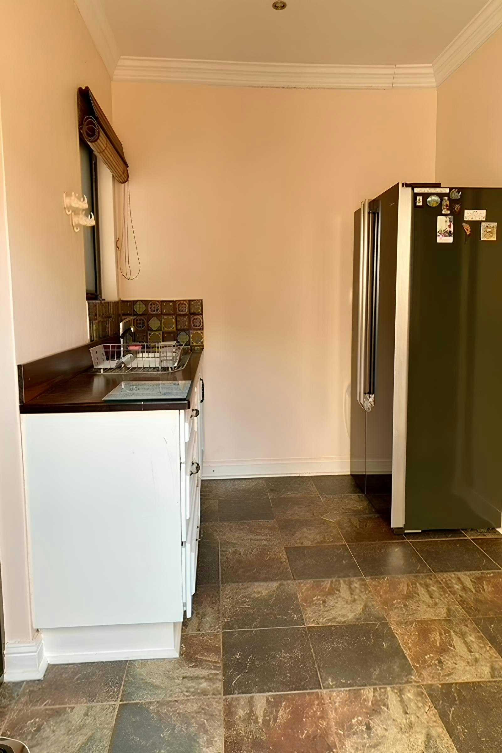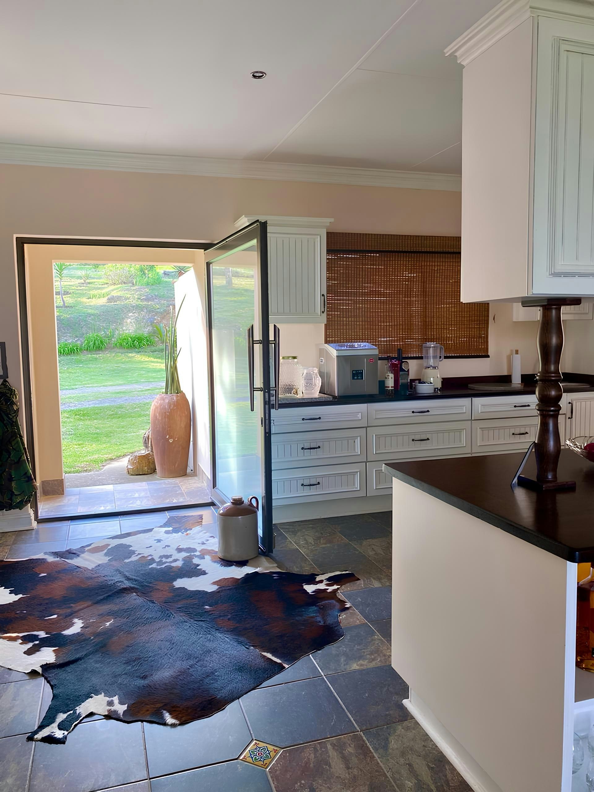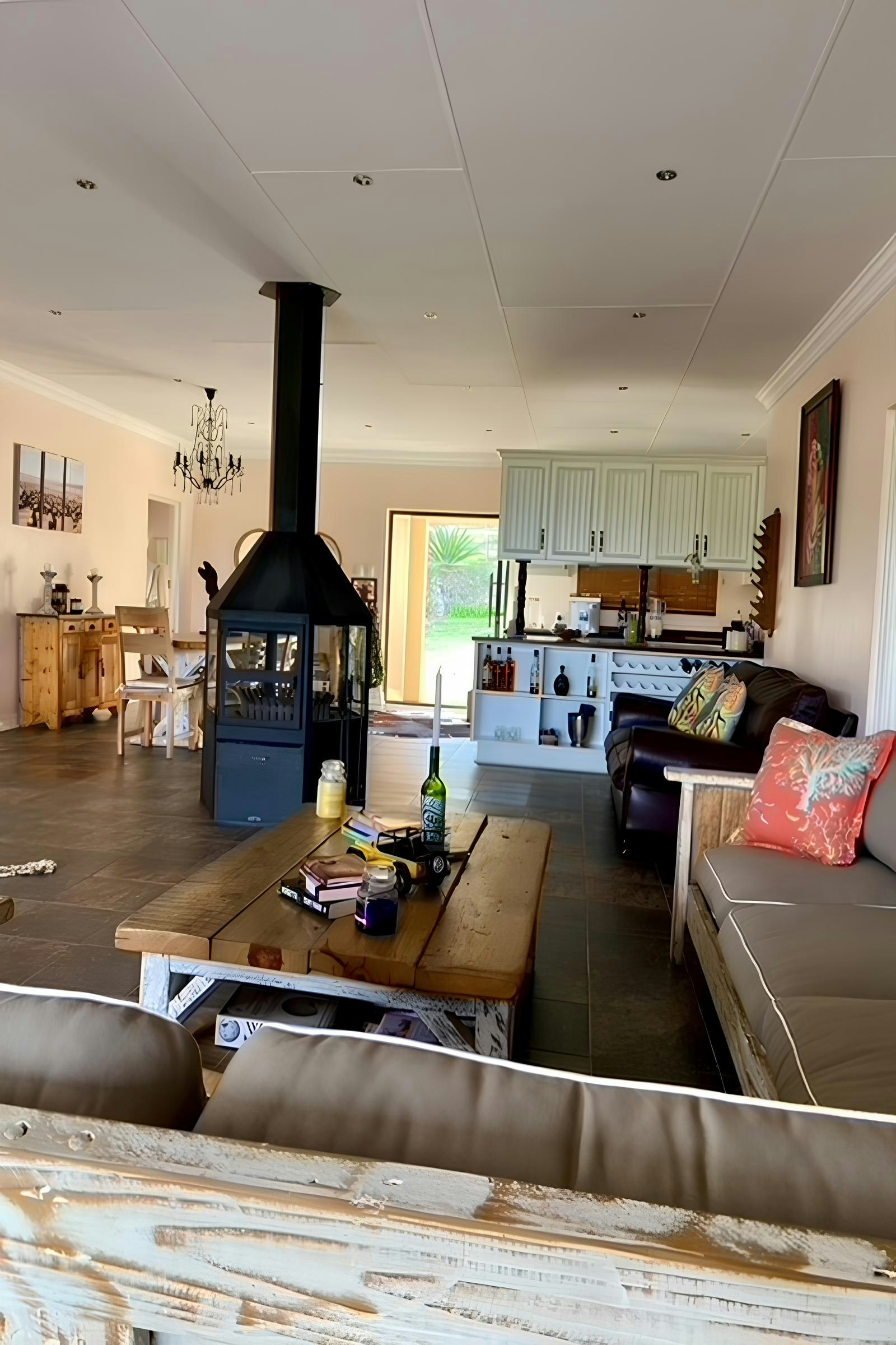 Die ruim lugversorgde oopplan-leefarea beskik oor 'n kombuis wat volledig toegerus is met 'n gasstoof, elektriese oond, mikrogolfoond, ysmasjien, menger, yskas-vrieskas, eetgerei en breekware asook 'n Nespresso-masjien. 'n Wasmasjien is ook beskikbaar met wasgoedlyne in die binnehof. Van die kombuis af lei 'n etenstafel waar gaste hul maaltye saam kan geniet. Die sitkamer het gemaklike sitplek en 'n TV met DStv. Hierdie spasie deel 'n sentrale kaggel vir gaste om warm te bly gedurende die winter. Vir ekstra vermaak is gratis WiFi, legkaarte en leesboeke ook beskikbaar.