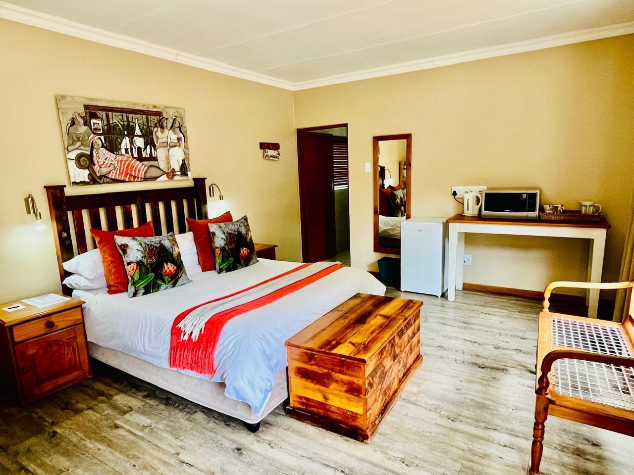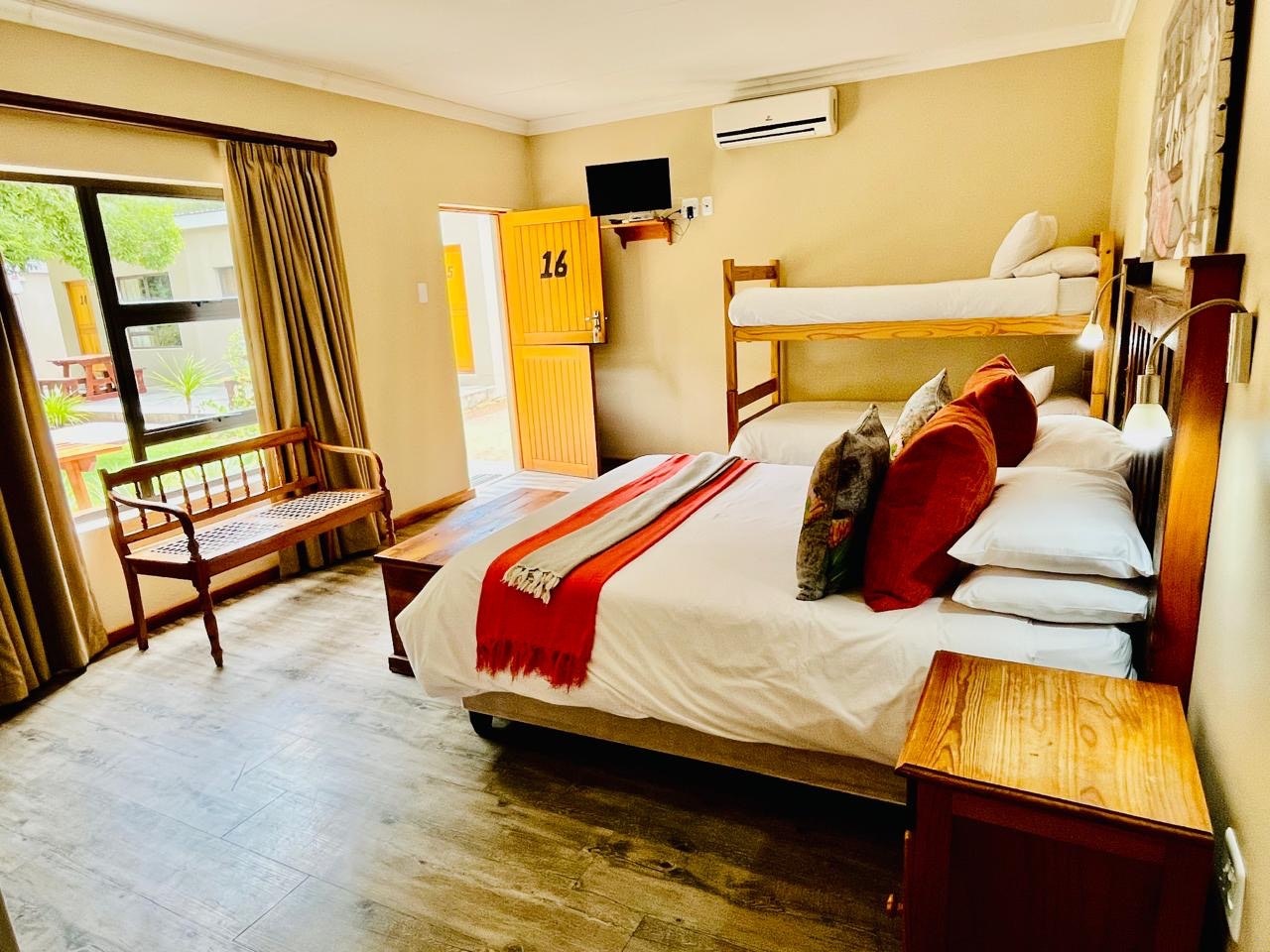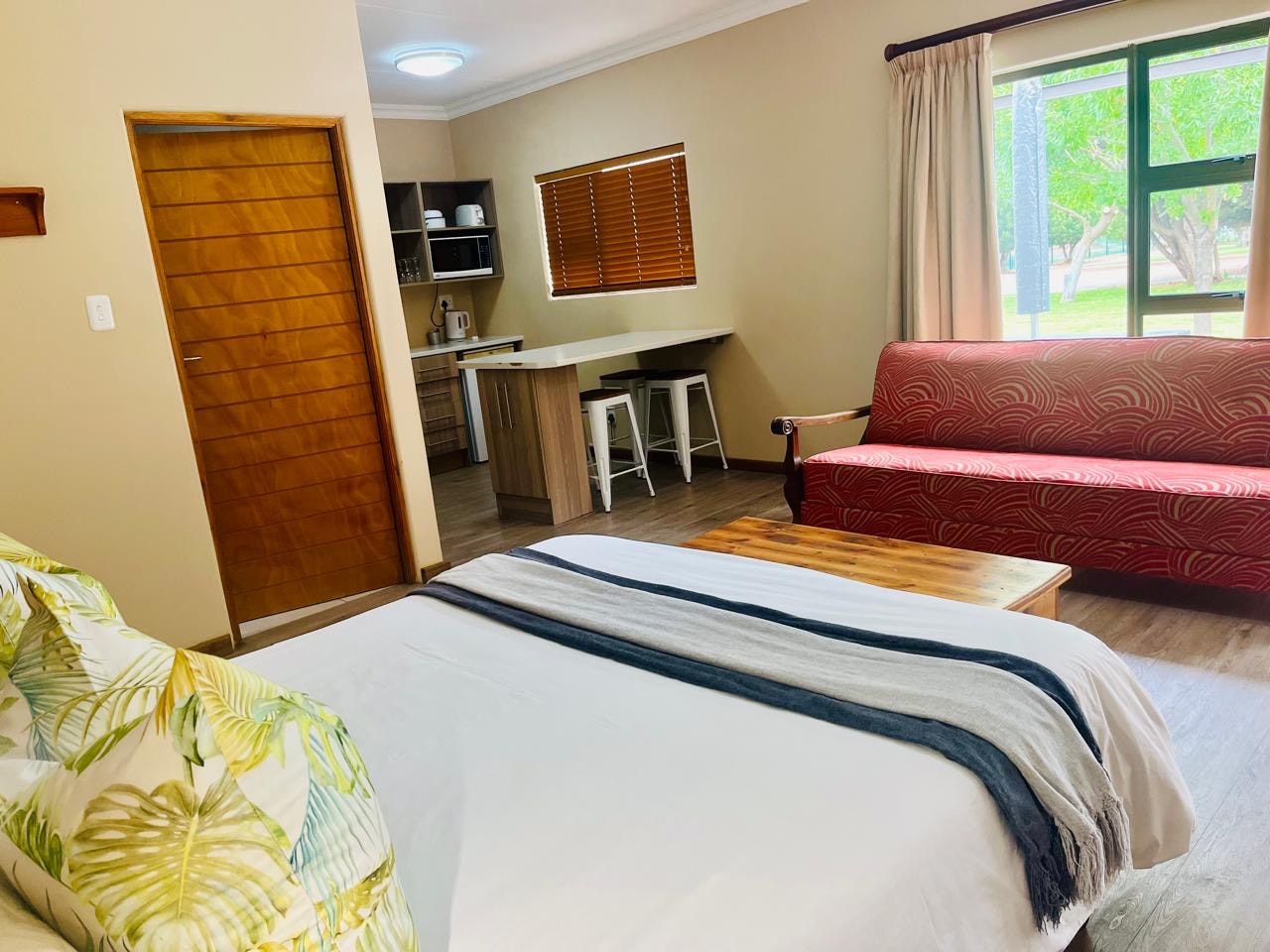 Dié selfsorgkamer het 'n kombuisie sonder 'n stoof. Daar is 'n koningingrootte-bed, 'n stapelbed en 'n en suite-badkamer met 'n stort. Ander geriewe sluit 'n TV, lugversorging, 'n yskas en koffie- en teemaakgeriewe in.