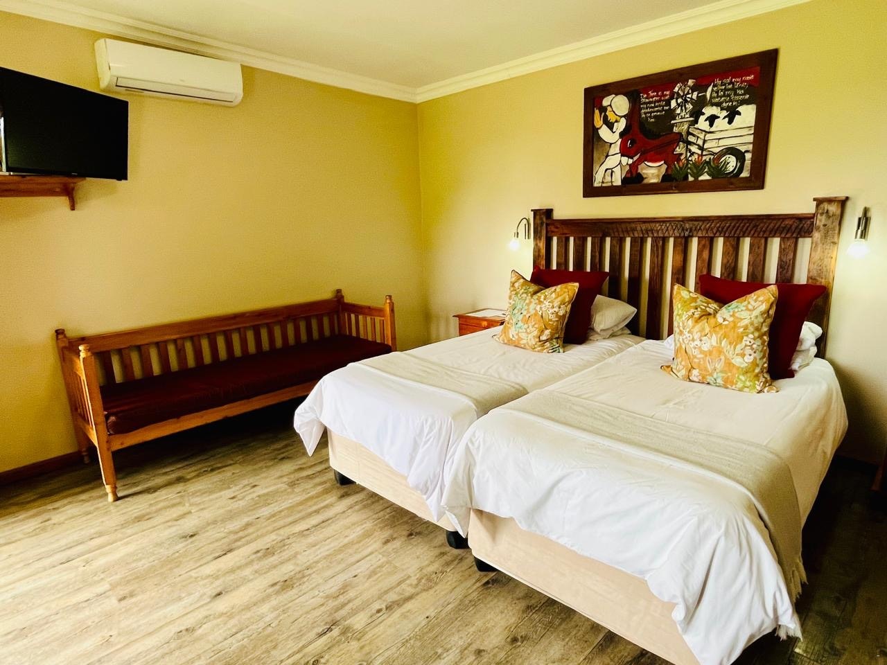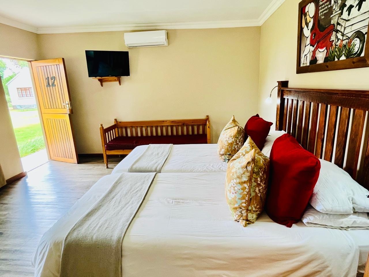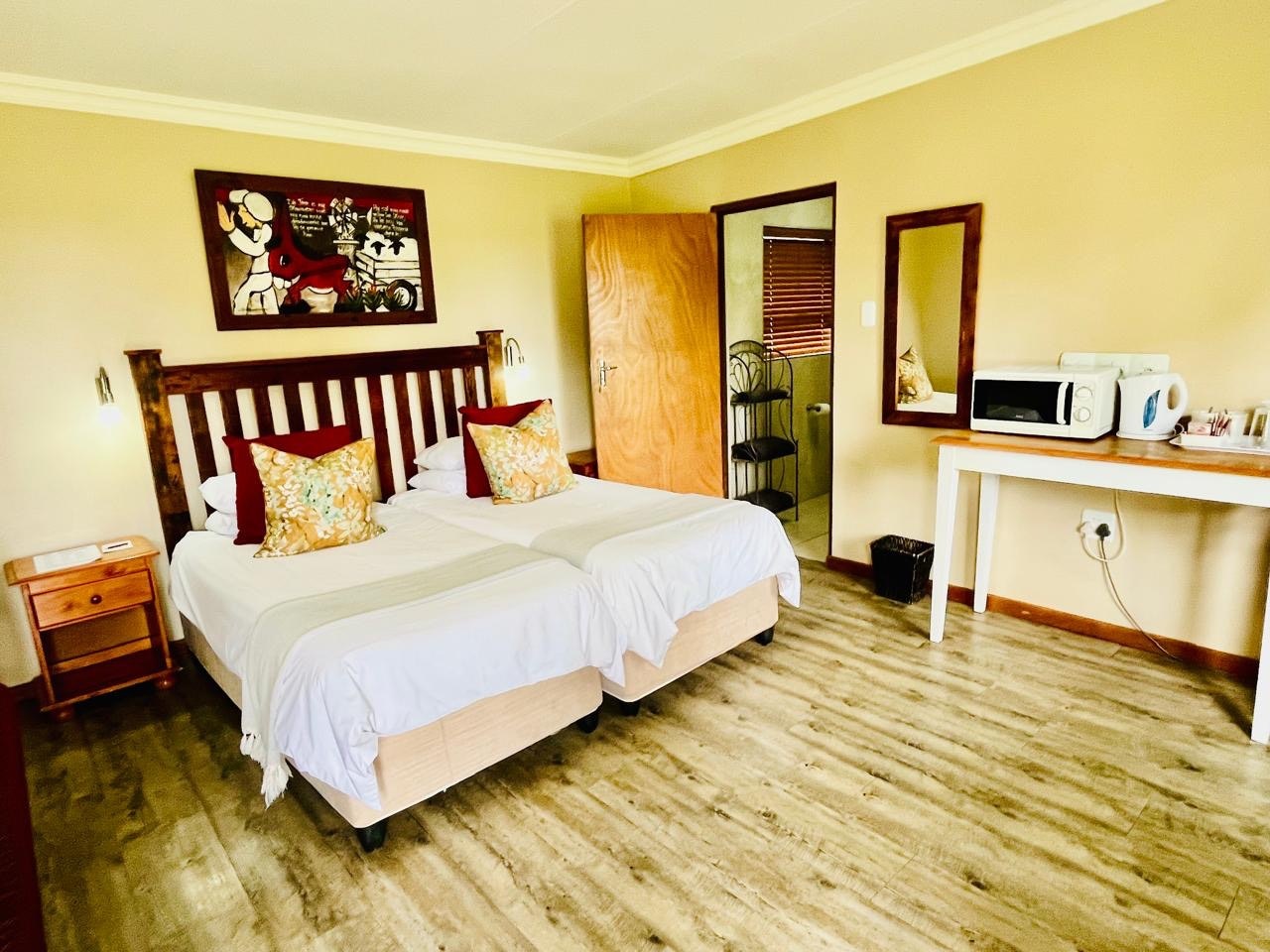 Hierdie ruim kamer het 'n uitsig oor die tuin, 2 enkelbeddens en 'n en suite-badkamer met 'n stort. Daar is ook 'n TV, lugversorging, 'n yskas en koffie- en teemaakgeriewe.