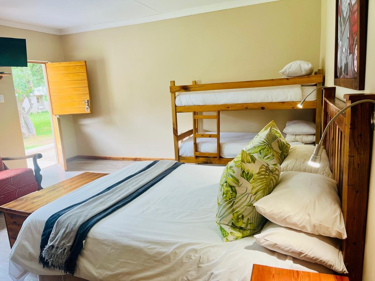 Hierdie ruim kamer het 'n uitsig oor die tuin, 'n koningingrootte-bed, 'n stapelbed en 'n en suite-badkamer met 'n stort. Daar is ook 'n TV, lugversorging, 'n yskas en koffie- en teemaakgeriewe.