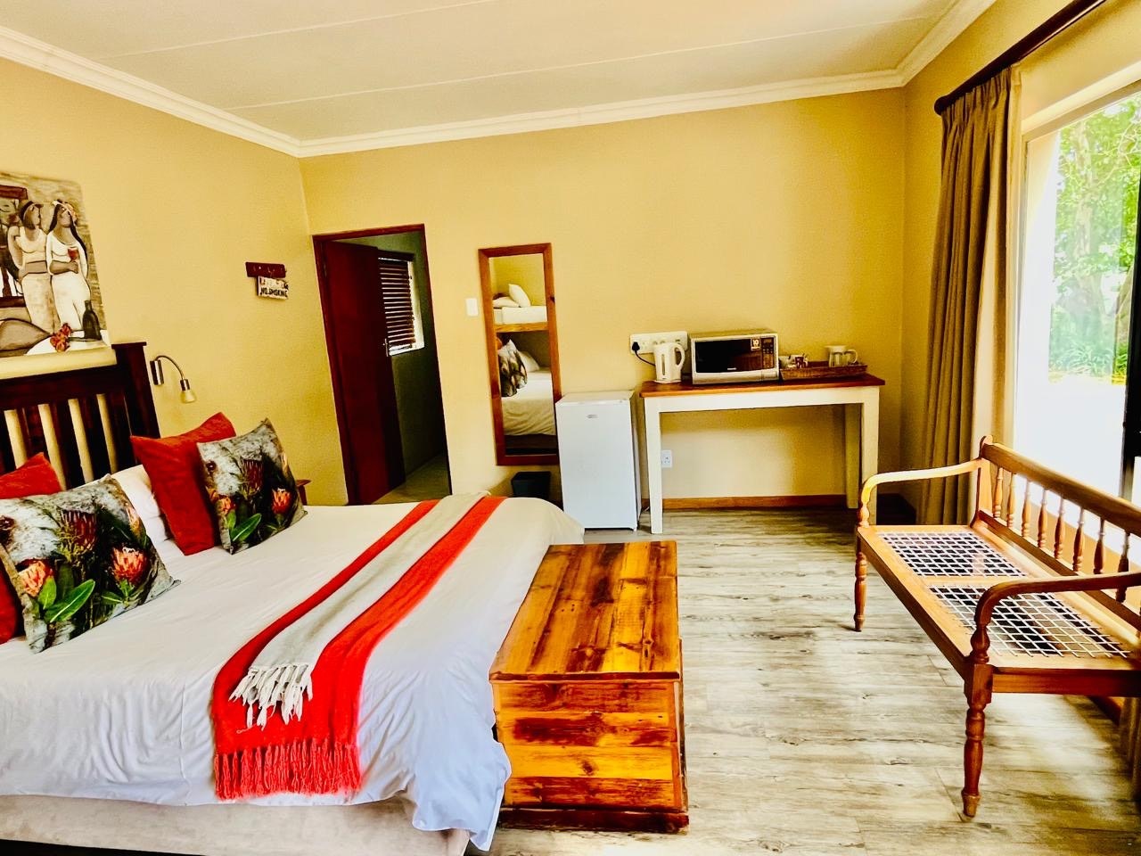 Hierdie ruim kamer het 'n uitsig oor die tuin, 'n koningingrootte-bed en 'n en suite-badkamer met 'n stort. Daar is ook 'n TV, lugversorging, 'n yskas en koffie- en teemaakgeriewe.