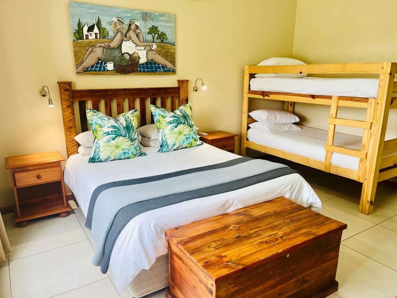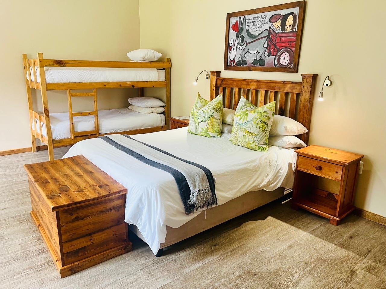 Dié kothuis het 'n koningingrootte-bed, 'n stapelbed en 'n badkamer met 'n stort, toilet en 'n wasbak. Die tweede slaapkamer het 2 enkelbeddens. Ander geriewe sluit 'n TV en lugversorging in.