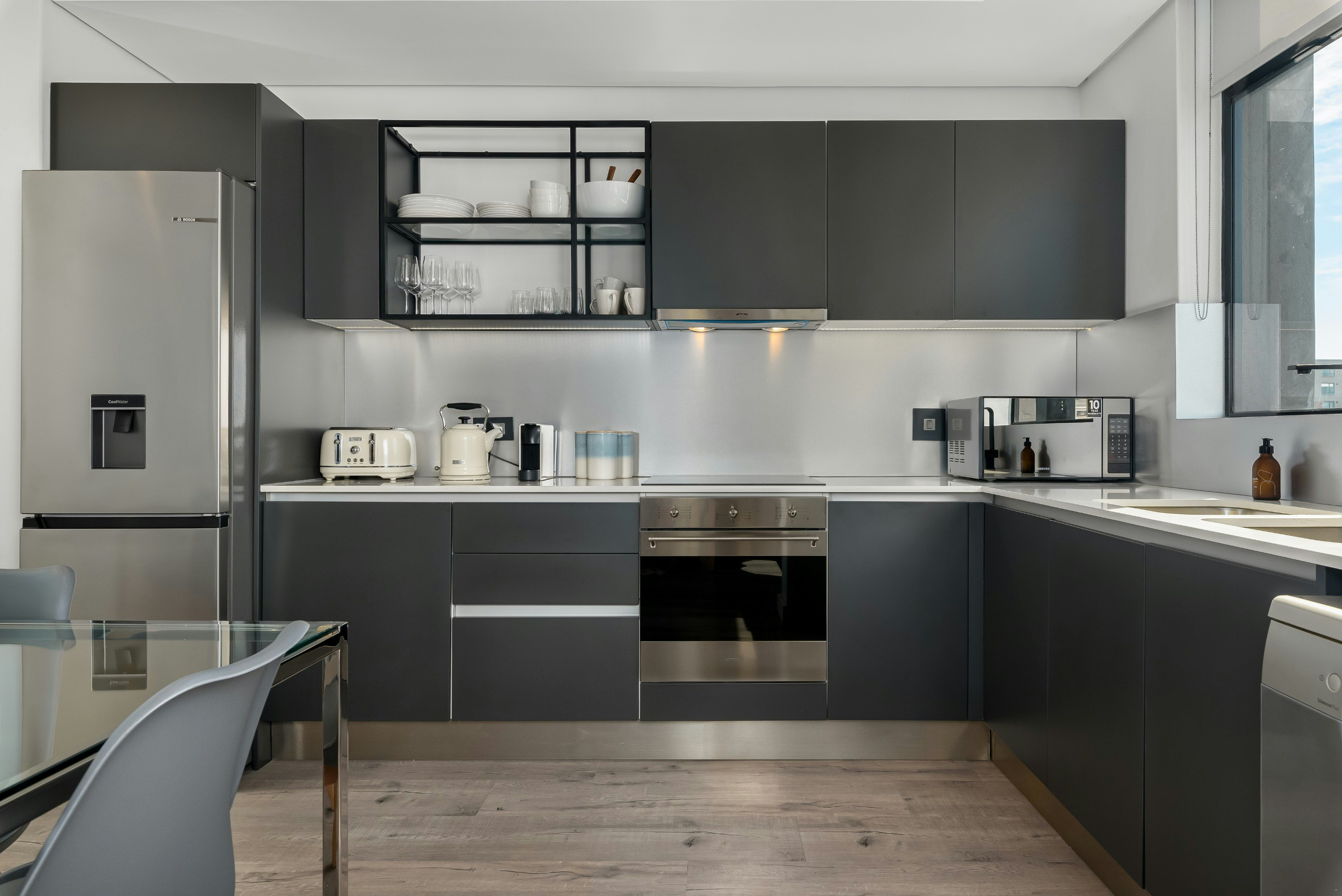 Die oopplan-leefarea sluit 'n eetarea en 'n sitkamer met 'n slim-TV met Netflix in, asook gemaklike rusbanke. Die kombuis is volledig toegerus met 'n yskas-vrieskas, stoof, oond, broodrooster, ketel, koffiemasjien, mikrogolfoond en skottelgoedwasser.