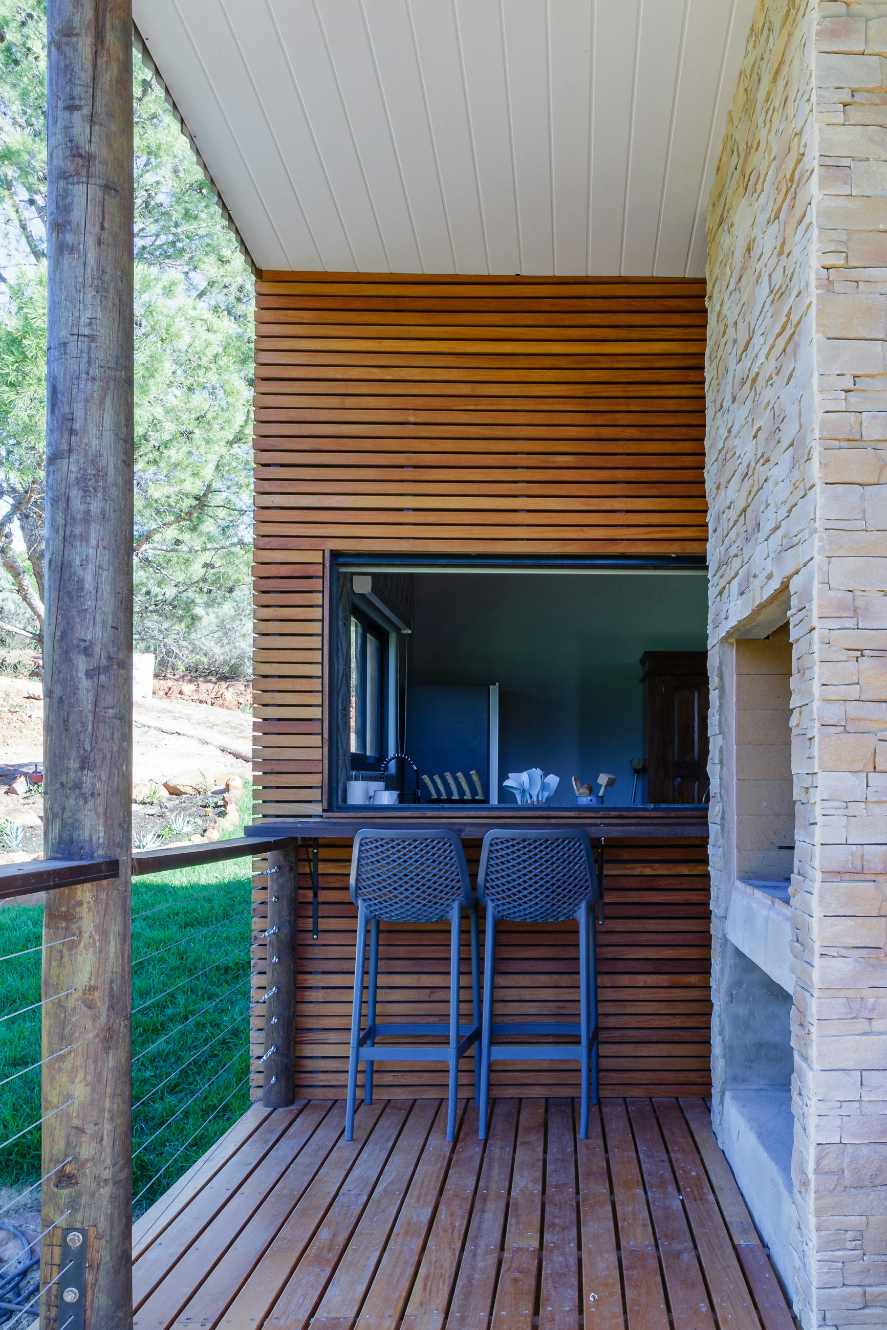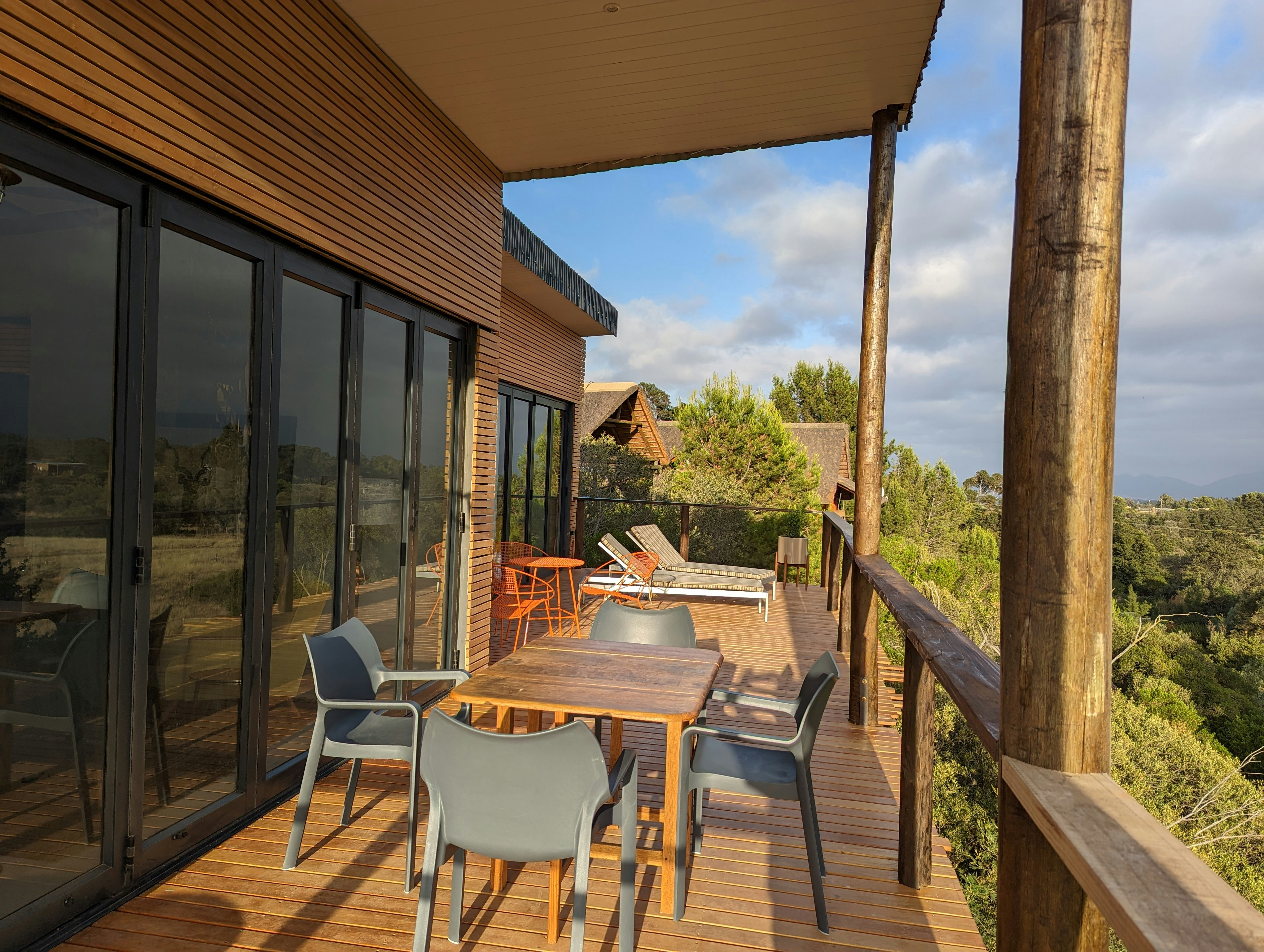 Die kombuis is toegerus met 'n yskas-vrieskas, gasstoof, mikrogolfoond, wasmasjien en tuimeldroër. Die leefarea beskik oor 'n eetkamertafel, 'n houtkaggel, 'n gemaklike sitarea en 'n TV. Die chalet maak oop na 'n houtdek met sonstoele, 'n buite-eetkamertafel en 'n braai-area.