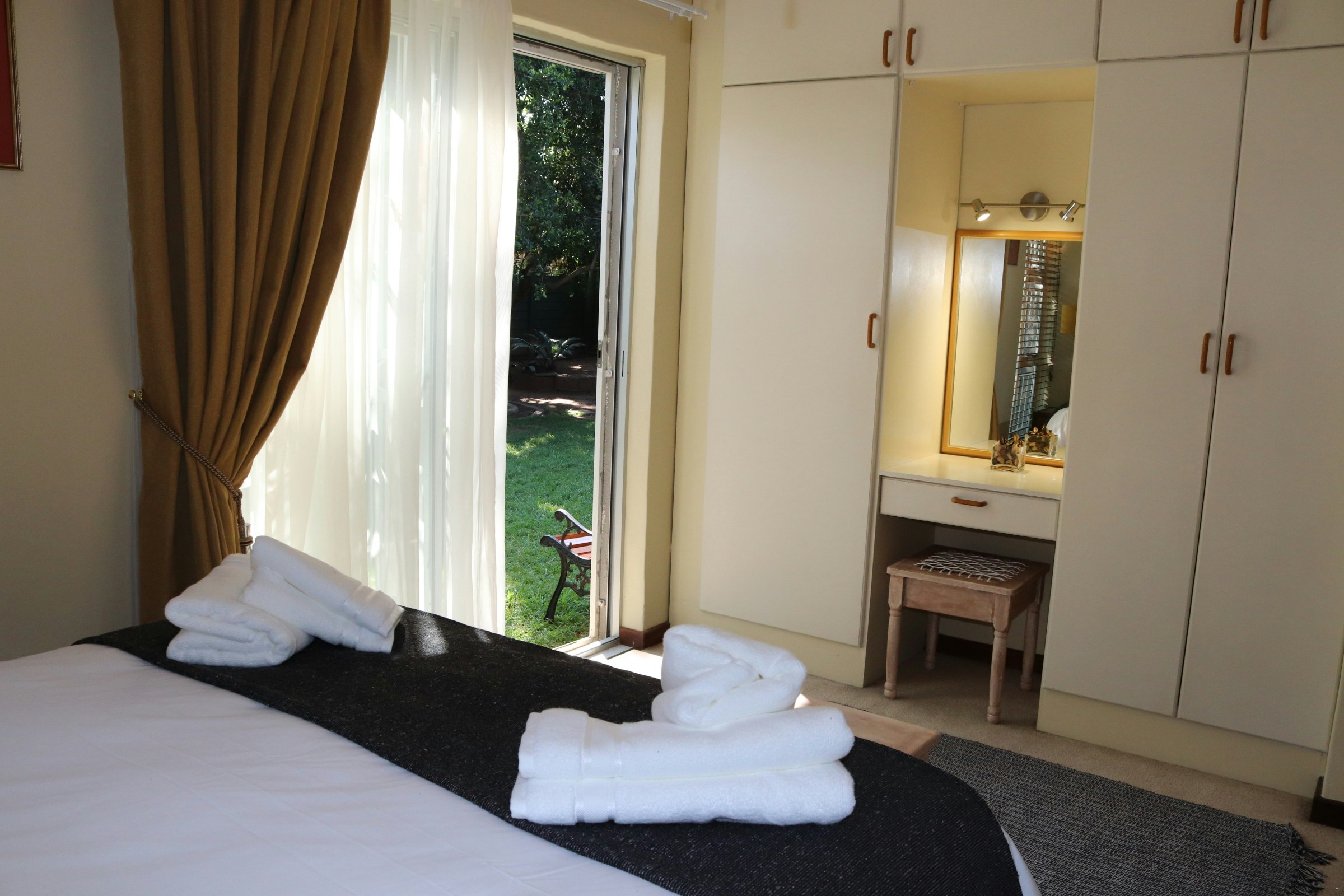 Die slaapkamer het 'n dubbelbed, klerekas, plafonwaaier en TV. Die badkamer het 'n stort, toilet en wasbak. Linne en handdoeke word voorsien.