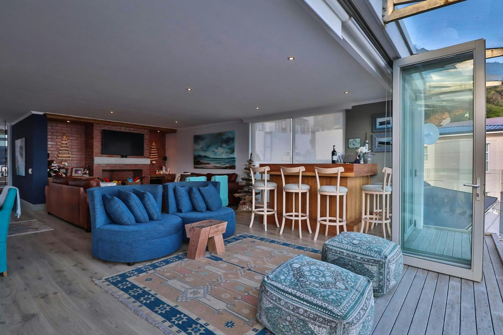 Die oopplan-leefarea beskik oor 'n eetarea en sitarea met gemaklike rusbanke, 'n kaggel en 'n TV met stroomdienste. Die leefarea se groot skuifdeure nooi die buitelewe na binne. Die kombuis is met 'n yskas-vrieskas, stoof, oond, skottelgoedwasser en 'n mikrogolfoond toegerus. Tee- en koffiemaakgeriewe, gratis WiFi en braaigeriewe is ook beskikbaar.