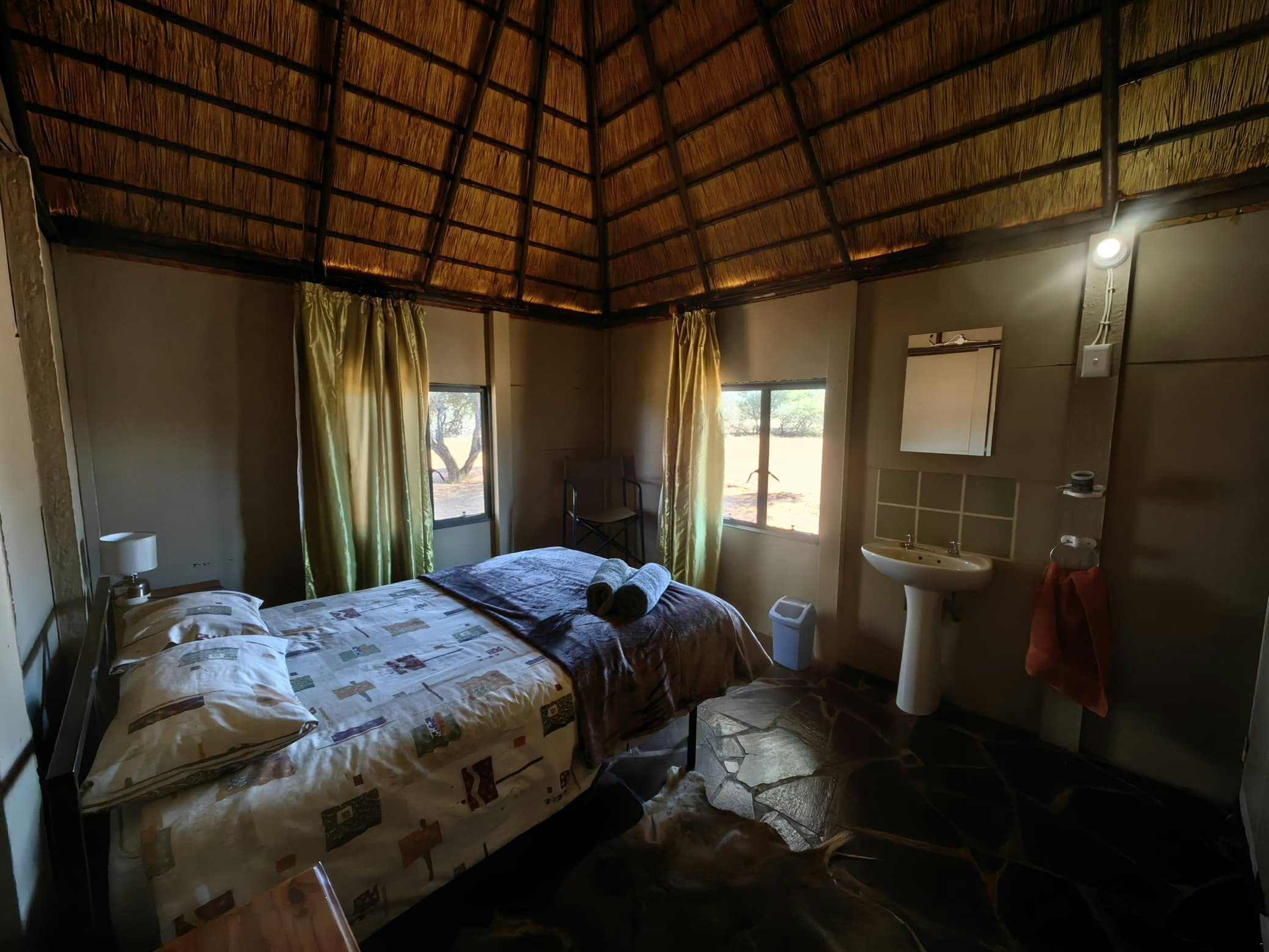 Die oopplan-leefarea het gemaklike sitplek, 'n TV, etenstafel, binnebraai en 'n kombuis. Die kombuis is met 'n yskas-vrieskas, stoof, oond, mikrogolf, skottelgoedwasser en koffie- en teemaakgeriewe toegerus. Buite is daar 'n stoep en 'n vuurput onder die sterre. Hout word voorsien.