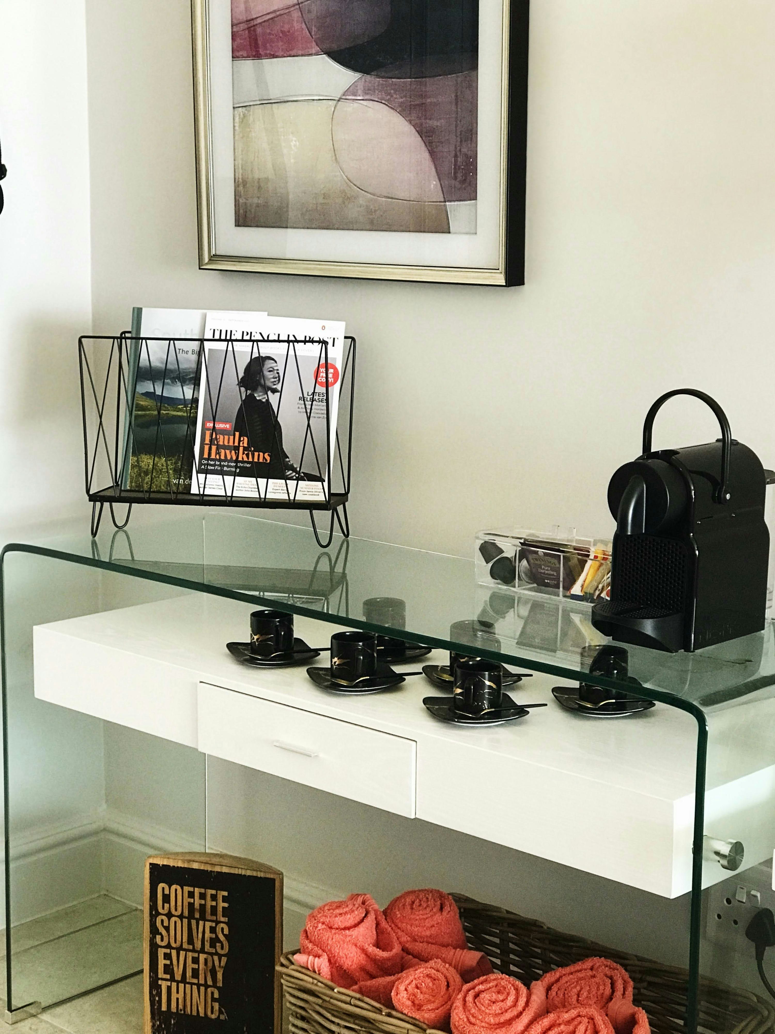 The kitchen is equipped with a stove, oven, fridge-freezer, microwave, coffee- and tea-making facilities, crockery and cutlery.