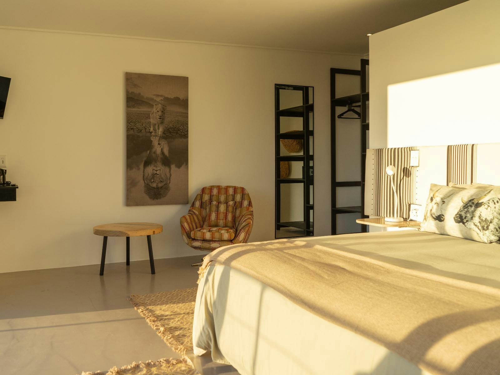 Die kamers het elkeen 'n ekstra lang koninggrootte-bed wat in sommige kamers in 2 enkelbeddens omskep kan word. Elke kamer het ook 'n eko-vriendelike en suite-badkamer met 'n stort, wasbak en 'n toilet. Alle linne en handdoeke word voorsien. Elke kamer het ook 'n plafonwaaier, tee- en koffiemaakgeriewe en 'n slim-TV met toegang tot gratis WiFi sodat gaste programme op hul persoonlike rekeninge kan stroom. Elke kamer bied toegang tot die stoep of dek en het gemaklike sitplek en 'n asemrowende uitsig.