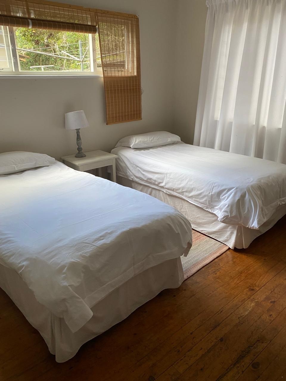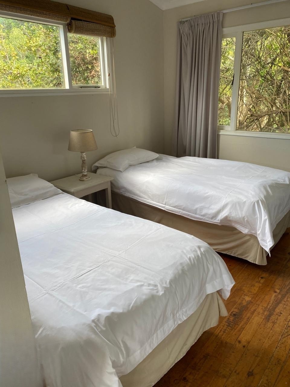 This double-storey duplex can accommodate up to 10 guests and comprises 5 bedrooms, 2 bathrooms and 2 guest toilets. All five of the bedrooms are furnished with 2 single beds. Three of the bedrooms are upstairs and share a bathroom fitted with a shower, while the other 2 bedrooms are downstairs and make use of a bathroom fitted with a bath. Linen and bath towels are provided, however guests are required to bring their own swimming towels.