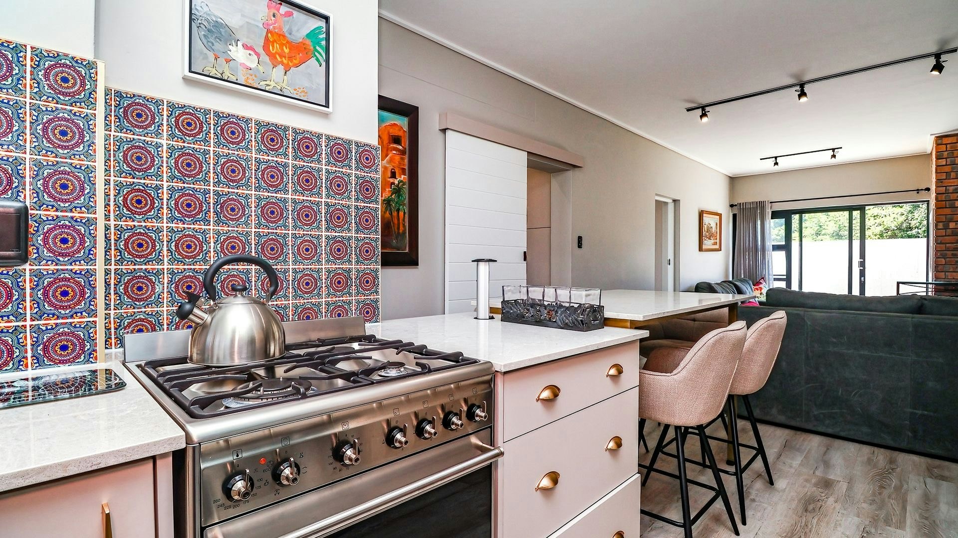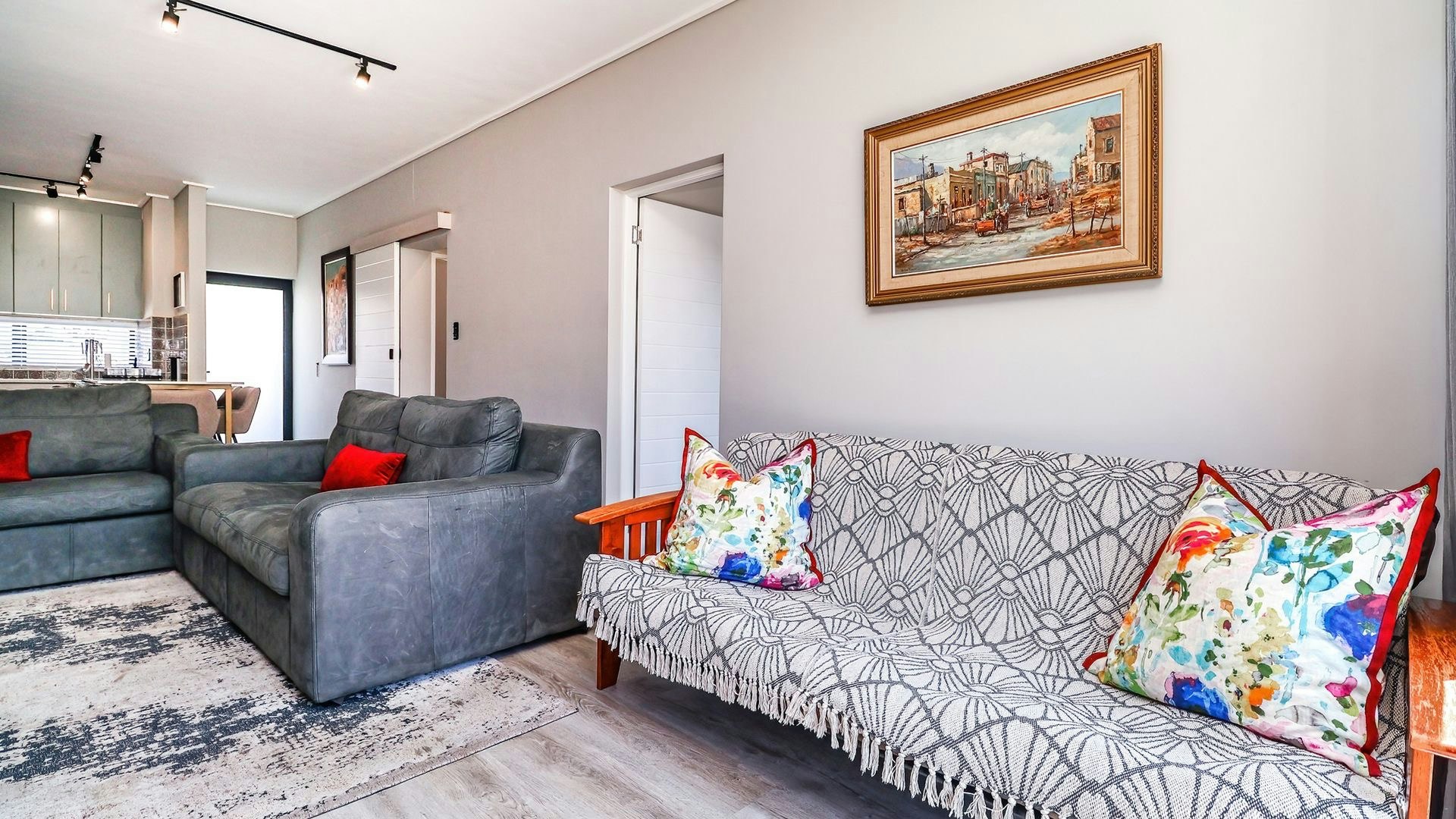 Die oopplan-leefarea sluit 'n volledig toegeruste kombuis in met 'n yskas-vrieskas, gasstoof, oond, mikrogolfoond, lugbraaier, ketel, broodrooster, tee- en koffiemaakgeriewe, skottelgoedwasser, wasmasjien, tuimeldroër, stryktoerusting en basiese kookbenodigdhede. Die kombuis maak oop na 'n sitkamer met gemaklike sofas en 'n slim-TV. Gaste het toegang tot DStv, WiFi, bordspeletjies en leesmateriaal. Die sitkamer lei na 'n ingeboude braai-area met 'n skuifdeur wat na buite oopmaak.