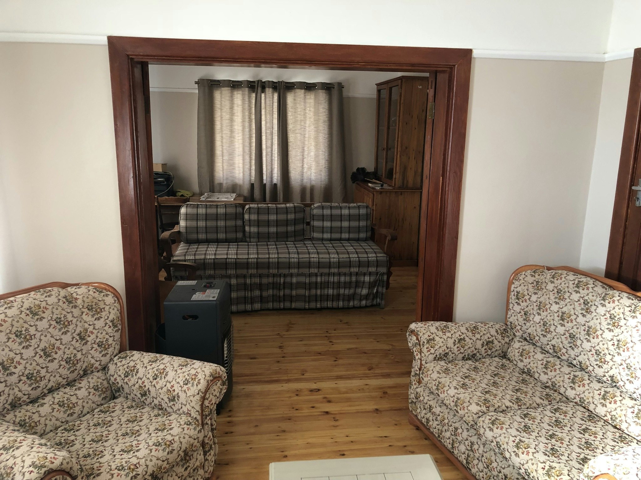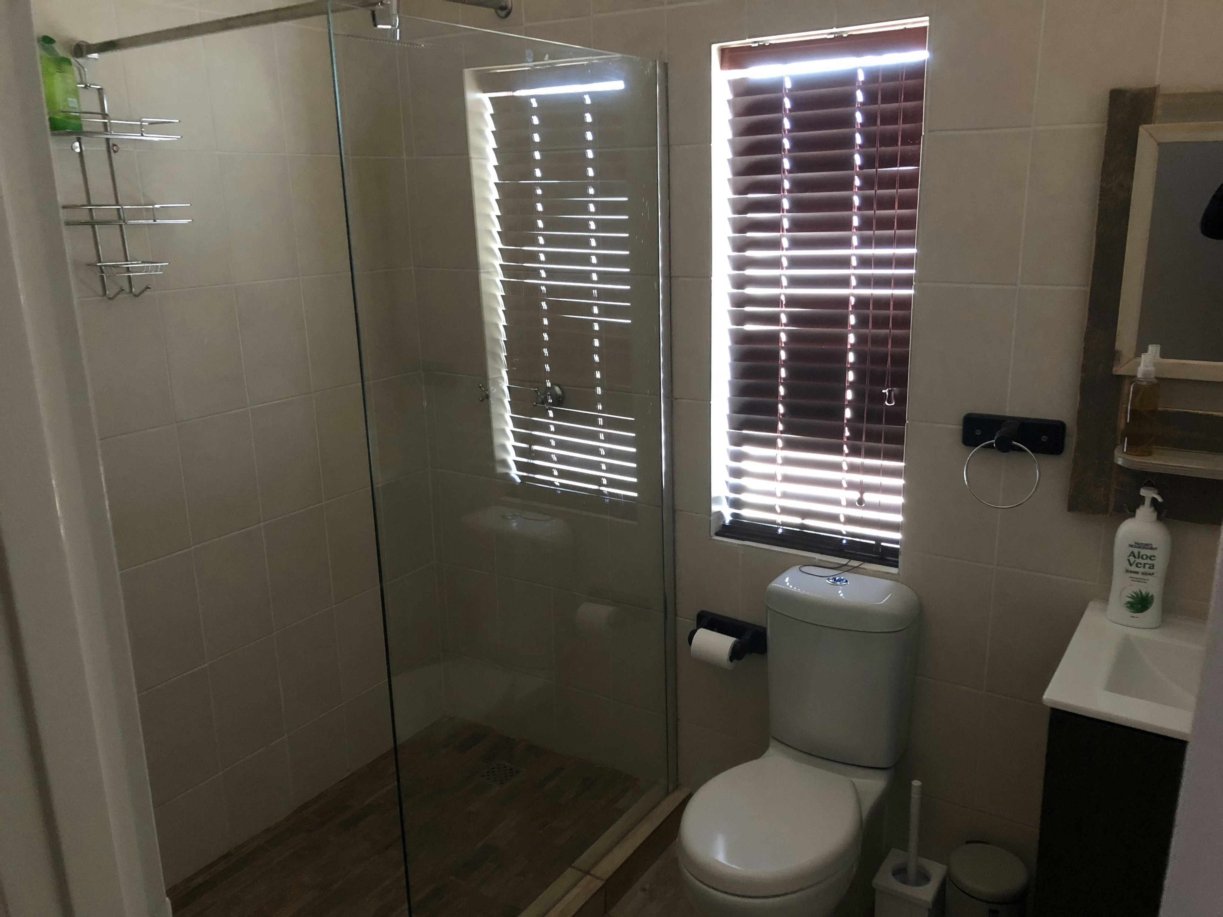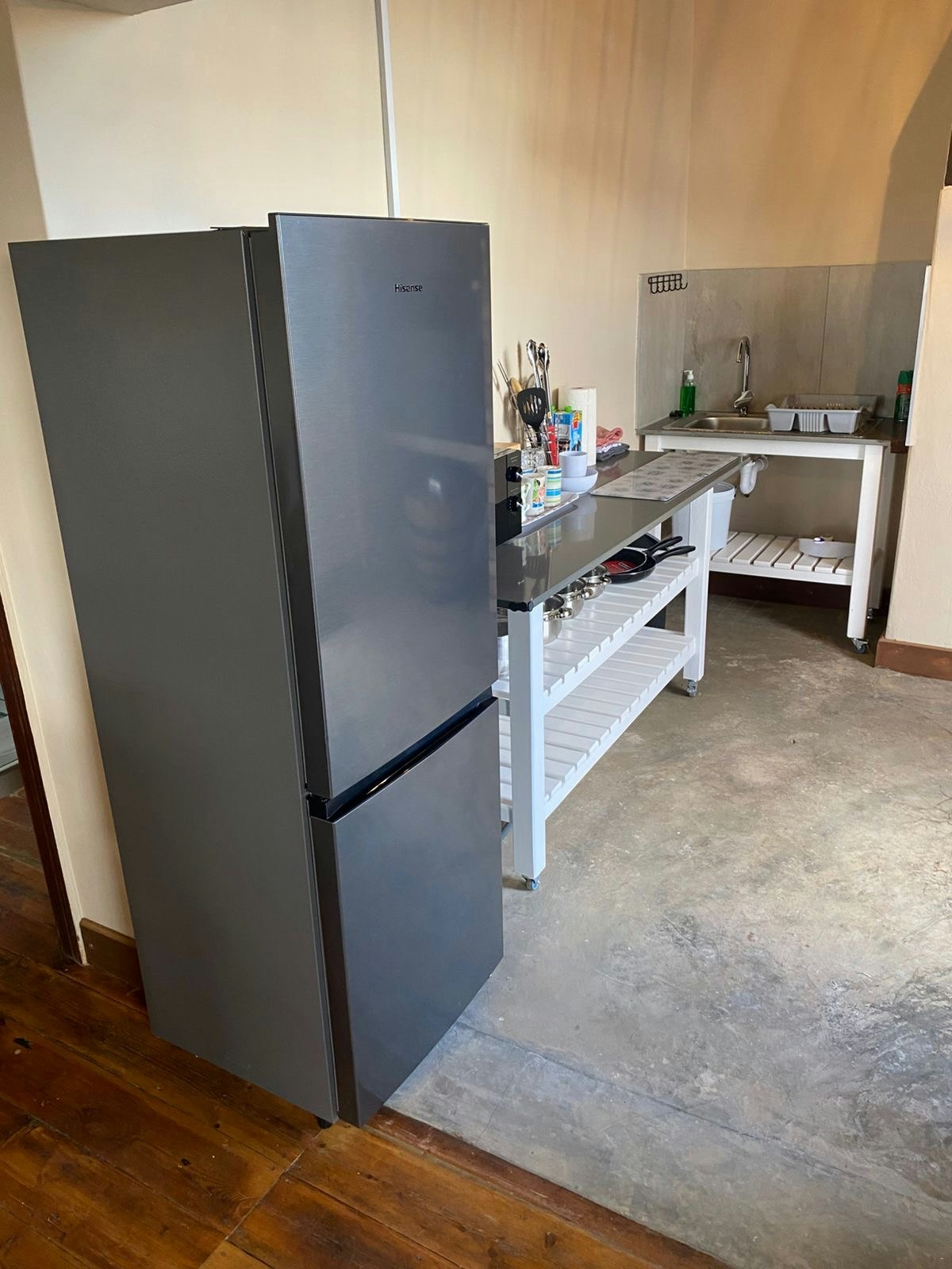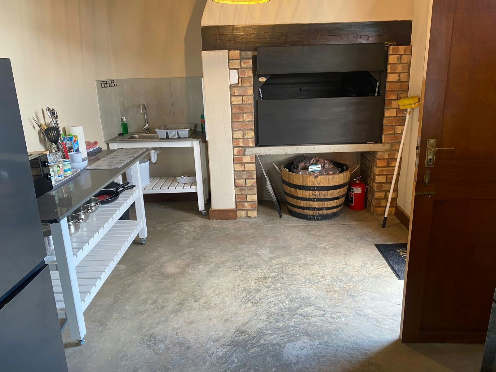 The kitchen is equipped with a fridge, gas stove, oven, and microwave. The lounge offers comfy seating and a TV with DStv. The house opens onto a verandah with outdoor seating and leads to a garden with a firepit where guests can enjoy a braai.
