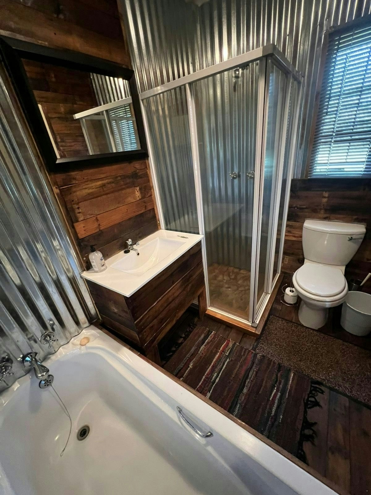 Die oopplan-leefarea in die hoofhuis sluit 'n volledig toegeruste kombuis met 'n stoof, oond, yskas-vrieskas, mikrogolfoond, ketel en al die nodige eetgerei en breekware in. Die eetarea bied ruim sitplek, en die sitkamer het 'n TV en 'n houtkaggel. Gratis WiFi is beskikbaar regdeur die hoofhuis.