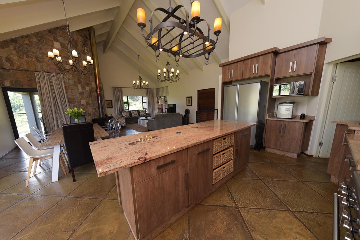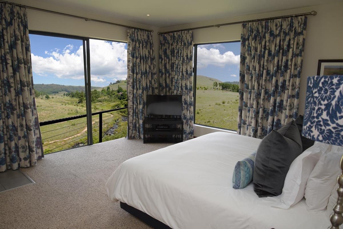 An upstairs balcony offers lovely panoramic views, while an outdoor braai overlooks the rolling estate and meandering river below.