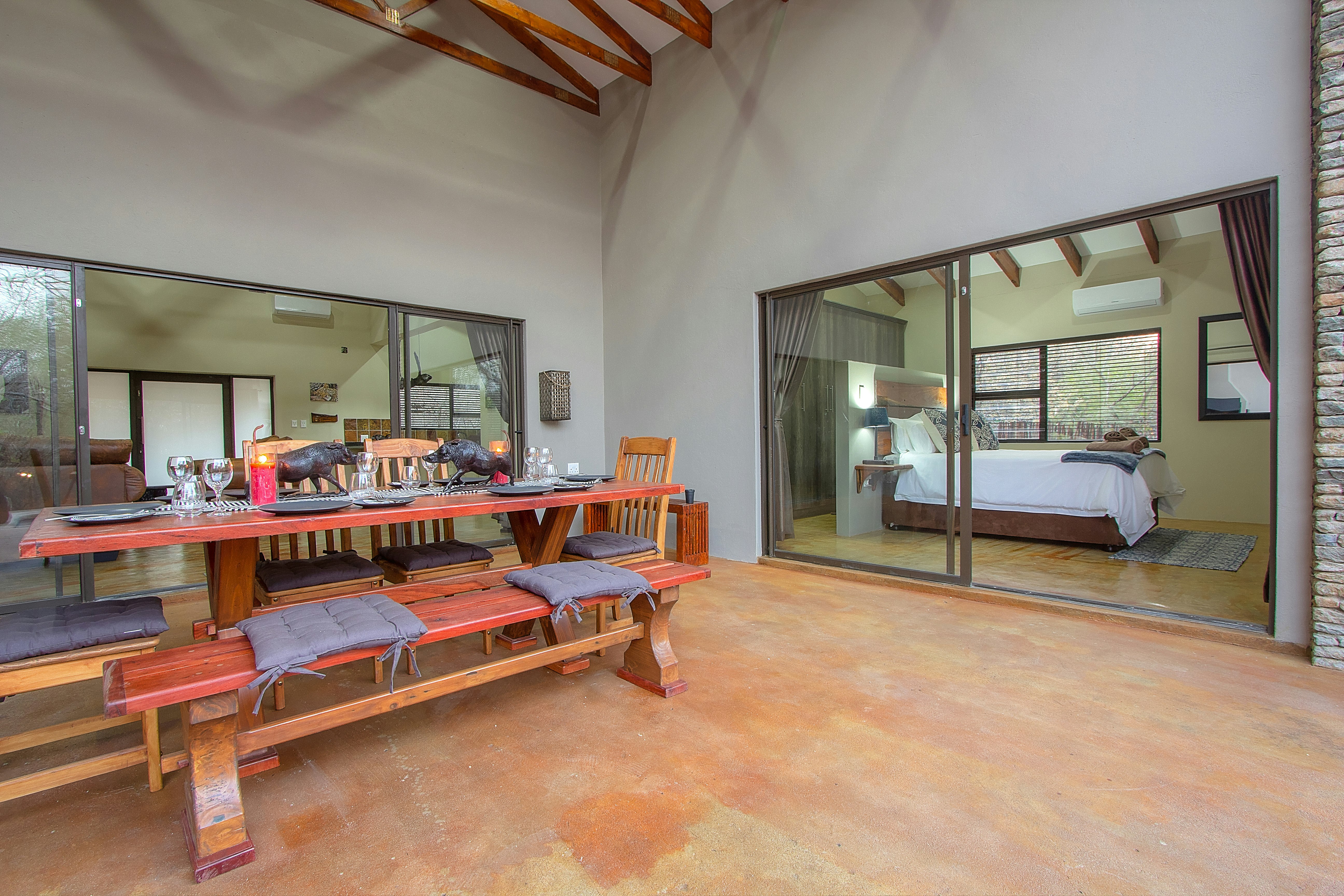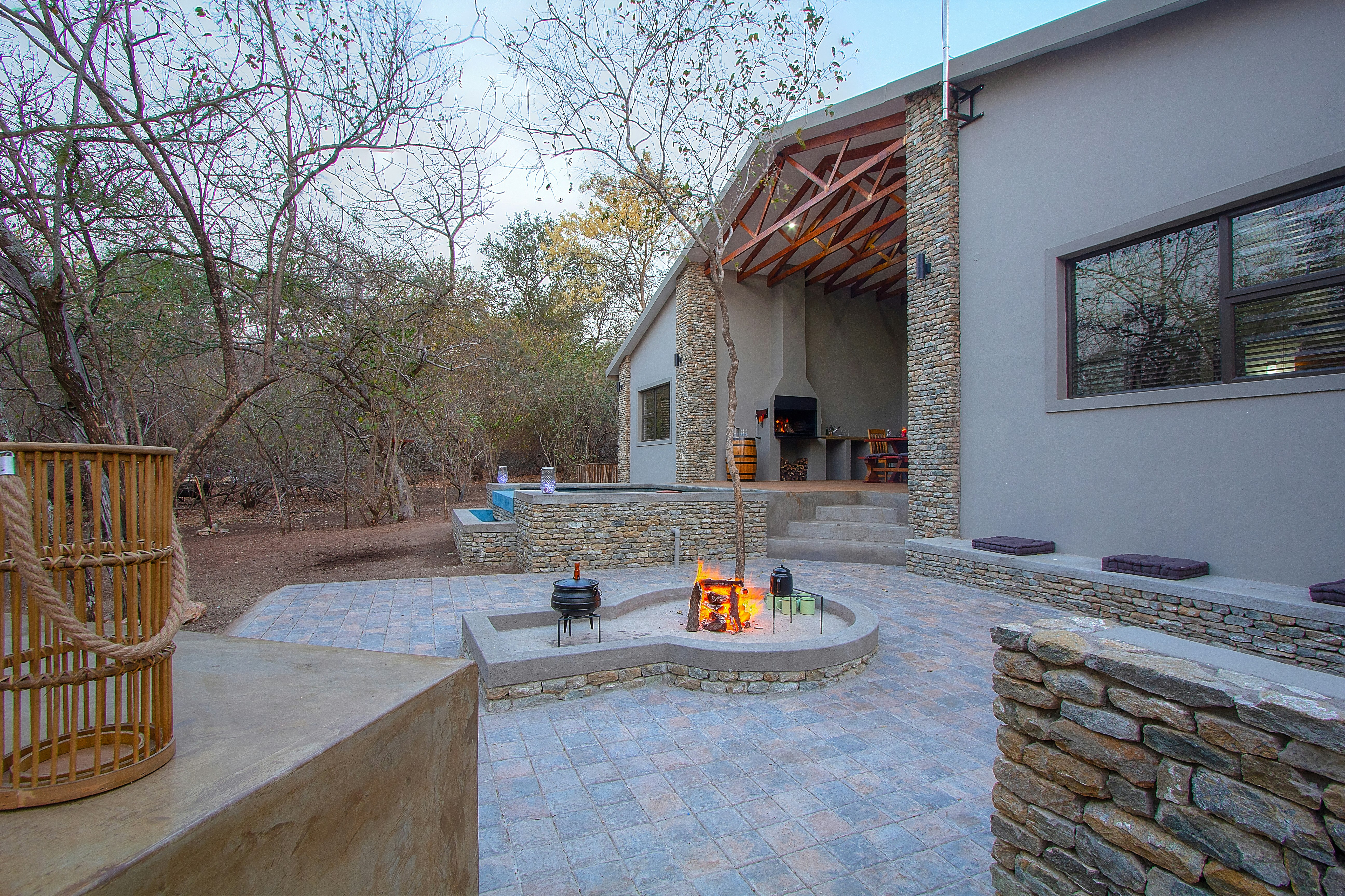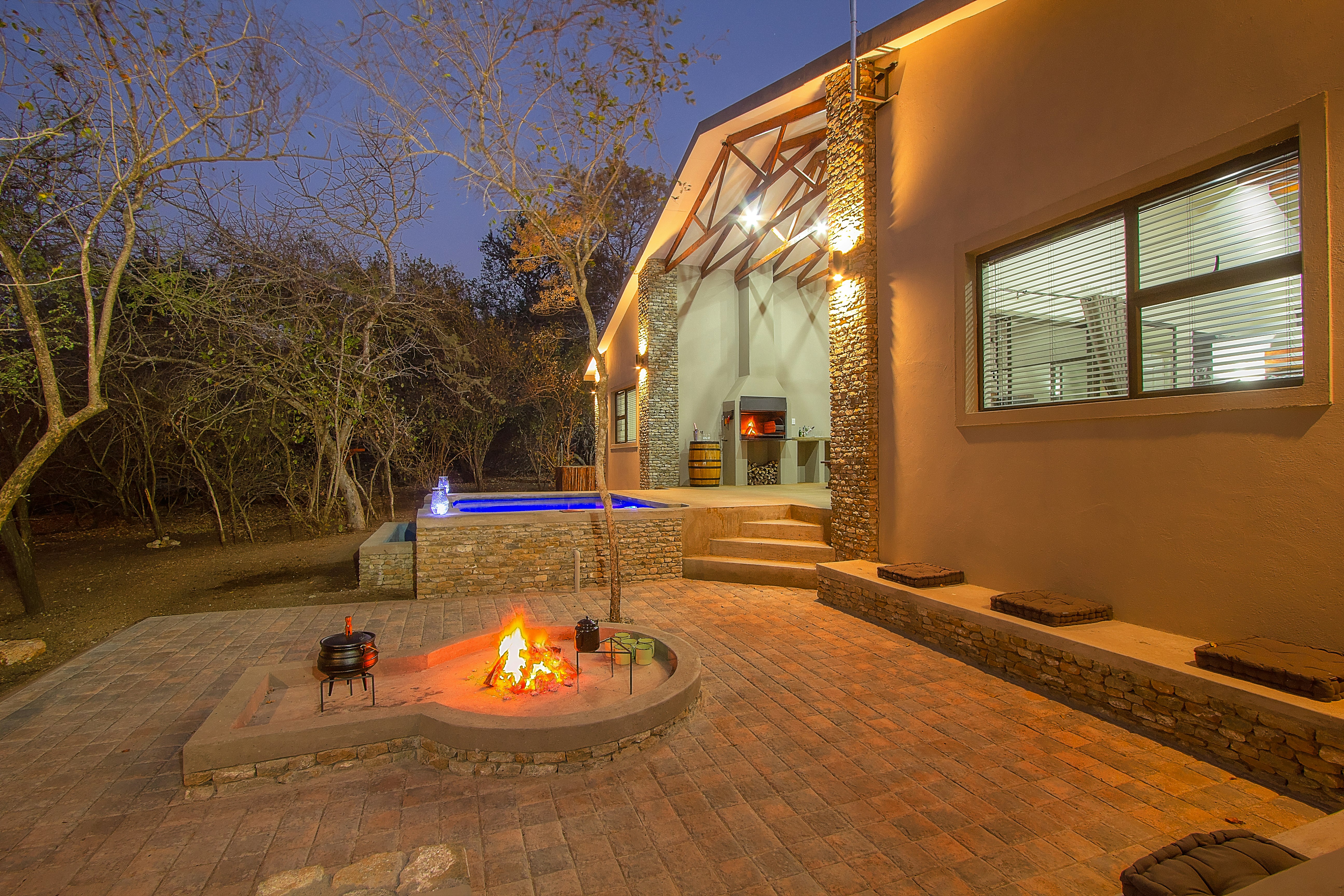 Die hoofslaapkamer en die sitarea het skuifdeure wat na 'n onderdakstoep met 'n groot etenstafel, 'n ingeboude braai, plonspoel, 'n boma met braai-area en vuurput lei. Die stoeparea is gelig en het pragtige uitsigte oor die diere wat verbystap.