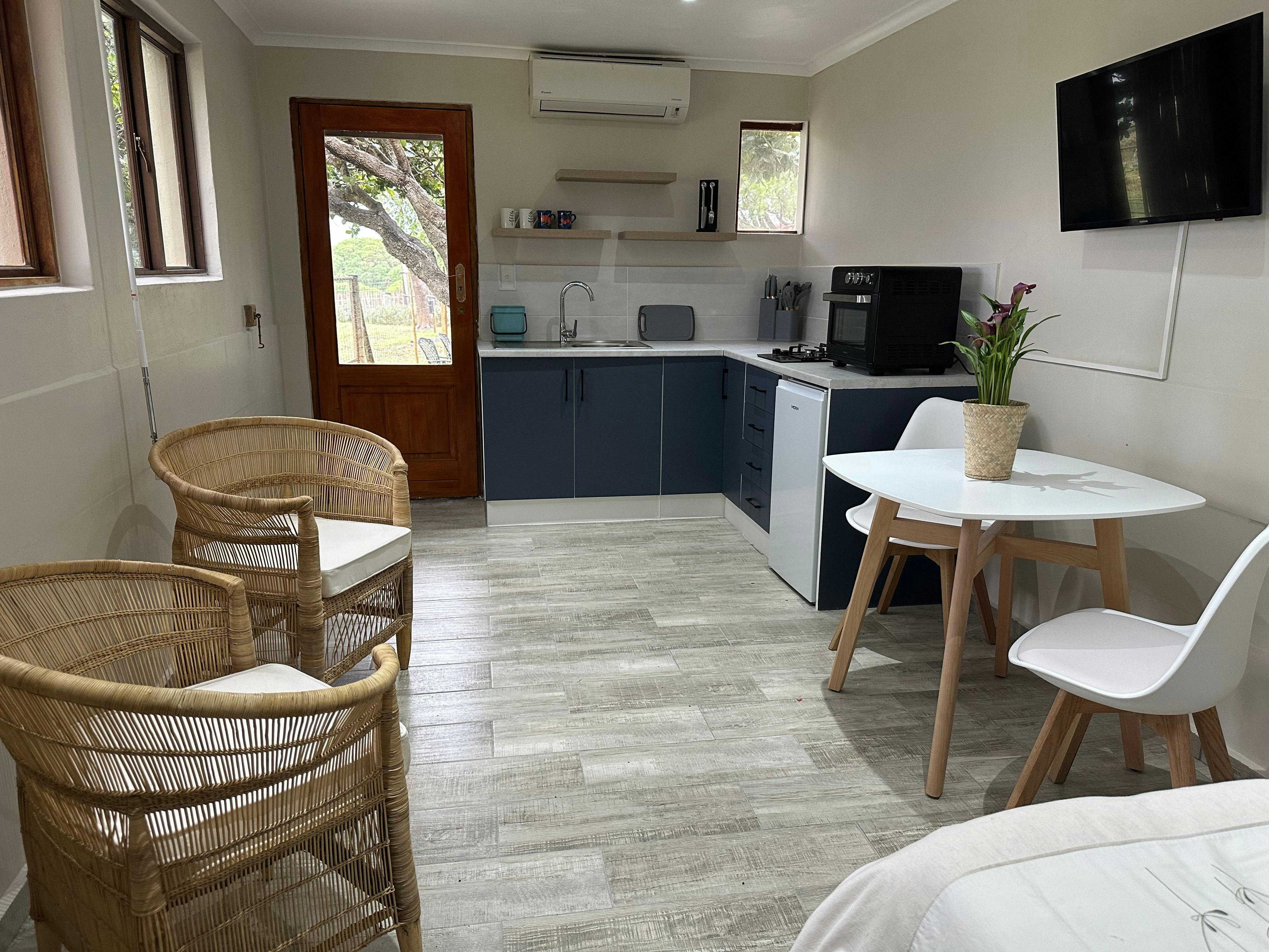 The studio opens onto a private garden with outdoor seating and braai facilities. The premises are home to alpacas, dogs, and numerous chickens. Secure parking and free Wi-Fi are available to guests during their stay.