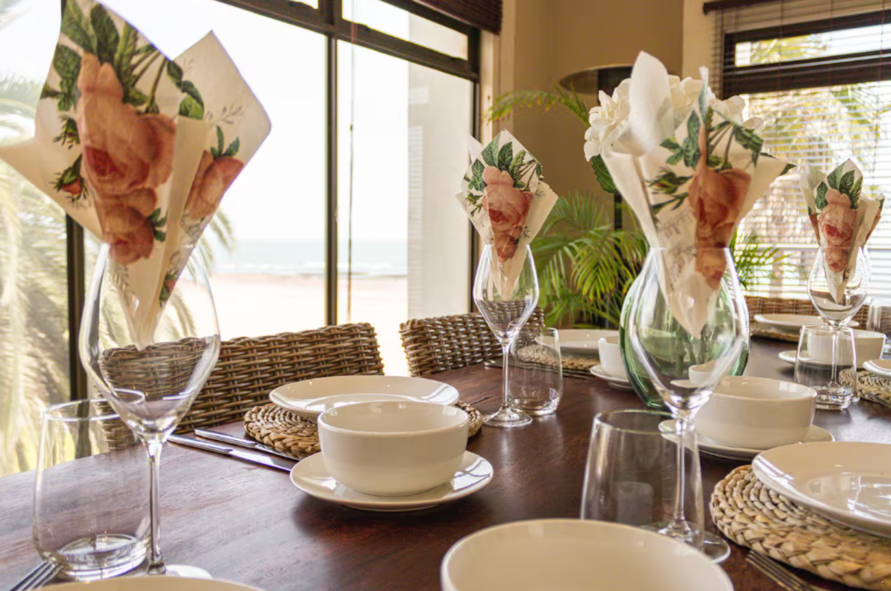 Ontspan op die ruim, skaduryke patio met buite-eetplek – perfek vir etes saam met geliefdes – insluitend sonstoele met uitsig oor die see.