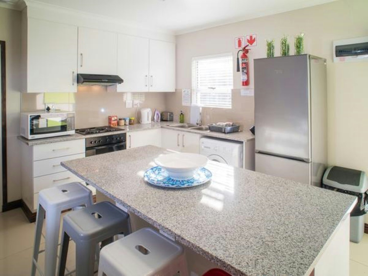 Dié huis bied slaapplek aan 10 gaste en beskik oor 5 slaapkamers en 5 en suite-badkamers. Dit is ideaal vir 'n gesinswegbreek, sakereisigers en gaste wat korttermynverblyf soek. Die hoof- en tweede slaapkamers het elk 'n koninggrootte-bed en die derde, vierde en vyfde slaapkamers het elk 2 enkelbeddens. Die en suite-badkamers het storte, wasbakke en toilette. Linne en handdoeke word voorsien.