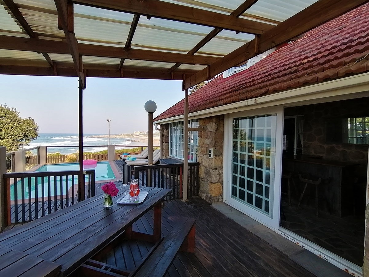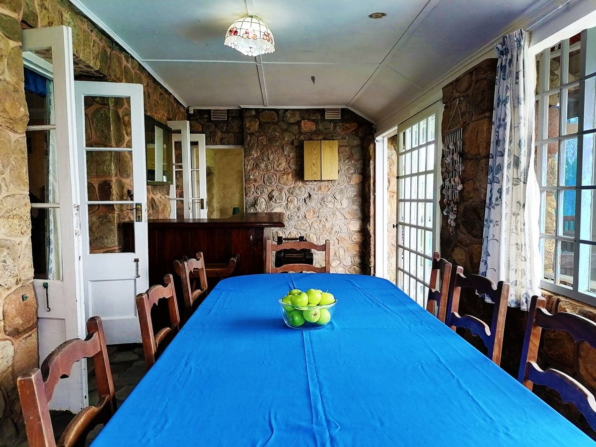 Outside is a covered patio with an outdoor dining table and a built-in braai. This patio leads to a swimming pool with sun loungers which is a great spot for guests to relax and catch some sun.