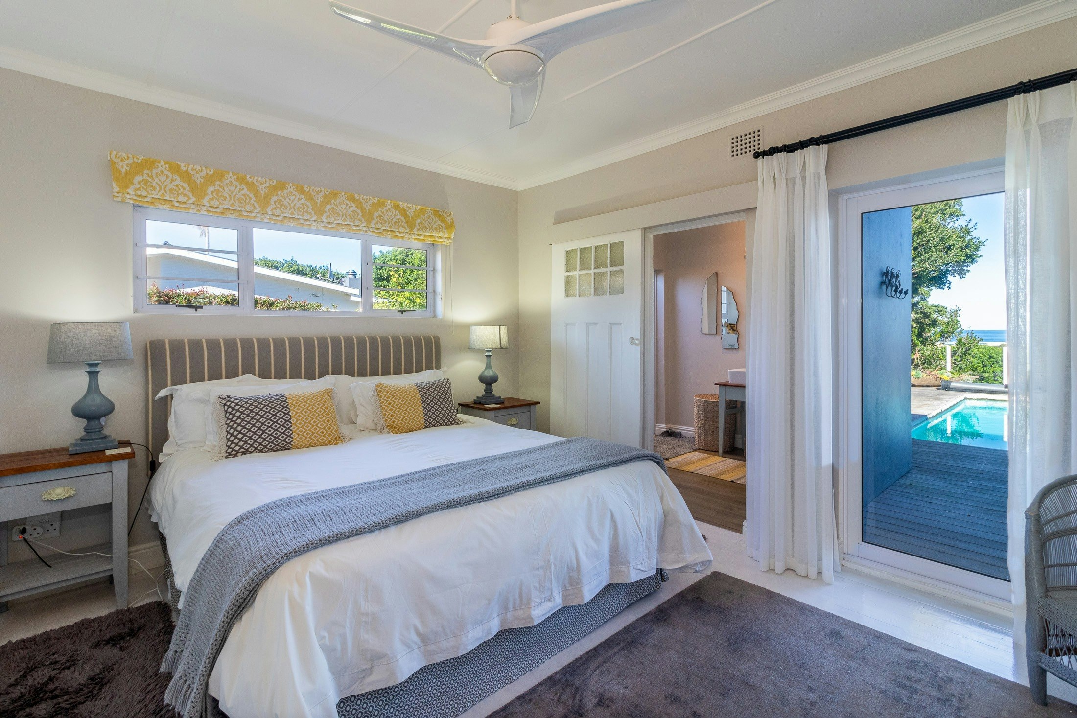 The property can accommodate up to 12 guests, split between the main house and a cottage. The main house sleeps 8 guests across 4 bedrooms, each with its own bathroom. The main bedroom is furnished with a king-size bed, features an en-suite bathroom with a shower, and opens onto a private terrace with panoramic views of the river mouth and ocean. The second bedroom has 2 single beds and shares a bathroom fitted with a bath and shower. The third bedroom includes a king-size bed and an en-suite bathroom with an enclosed outdoor shower, while the fourth bedroom offers a king-size bed that can be converted into 2 singles and an en-suite bathroom with a shower. The cottage accommodates 4 guests in 2 bedrooms, one with a queen bed and the other with 2 single beds, sharing a bathroom with a shower.
