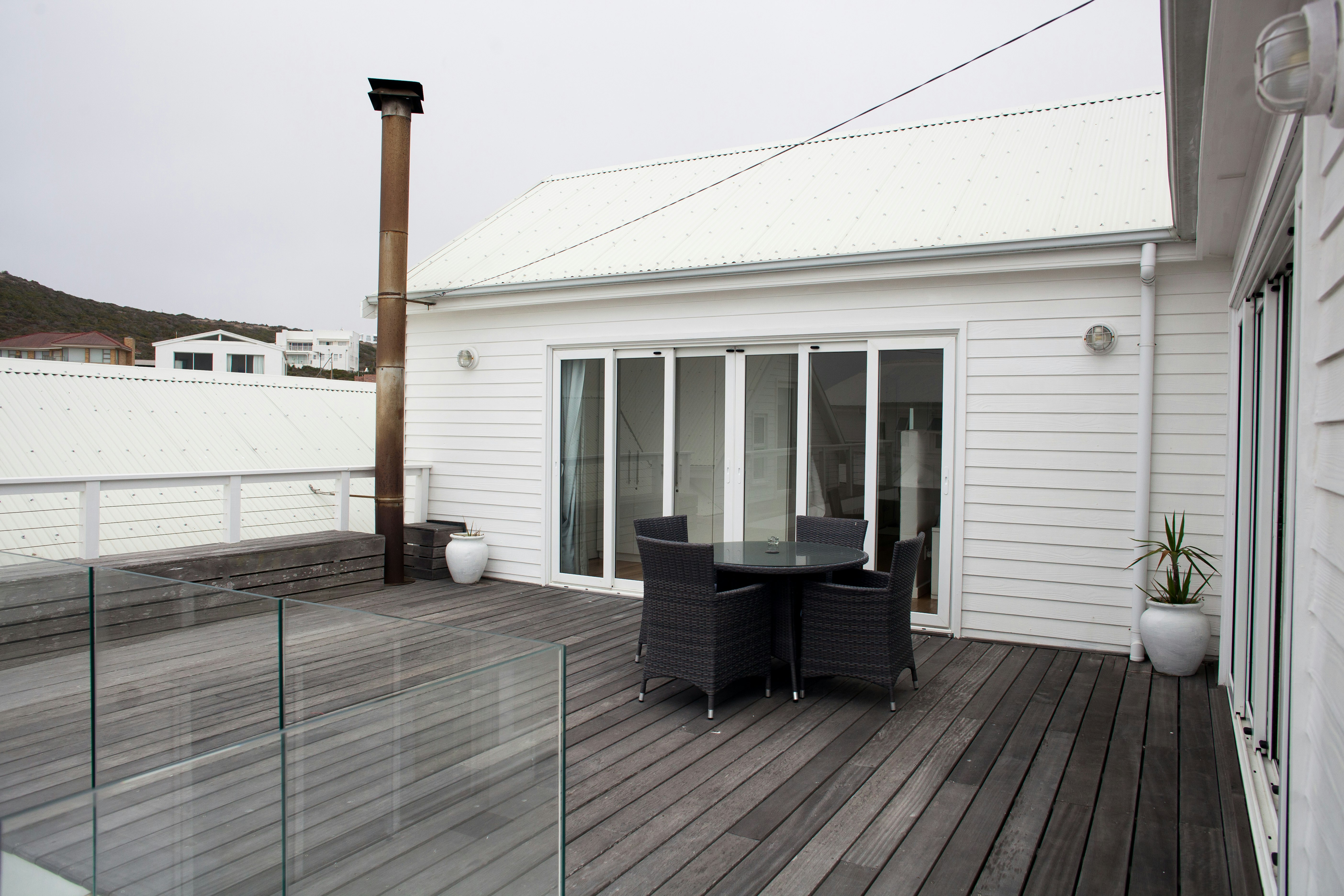 Die moderne ontwerperskombuis is toegerus met 'n stoof, 'n oond, 'n yskas, eetgerei en breekware, sowel as tee- en koffiemaakgeriewe, en maaltye kan by die ontbyttoonbank of eetkamertafel met sitplek vir 10 geniet word. Die sonnige sitkamer is toegerus met 'n TV en maak oop na die houtdek met uitsig oor die strand, oseaan en omgewing.