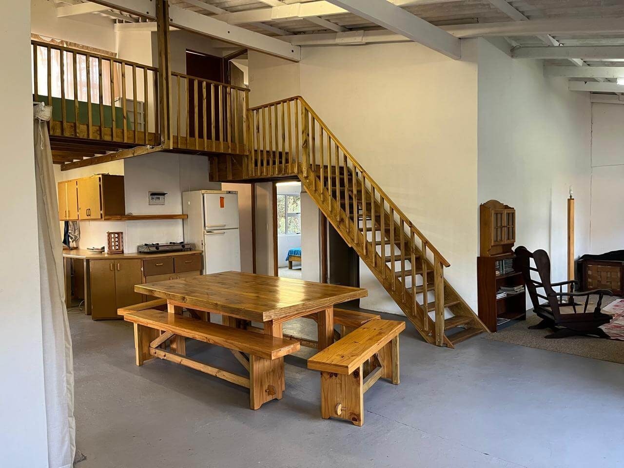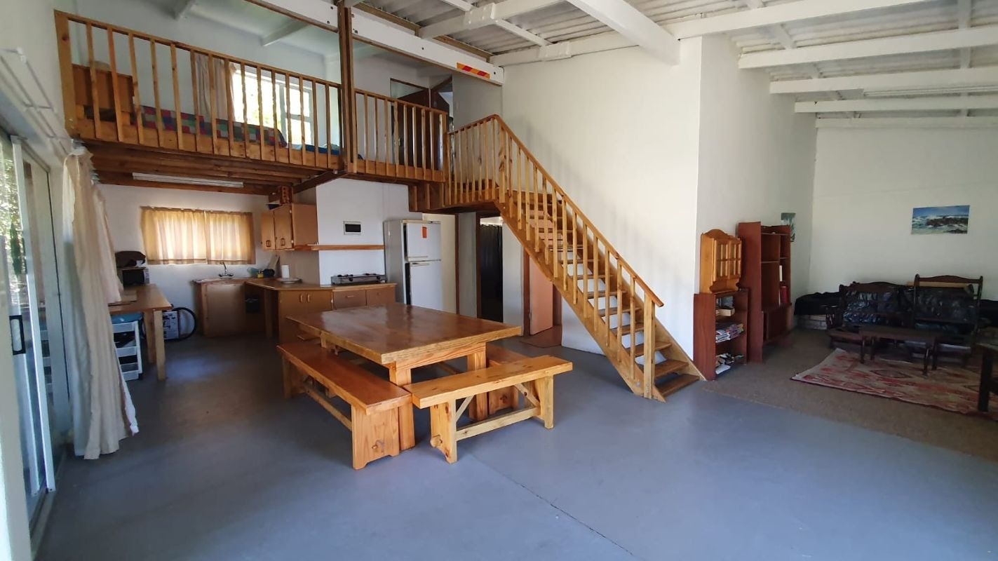 The open-plan living area offers a kitchen equipped with a fridge/freezer, 2-plate stove, microwave, cutlery, crockery, and utensils. The dining area offers a dining table that can accommodate 8 guests and flows into the living area, which is furnished with comfortable seating and leads out to the garden.