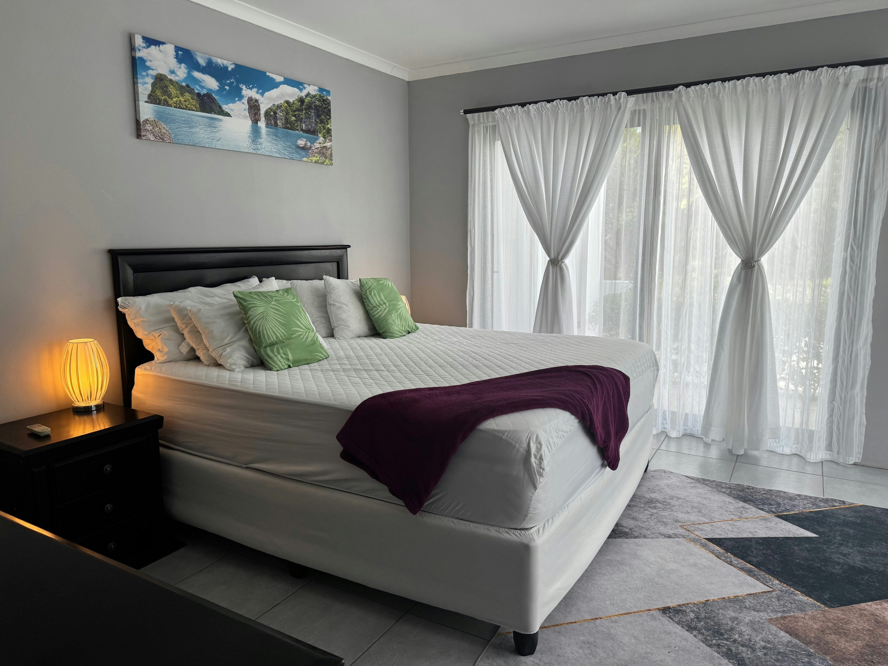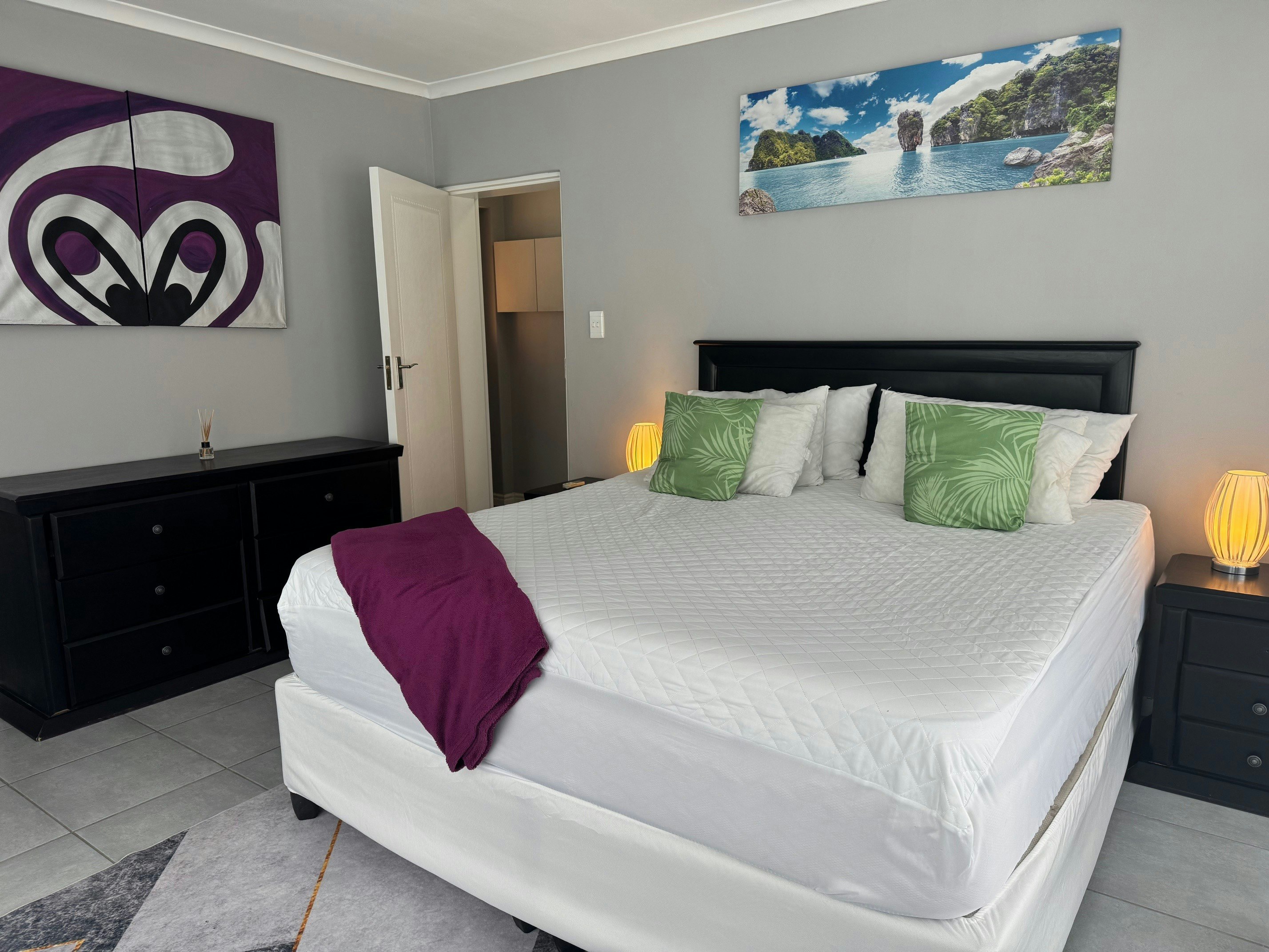 The open-plan living area features a fully equipped kitchen with a stove, oven, microwave, fridge-freezer, cutlery, crockery, and tea- and coffee-making facilities. Just off the kitchen is a 2-seater dining table and a lounge with comfortable couches and a wall-mounted TV offering a selection of DStv channels. Free Wi-Fi is available.