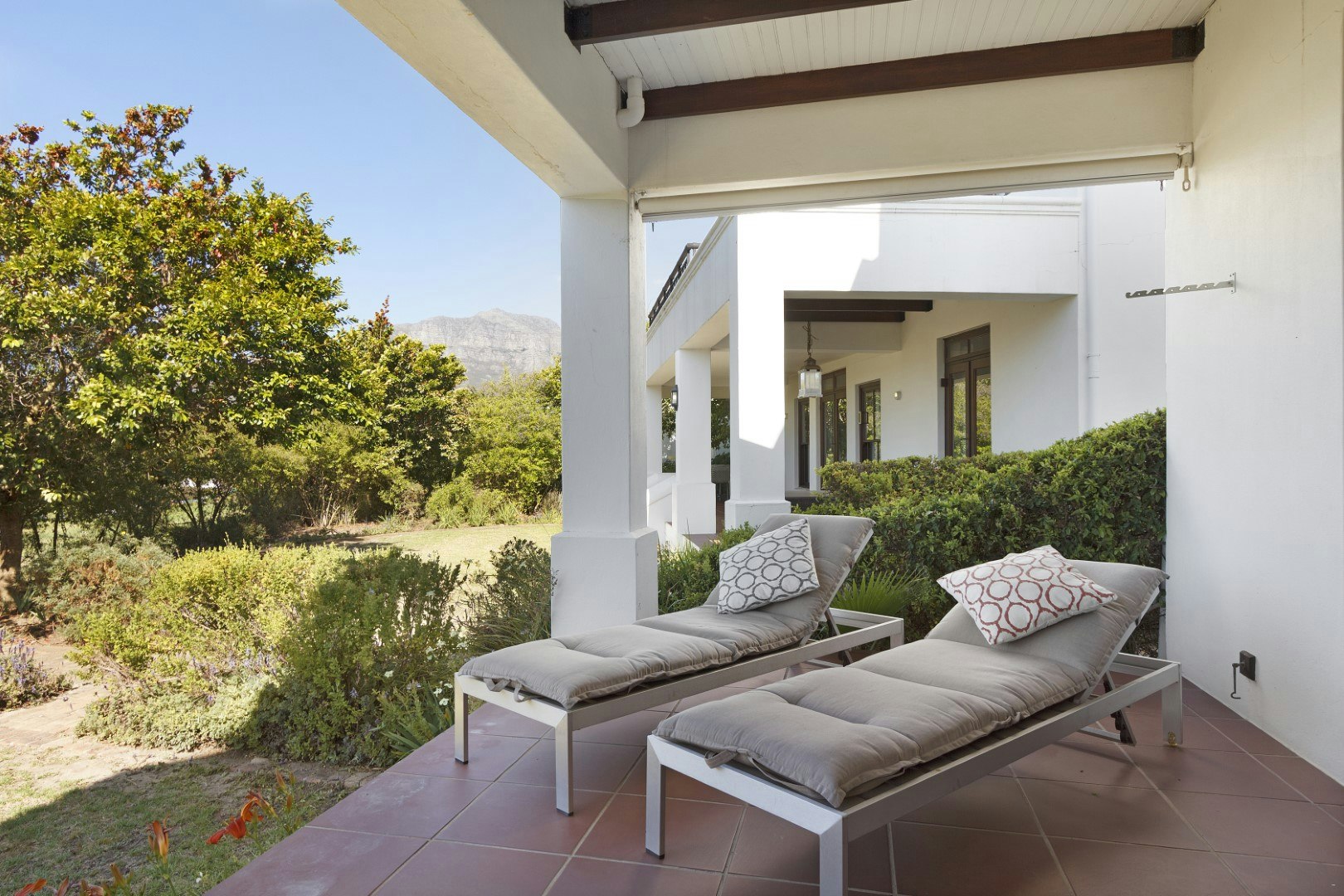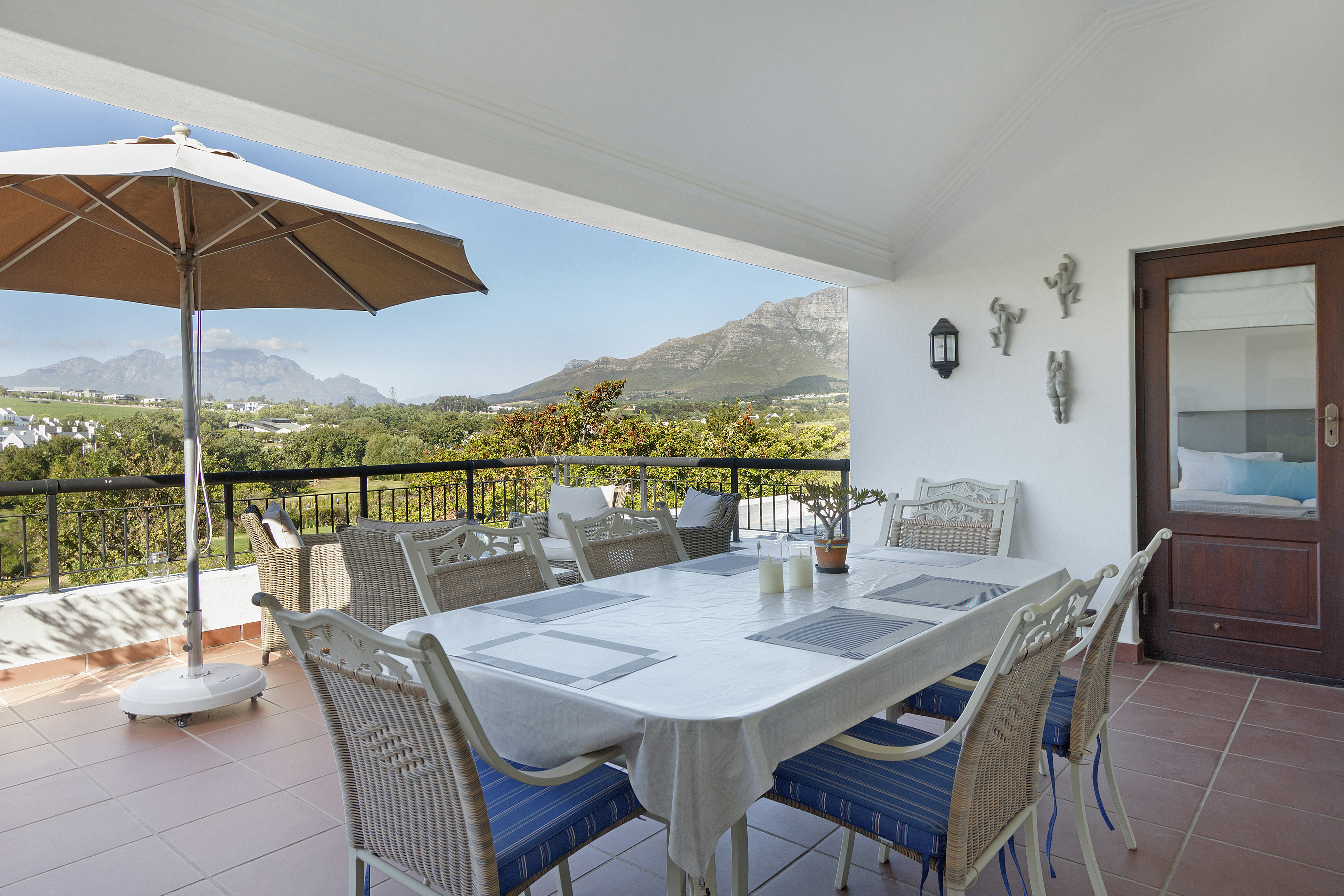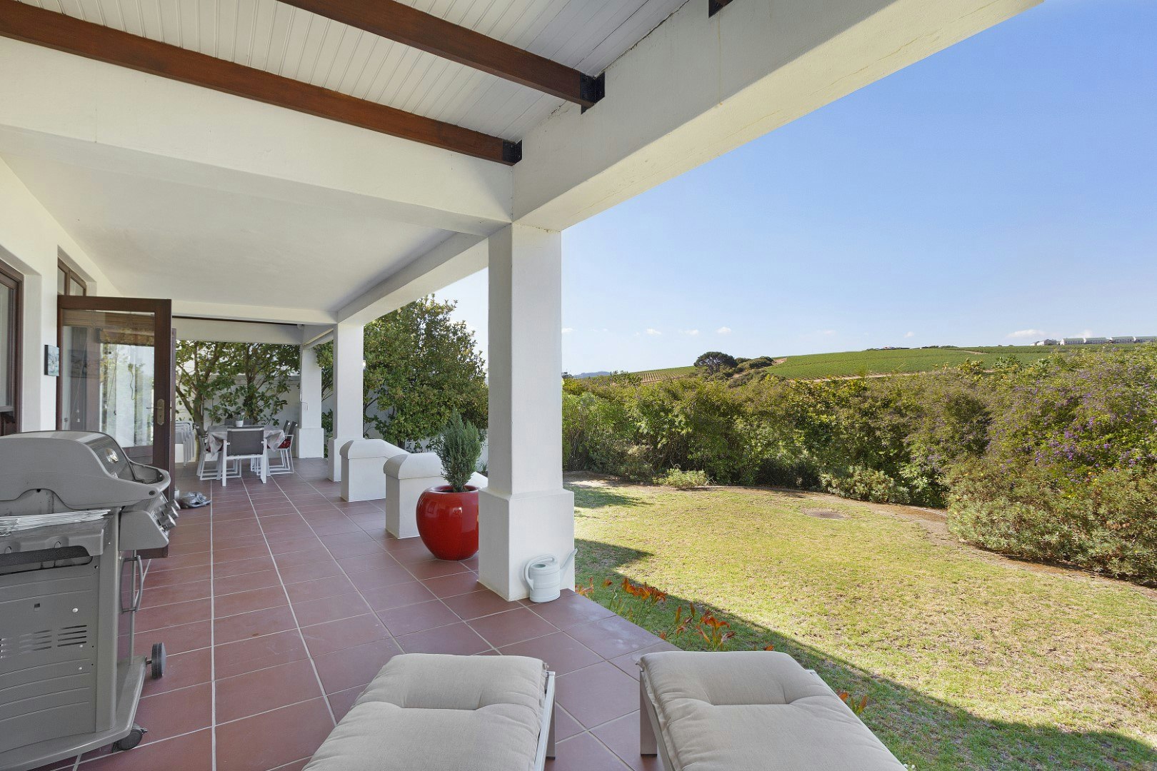 Die dubbeldeure lei na 'n beskutte stoep met 'n etenstafel, gasbraai en sonstoele waar gaste kan ontspan. Die boonste verdieping lei na 'n lieflike balkon met nog 'n etenstafel, 'n sitarea en 'n ingeboude braai sowel as 'n uitsig oor die landgoed.