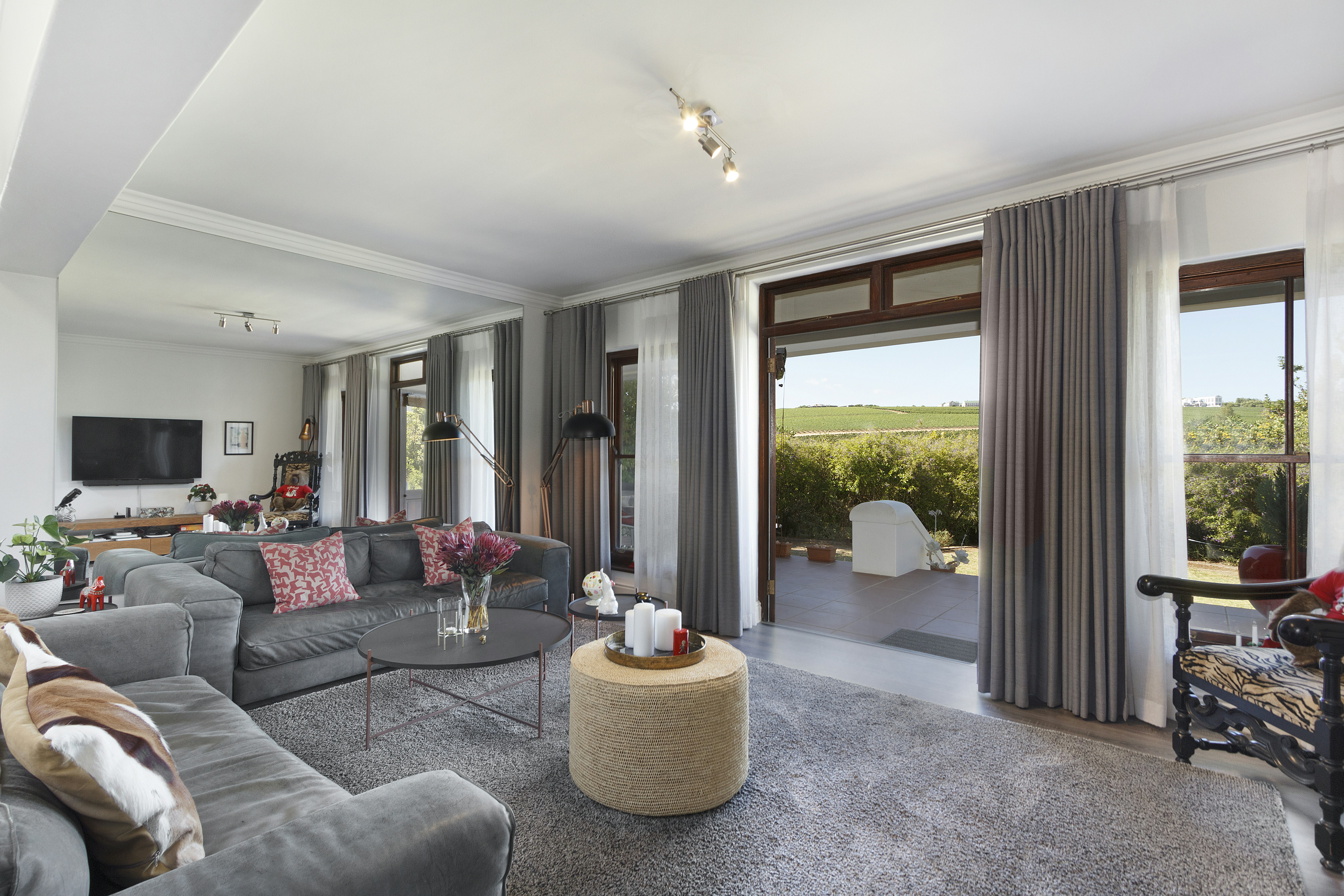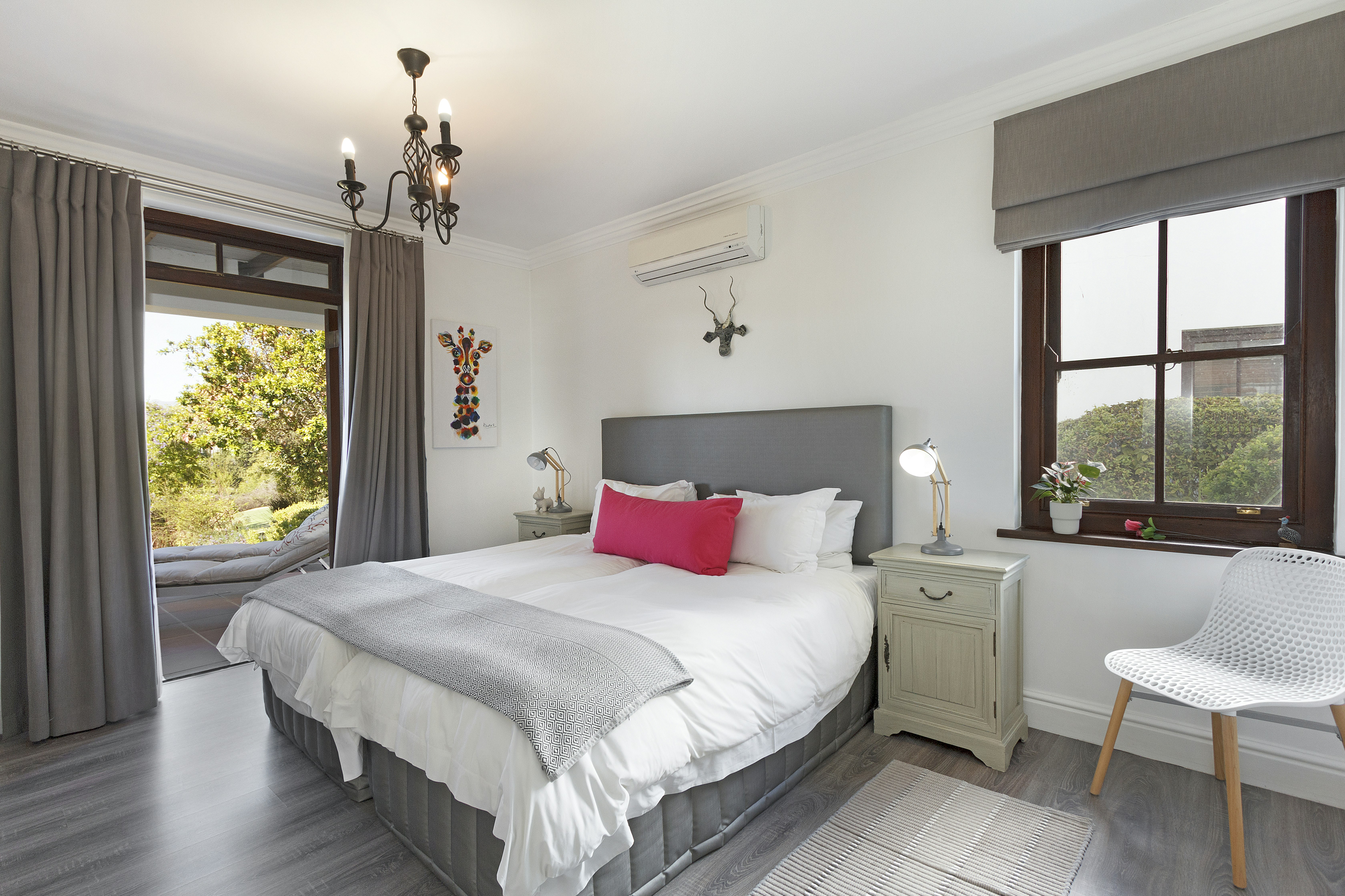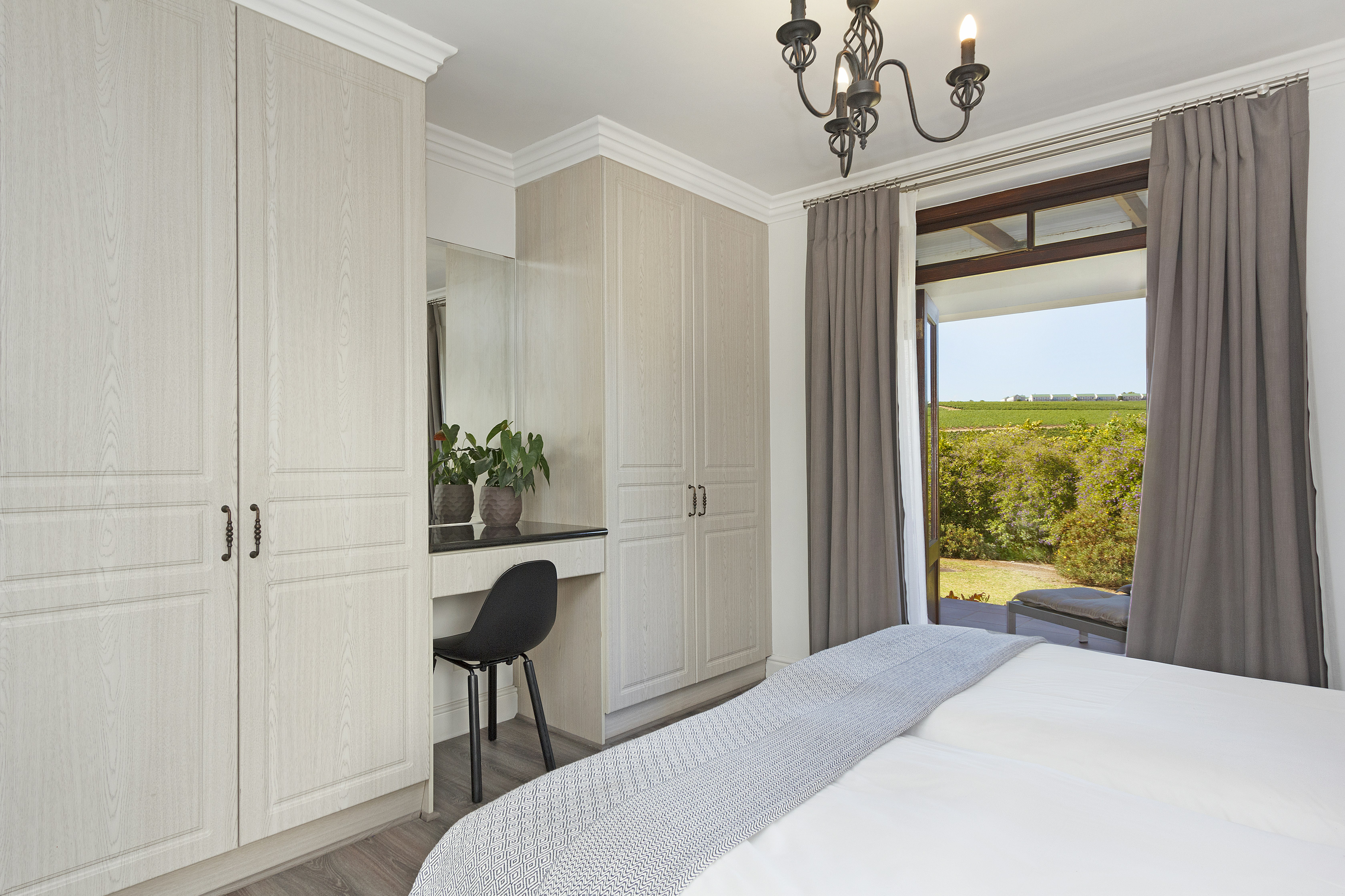 Die dubbeldeure lei na 'n beskutte stoep met 'n etenstafel, gasbraai en sonstoele waar gaste kan ontspan. Die boonste verdieping lei na 'n lieflike balkon met nog 'n etenstafel, 'n sitarea en 'n ingeboude braai sowel as 'n uitsig oor die landgoed.