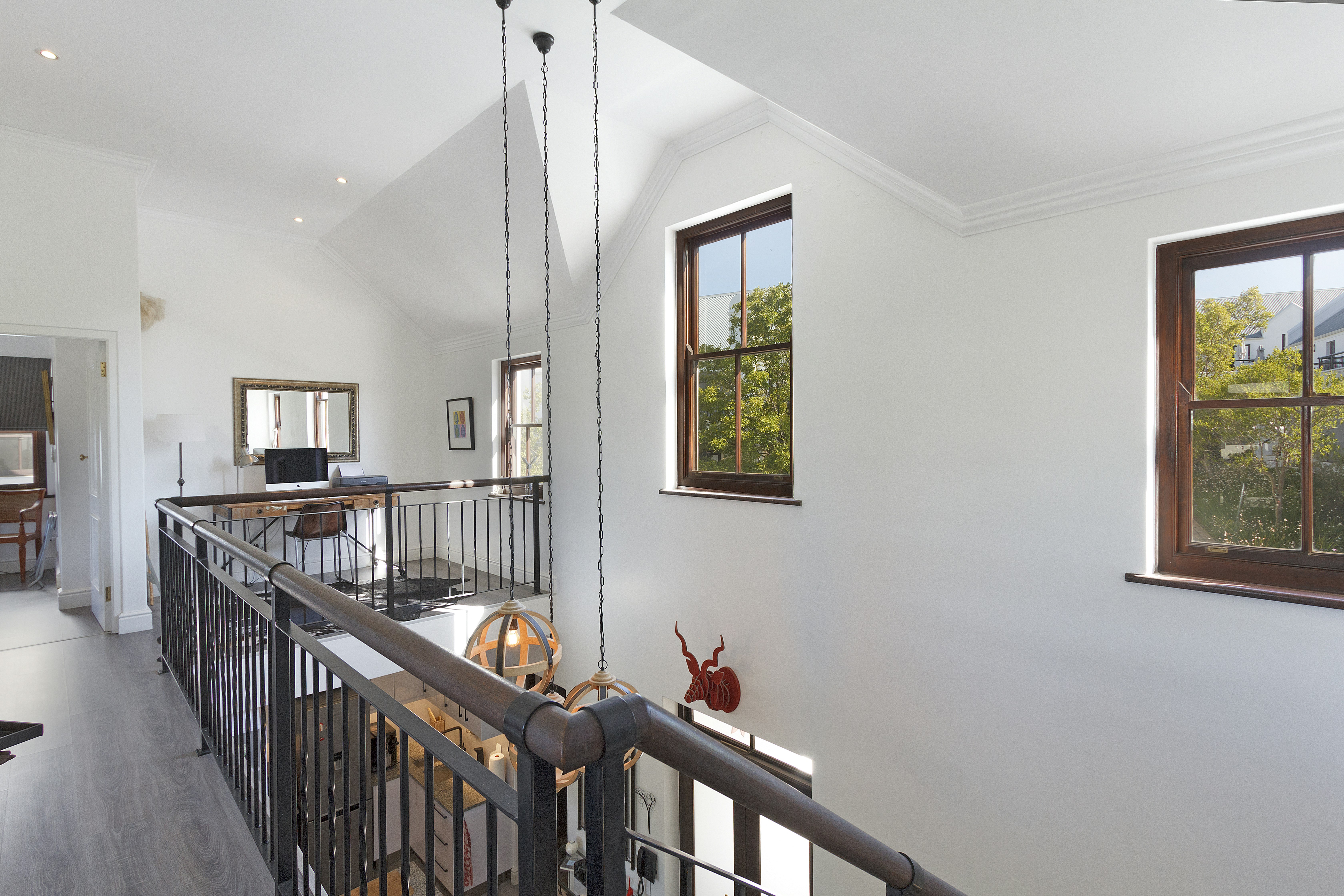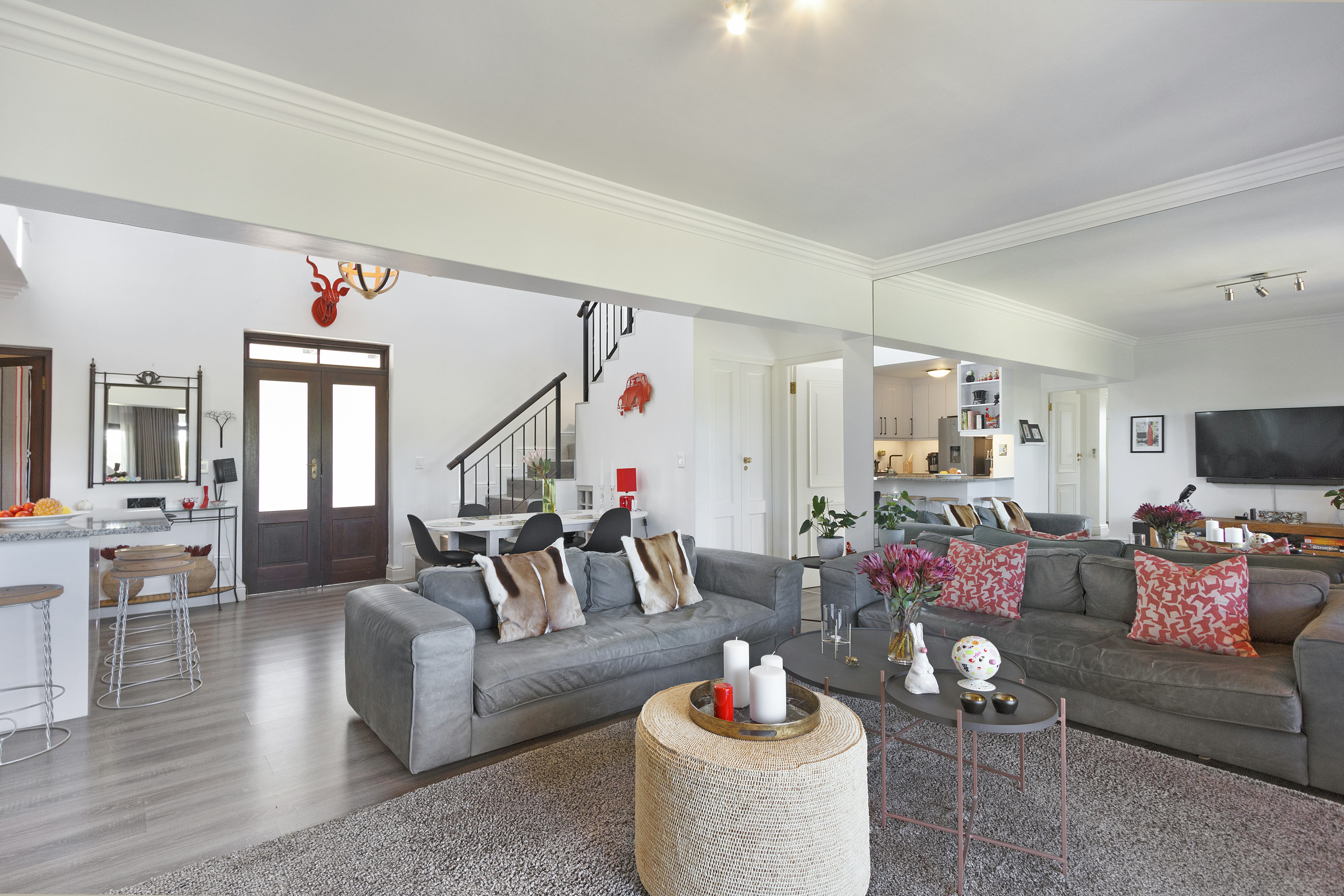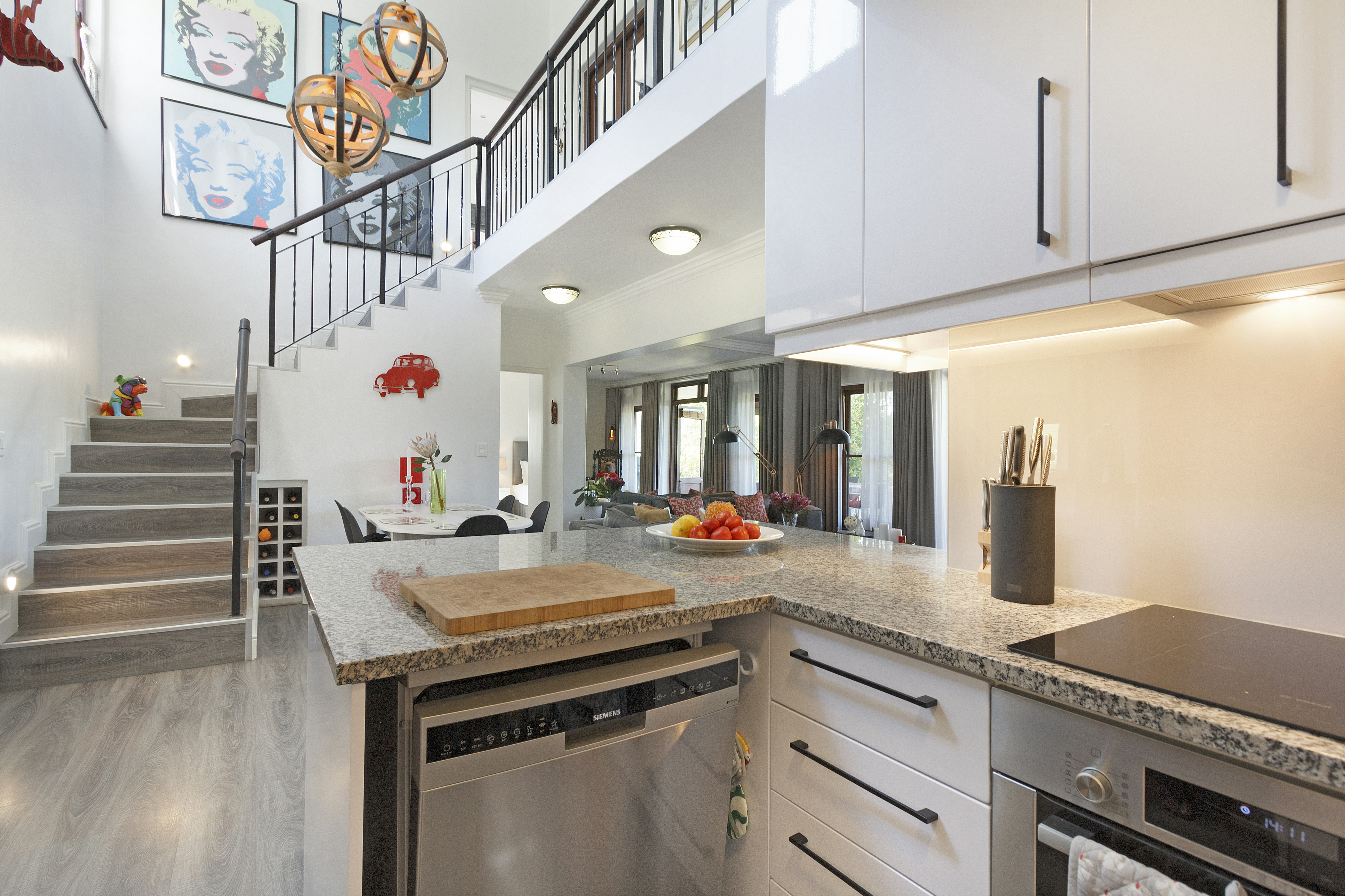 Die oopplan-leefarea beslaan die grondverdieping en het 'n kombuis wat met 'n stoof, oond, mikrogolfoond, yskas-vrieskas, koffiemasjien, skottelgoedwasser, eetgerei, breekware en 'n ontbyttoonbank met stoele toegerus is. Die kombuis lei na 'n etenstafel en 'n ruim sitarea met gemaklike sitplek en 'n TV met die volle DStv-pakket. Vir dié wat wil werk, is 'n lessenaar en gratis WiFi beskikbaar.