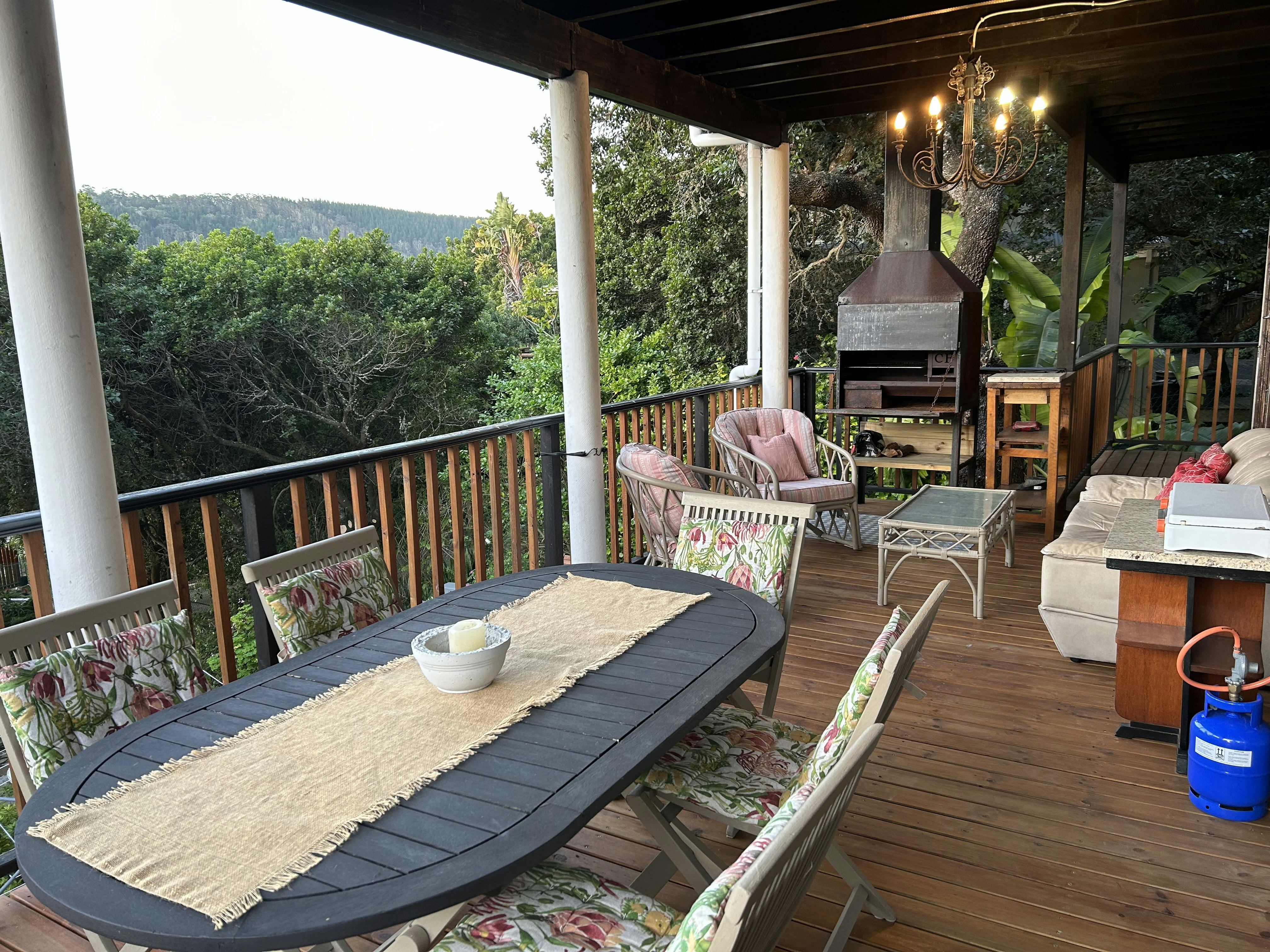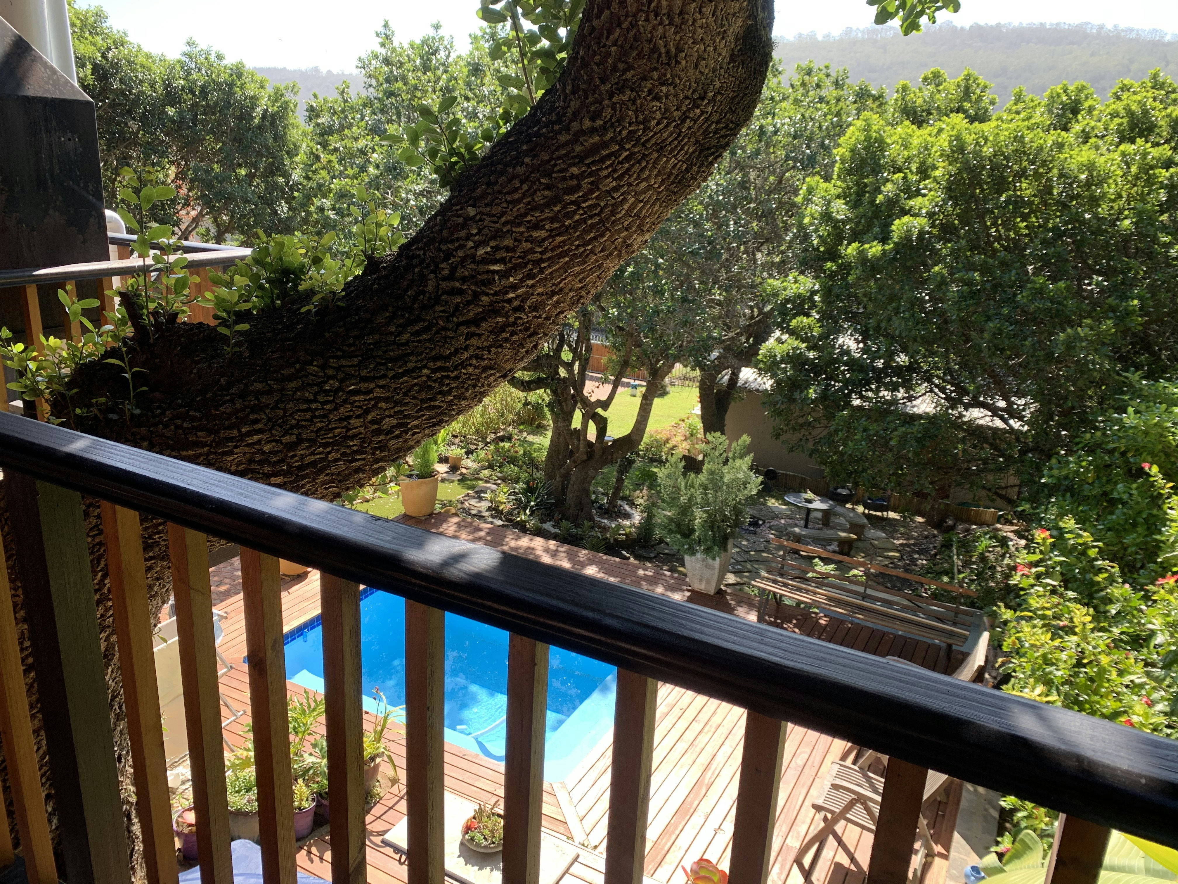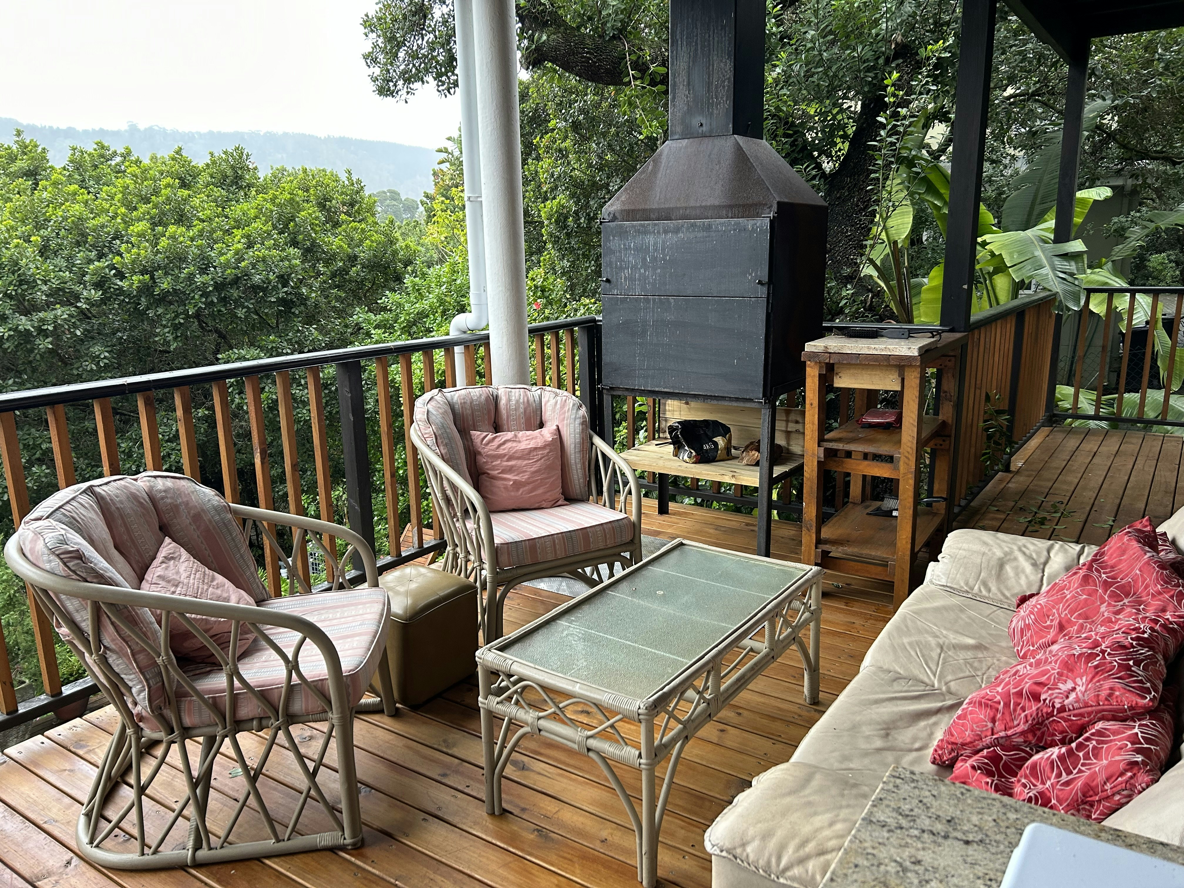 Apartment Downstairs is die laer woonstel in 'n houthuis tussen die bome. Die eenheid het 2 slaapkamers, 2 badkamers, sonkrag en 'n plonspoel met sonstoele op 'n dek. Daar is 9 trappies na die balkon met gemakstoele, 'n etenstafel, stoele en 'n ingeboude braai met 'n uitsig op die lieflike tuin en berge. Daar is veilige parkeerplek vir 2 voertuie agter ’n afstandbeheerde hek.