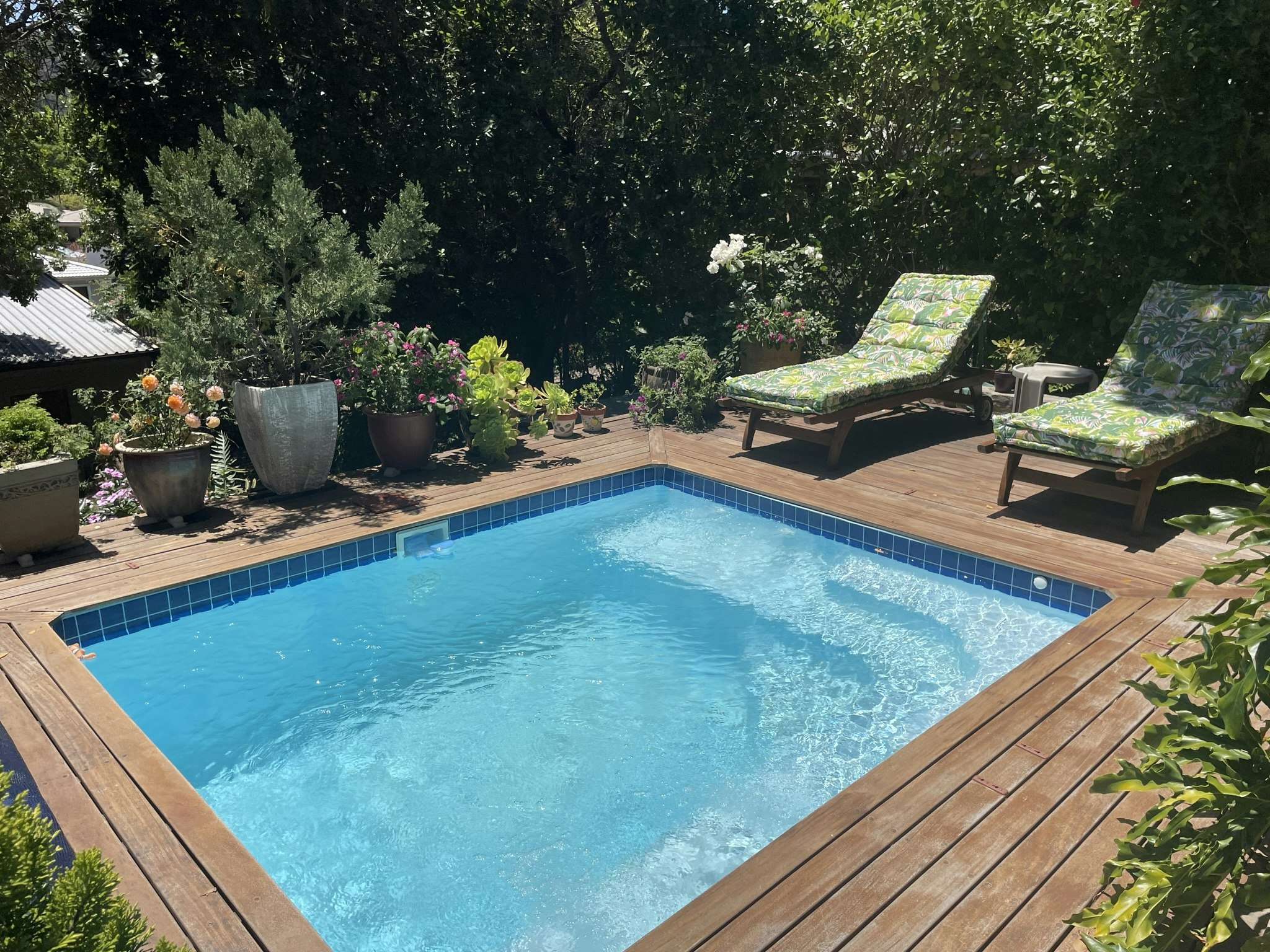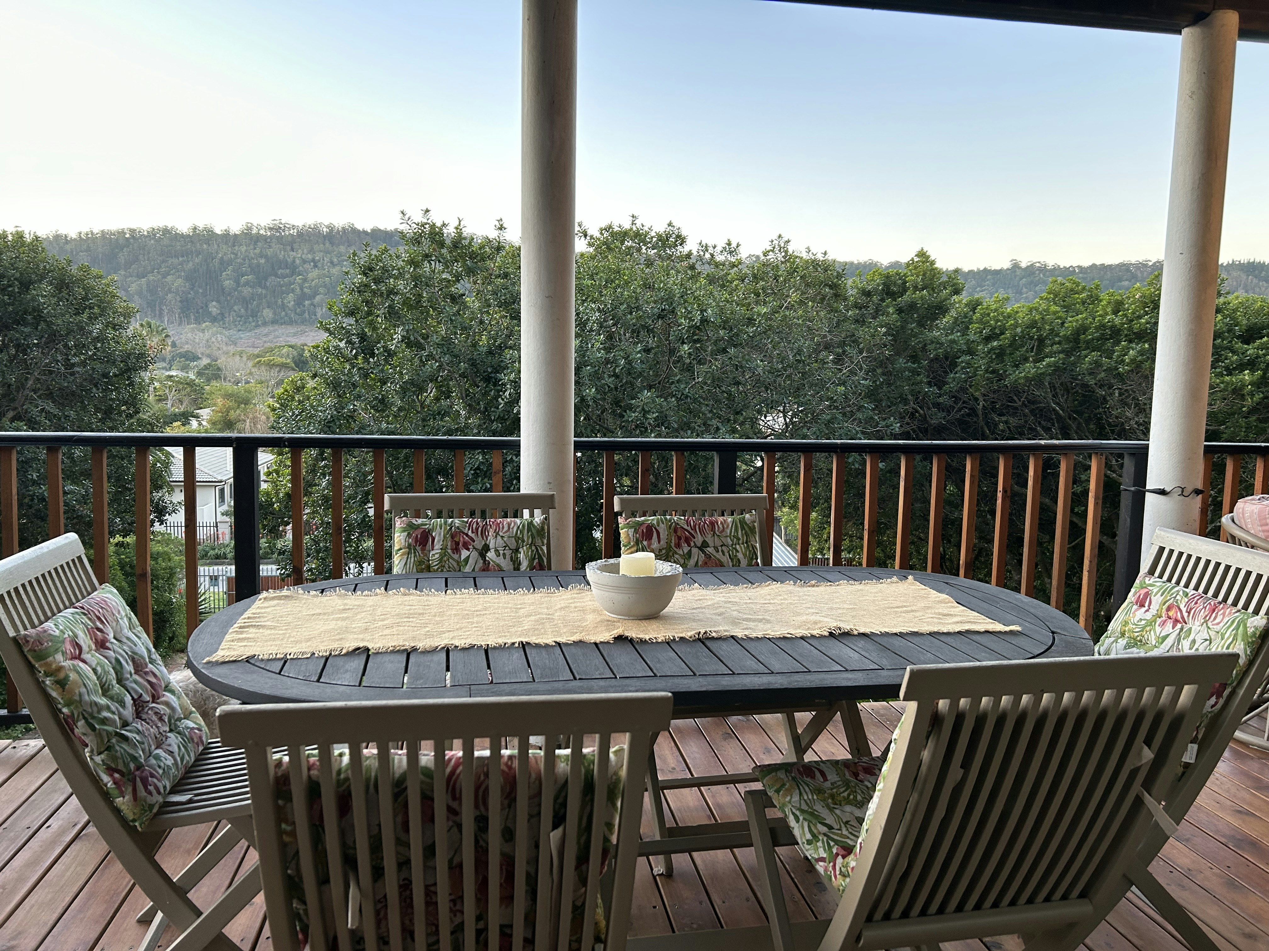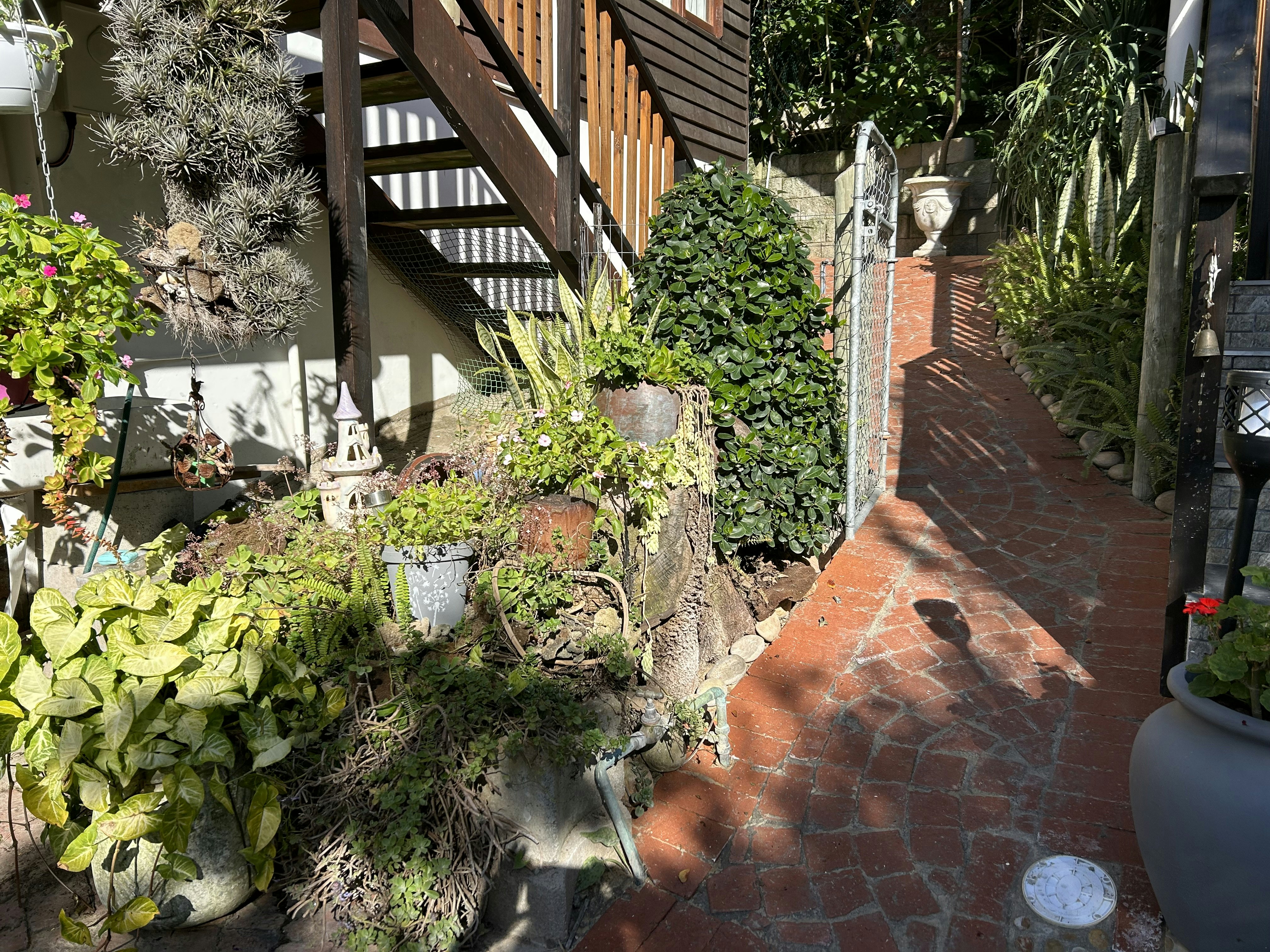 Apartment Downstairs is die laer woonstel in 'n houthuis tussen die bome. Die eenheid het 2 slaapkamers, 2 badkamers, sonkrag en 'n plonspoel met sonstoele op 'n dek. Daar is 9 trappies na die balkon met gemakstoele, 'n etenstafel, stoele en 'n ingeboude braai met 'n uitsig op die lieflike tuin en berge. Daar is veilige parkeerplek vir 2 voertuie agter ’n afstandbeheerde hek.