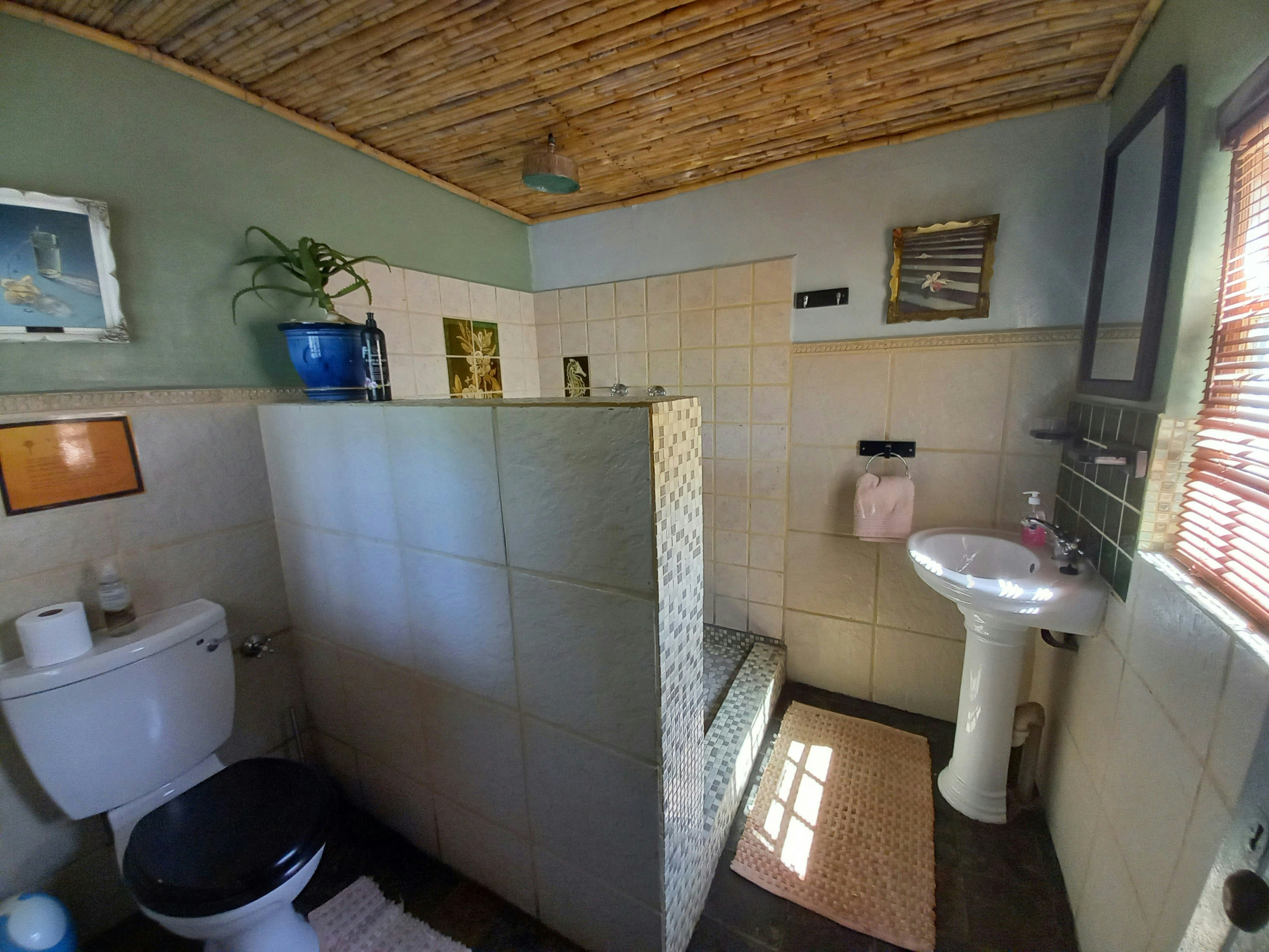 The living area opens onto a covered patio with outdoor seating, a fire pit, portable braai facilities, and a plunge pool. Guests are afforded shaded parking. This unit has a solar backup to run the lights, a plug point, and Wi-Fi during power outages.