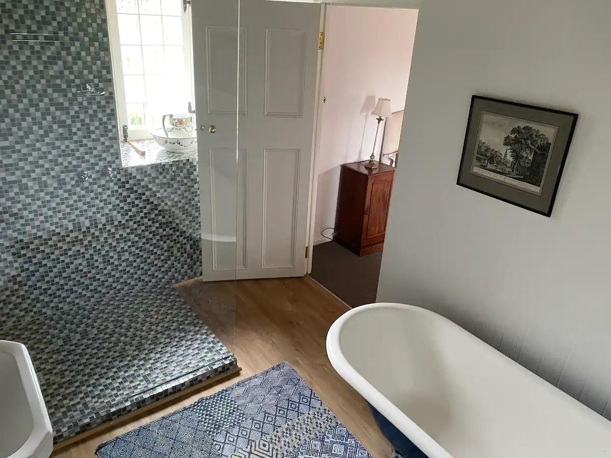 The kitchen is equipped with a fridge-freezer, stove, oven, toaster, basic cutlery, crockery, and tea- and coffee-making facilities.. The downstairs unit with a separate entrance comprises an en-suite bathroom, and a kitchenette.