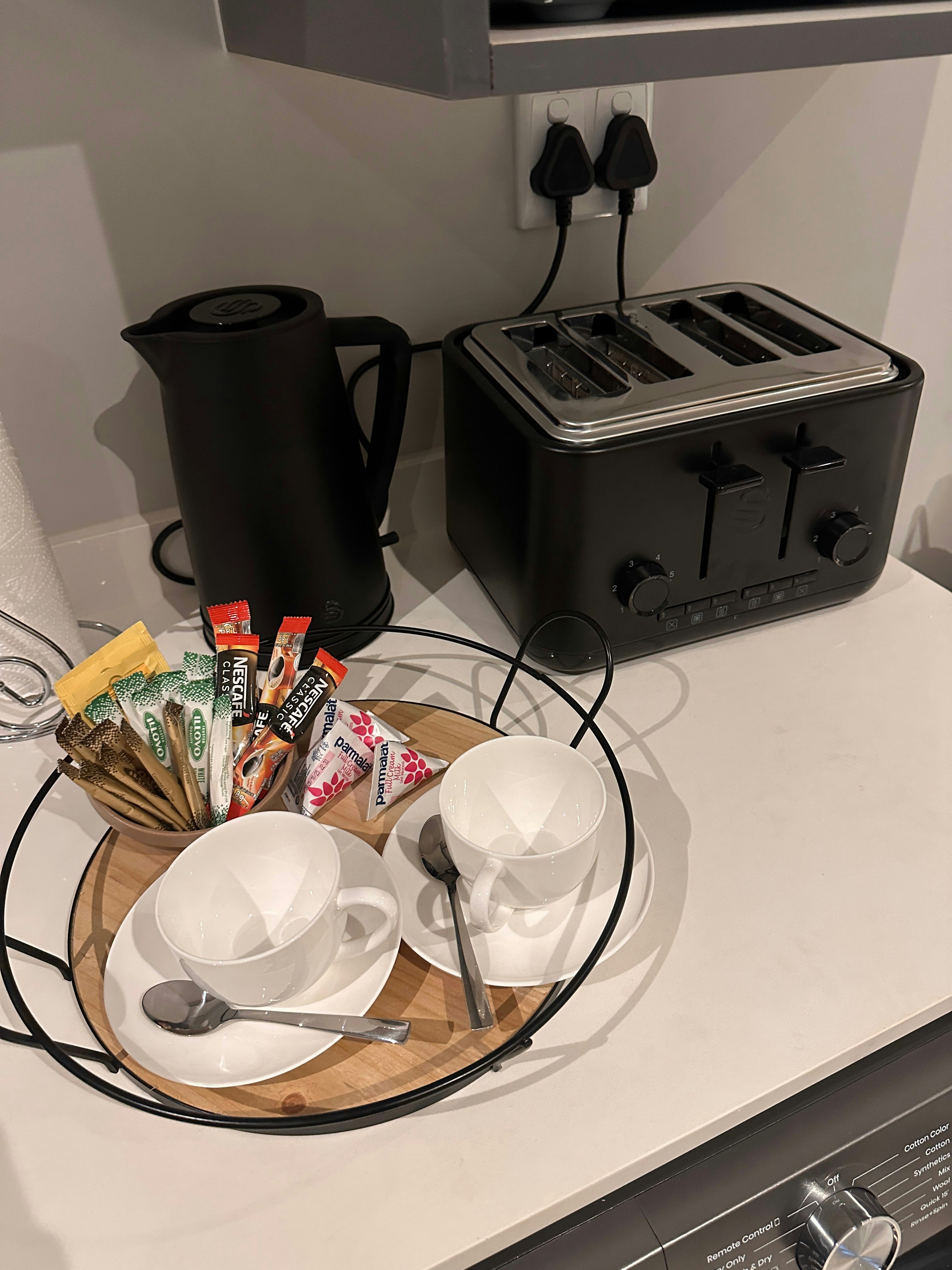 The kitchen is equipped with a gas stove, oven, fridge-freezer, microwave, kettle, toaster, tea and coffee-making facilities and a washing machine. The open-plan living area includes a comfortable couch and a smart TV with streaming services. Furthermore, the apartment has air conditioning and unlimited Wi-Fi.