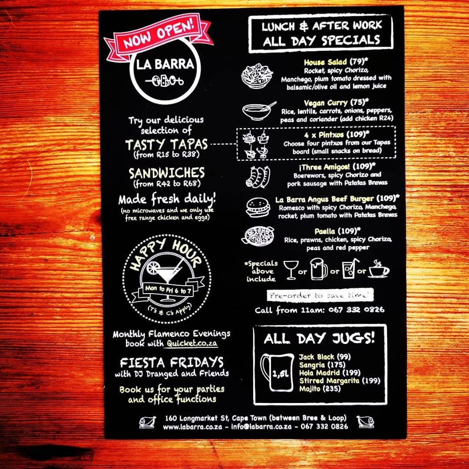 La Barra offers Spanish and South African inspired Tapas and Pintxos at the bar, as well as delicious all-day lunch and dinner meals. Experience something Spanish and distinctly South African in products and ingredients with variations of popular local South African dishes on offer. There is something for everyone to enjoy! A casual, friendly environment and a great place to have lunch or a light meal after work.